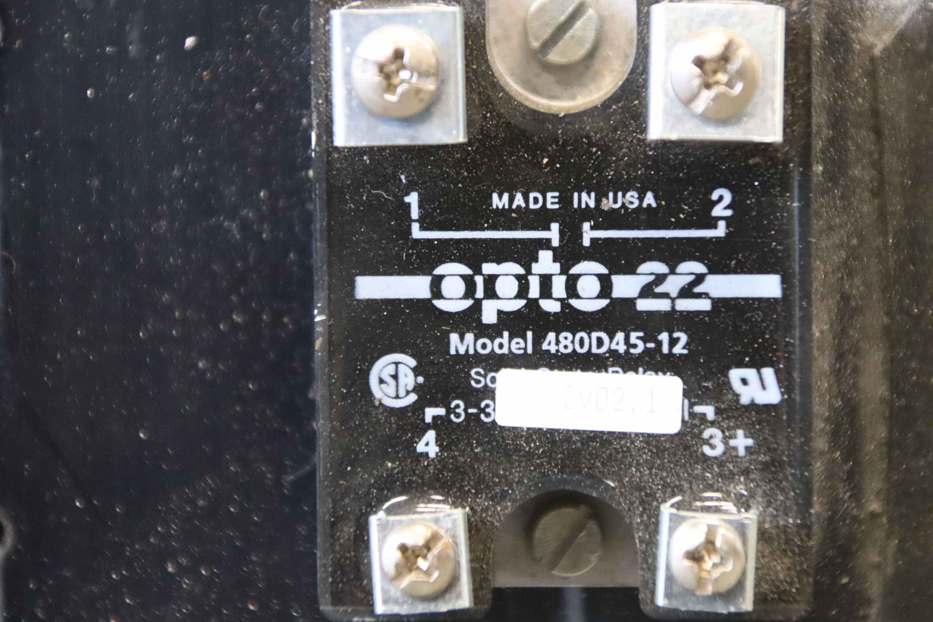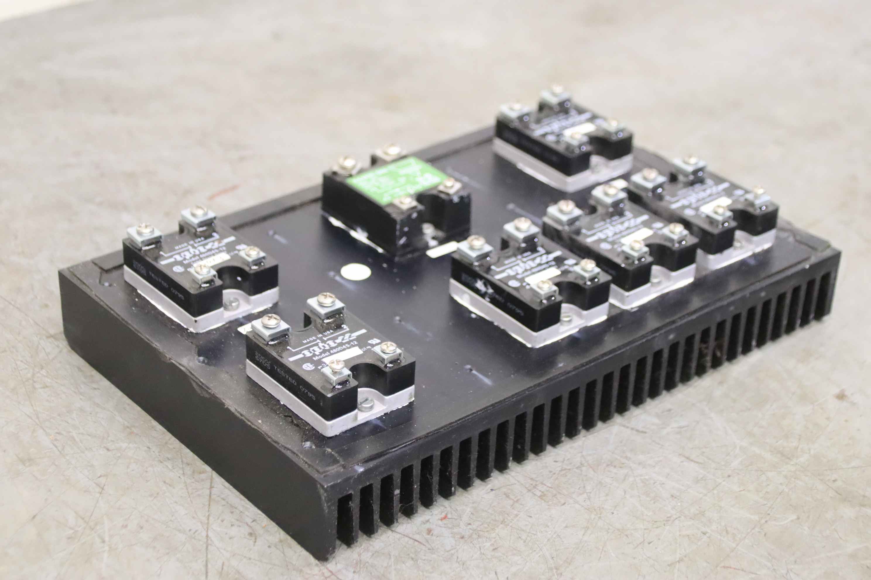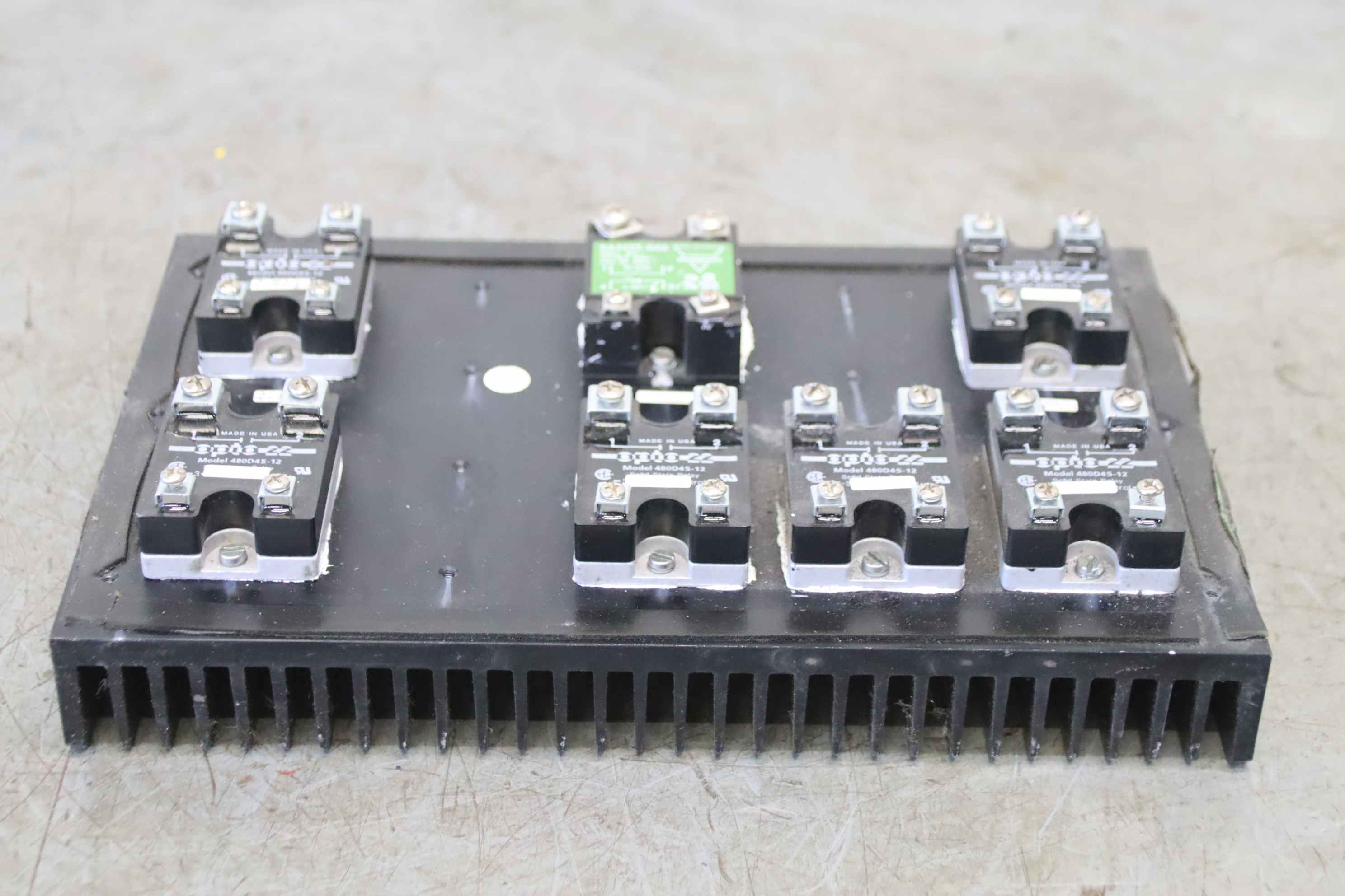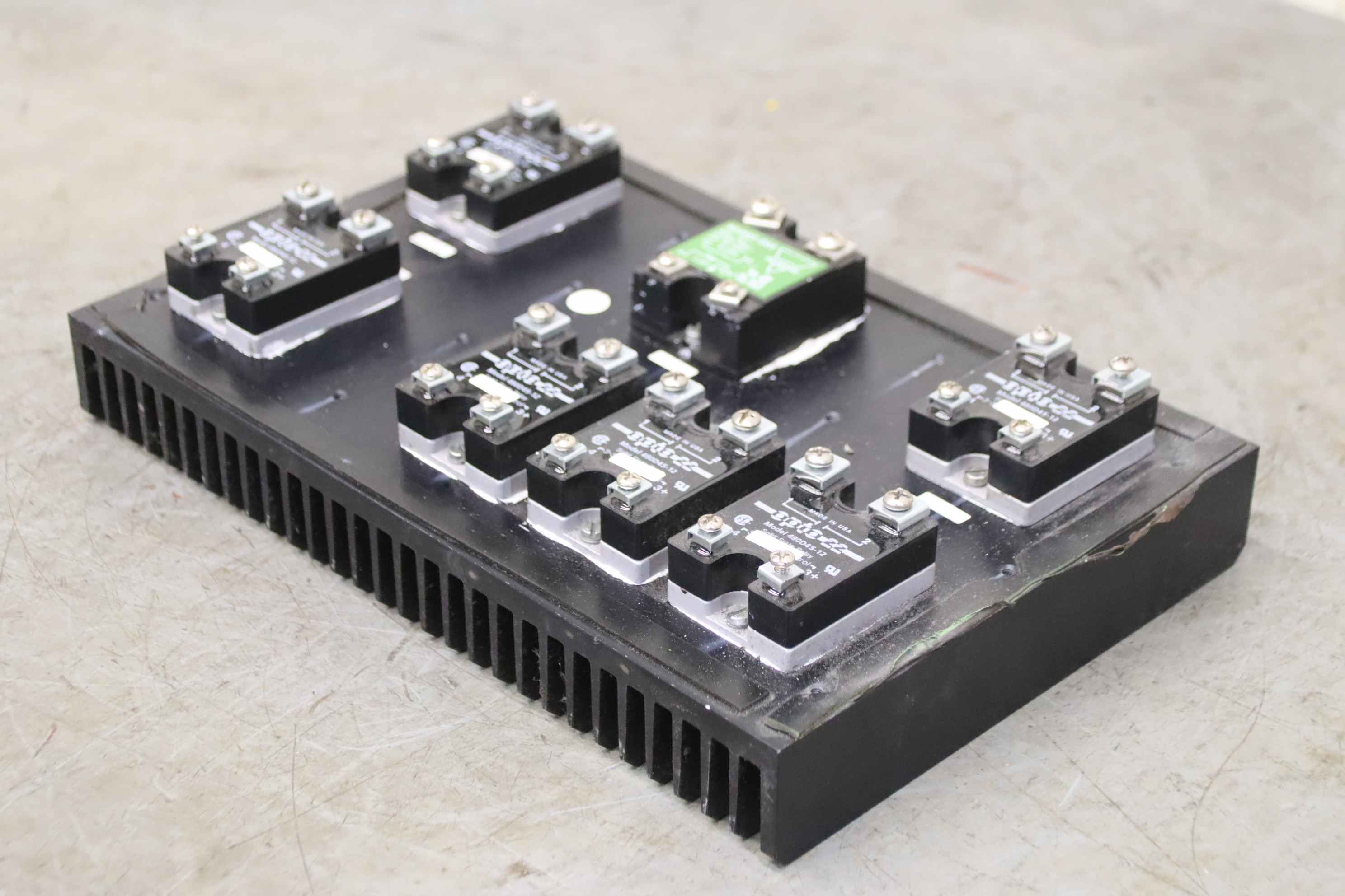Semiconductor relays, switchgear, switching components -Manufacturer: opto 22 electromatic, Semiconductor relays, 7 pieces with heat sink -Type: 6x opto 22 480D45-12 / 1x electromatic RA4425-D08 -Price/Sale: complete -Dimensions: 300/200/H70 mm -Weight: 3.4 kg