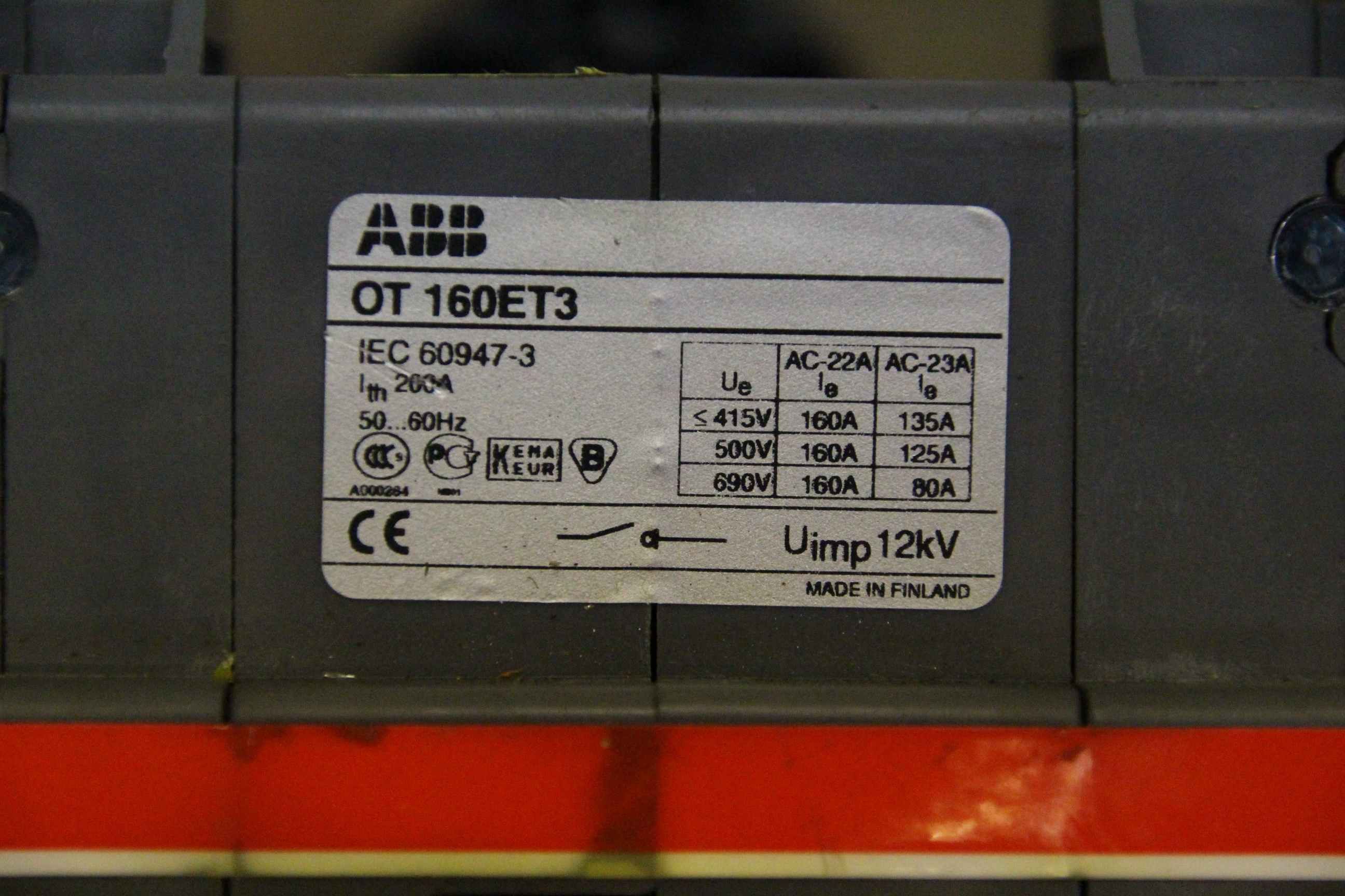 Auxiliary switch, circuit breaker, fuse, circuit breaker, circuit breaker, switch disconnector, terminal plate, switch disconnector -Manufacturer: ABB -Type: OT 160E3 with rotary switch -Dimensions: 125/160/H155 mm -Weight: 1.6 kg