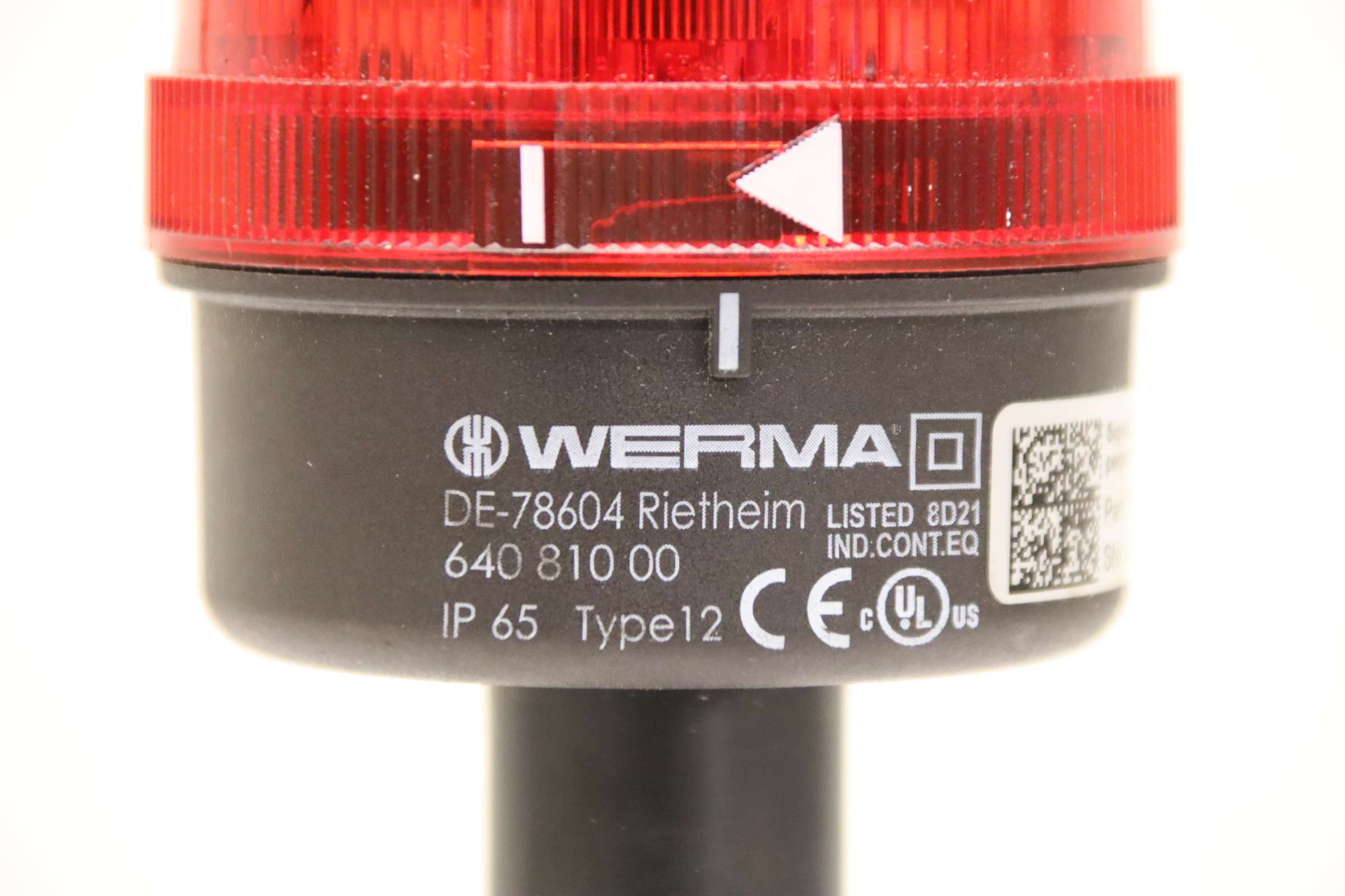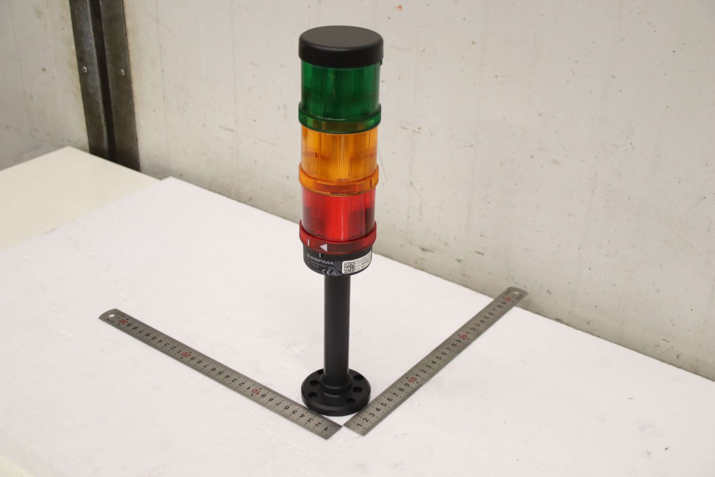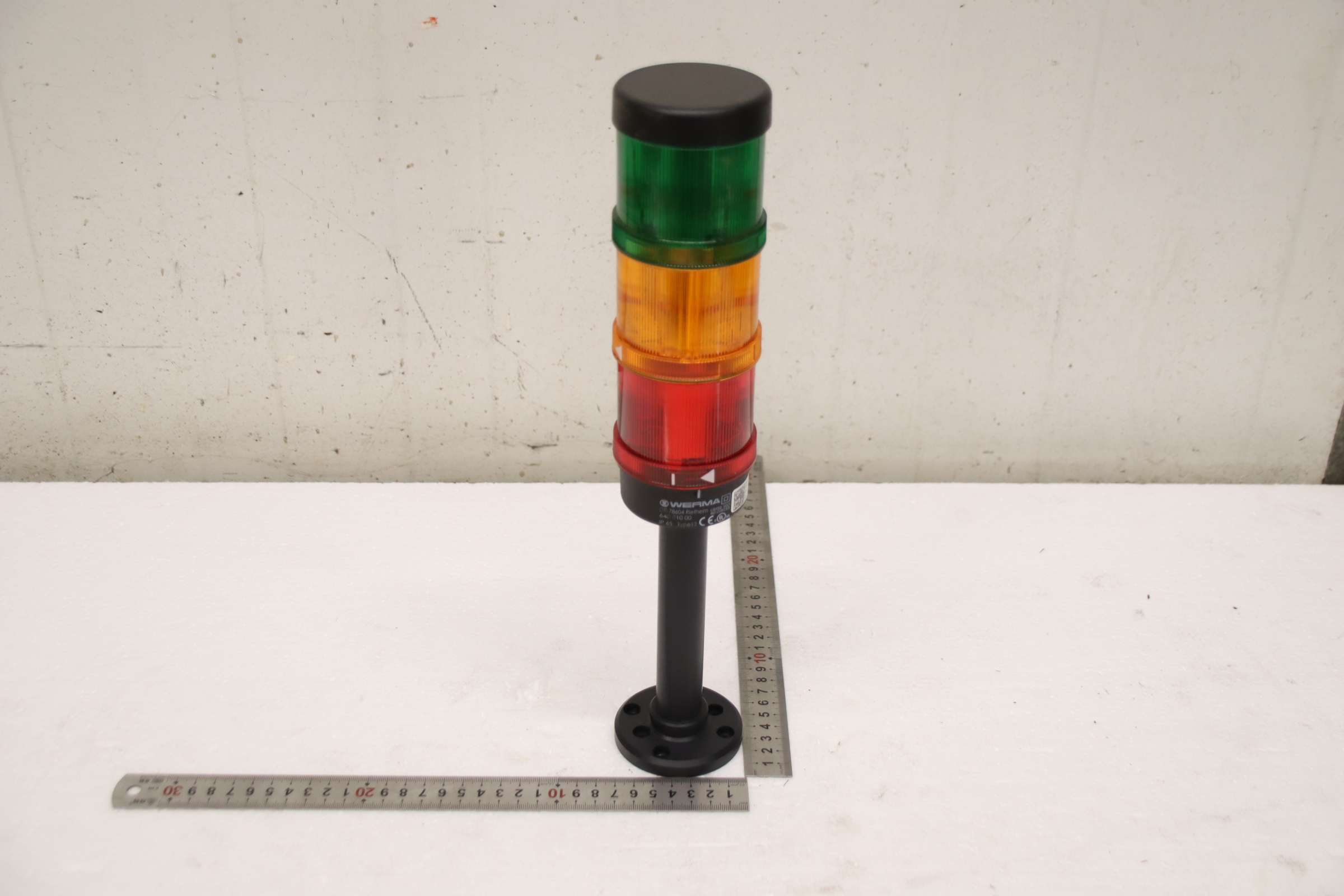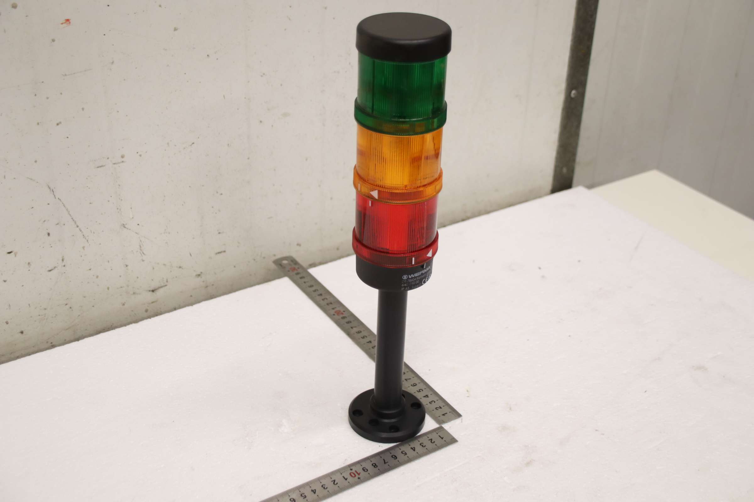 Signal towers, signal lights, signal lamps, indicator lights, signal light columns, light signal alarm systems -Manufacturer: Werma, 3-stage signal tower -Type: Type 12 -Item No.: 640 810 00 -Voltage: 24 V -Number: 1x signal tower available -Dimensions: Ø 70 x 365 mm -Weight: 0.4 kg