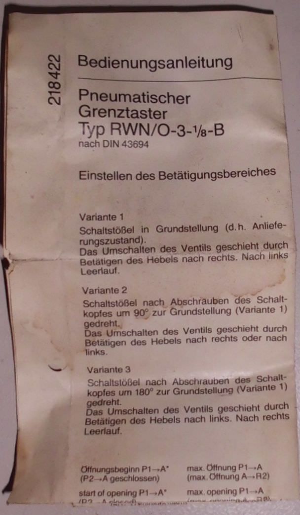 Pneumatic limit switch, push button, limit switch -Type: RWN/0-3-1/8B Price: per piece -Number: 14 available -Weight: 0.5 kg/piece