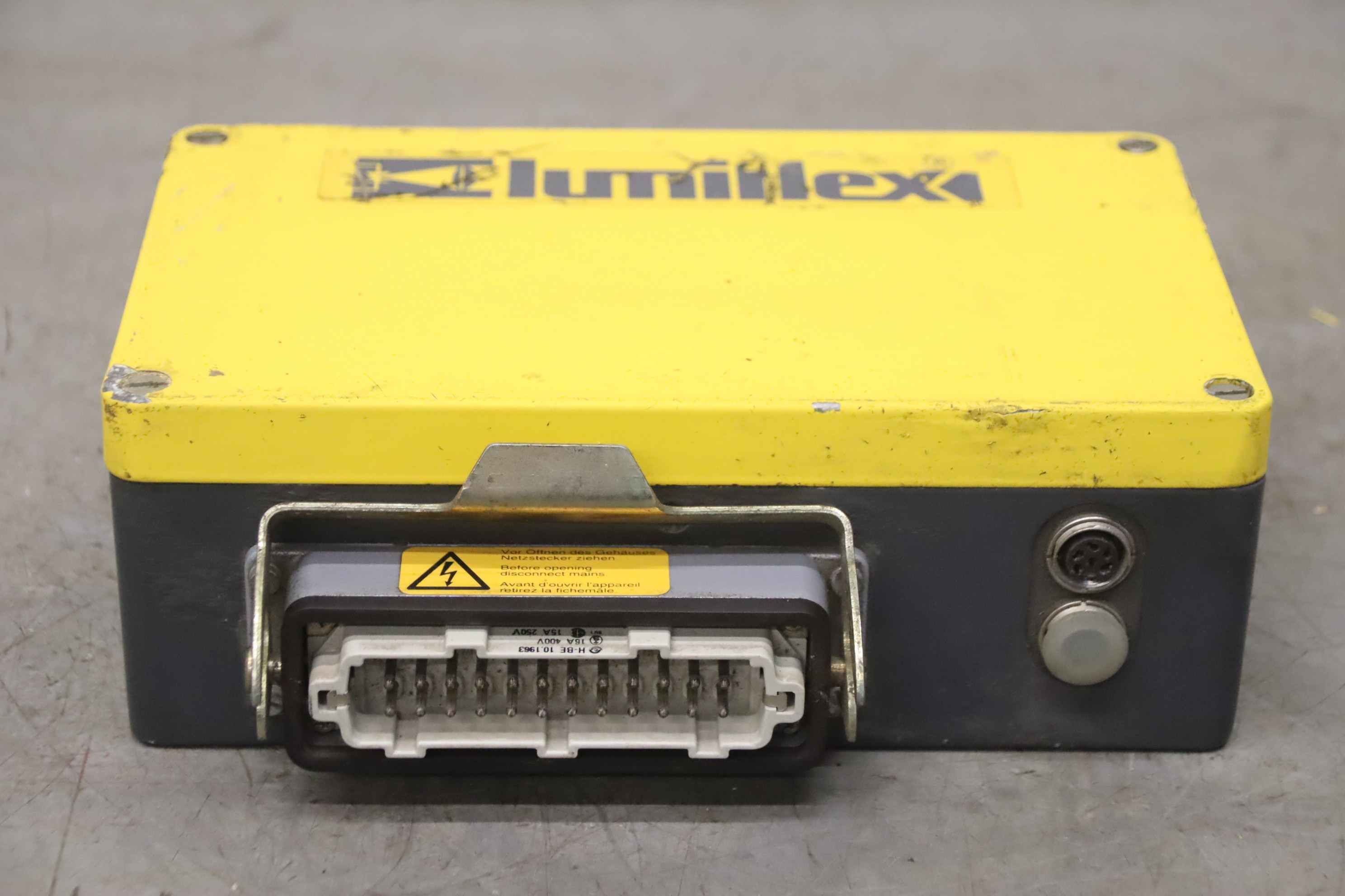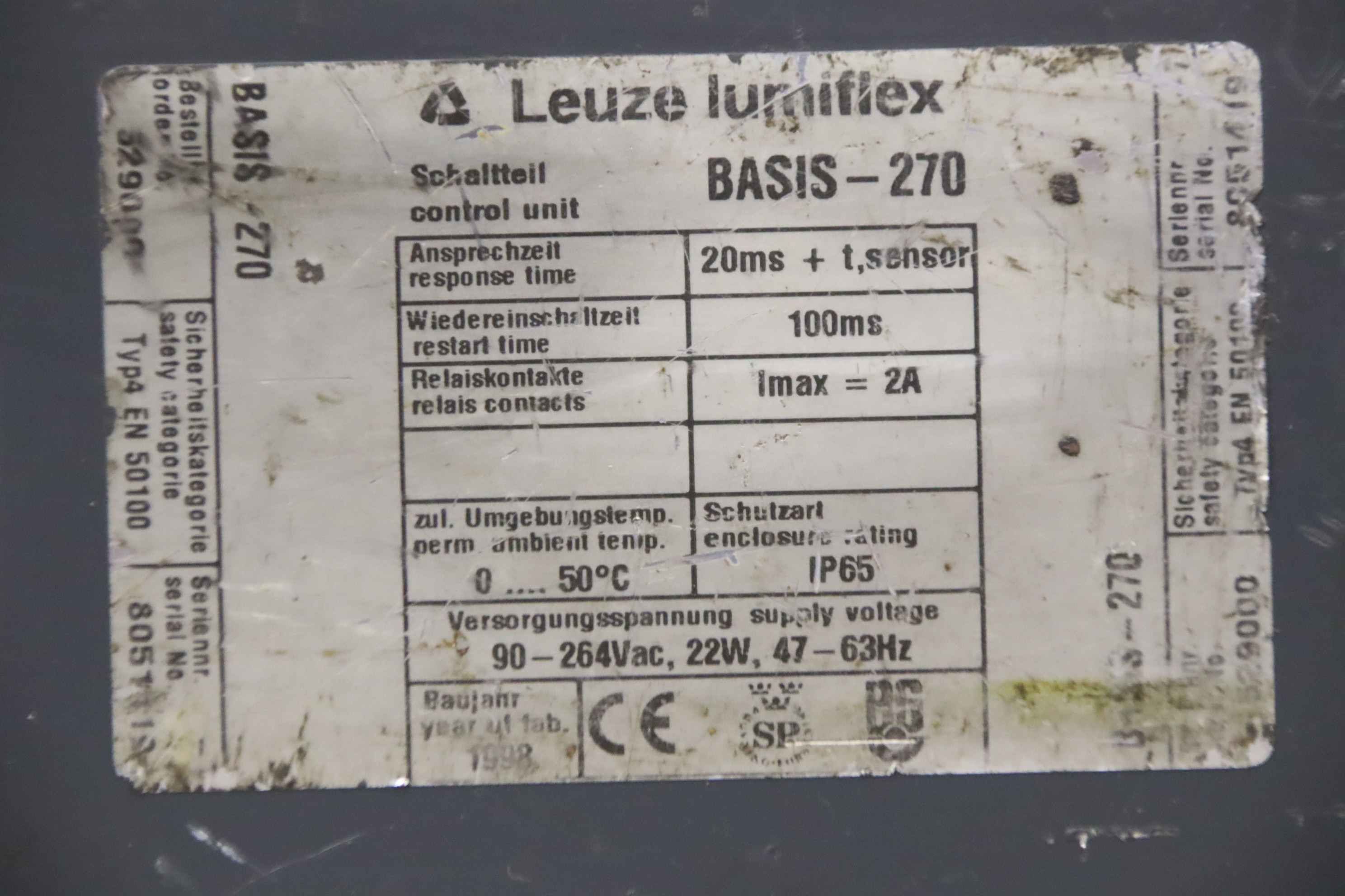 Light barrier, safety light curtain, switching part, control unit, control box-Manufacturer: Leuze lumiflex, switching part control unit Basis-270-Voltage: 90-264Vac / 22W, 47-63Hz-Quantity: 4x switching part available-Price per piece-Dimensions: 260/210/H90 mm-Weight: 3.4 kg/pc.