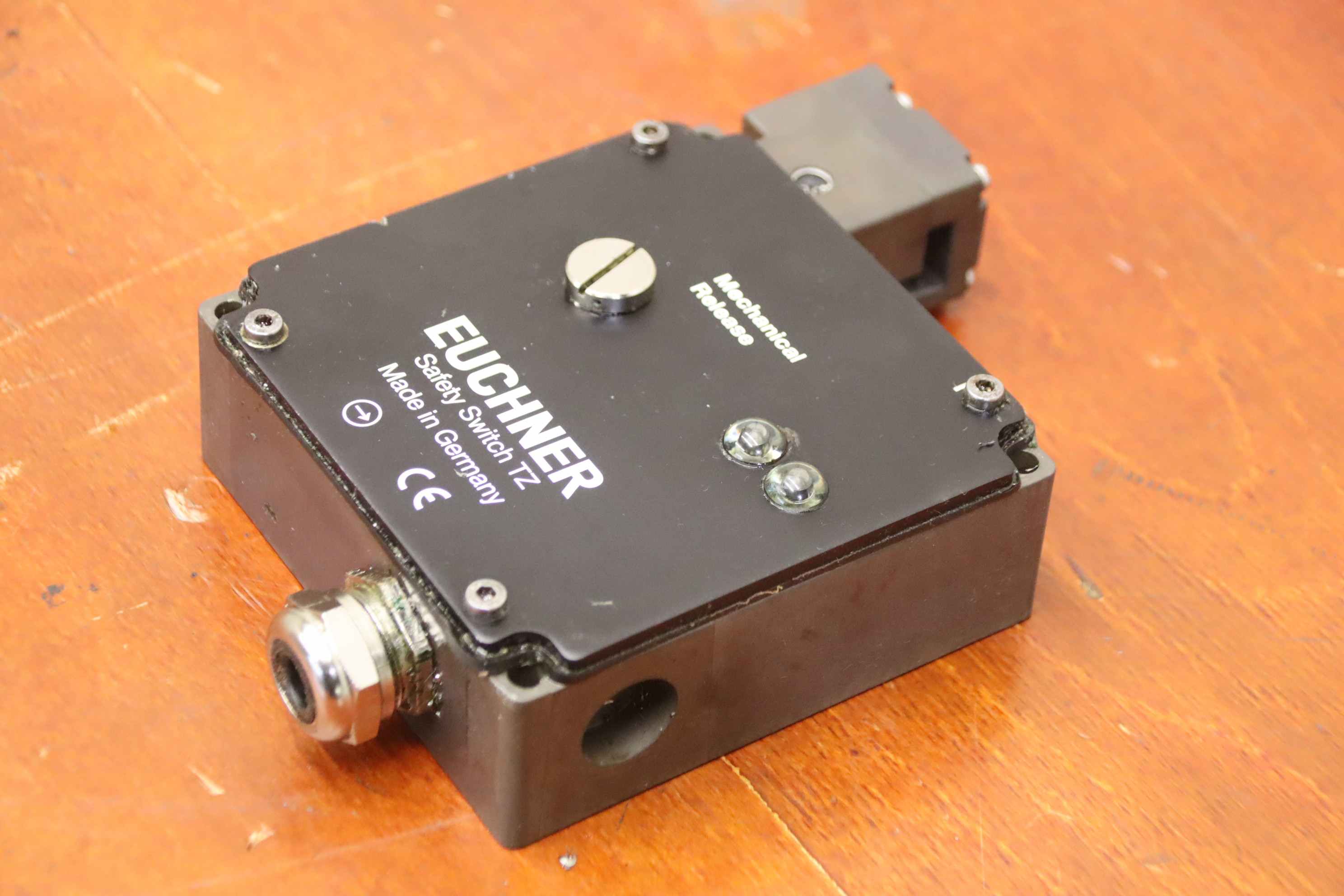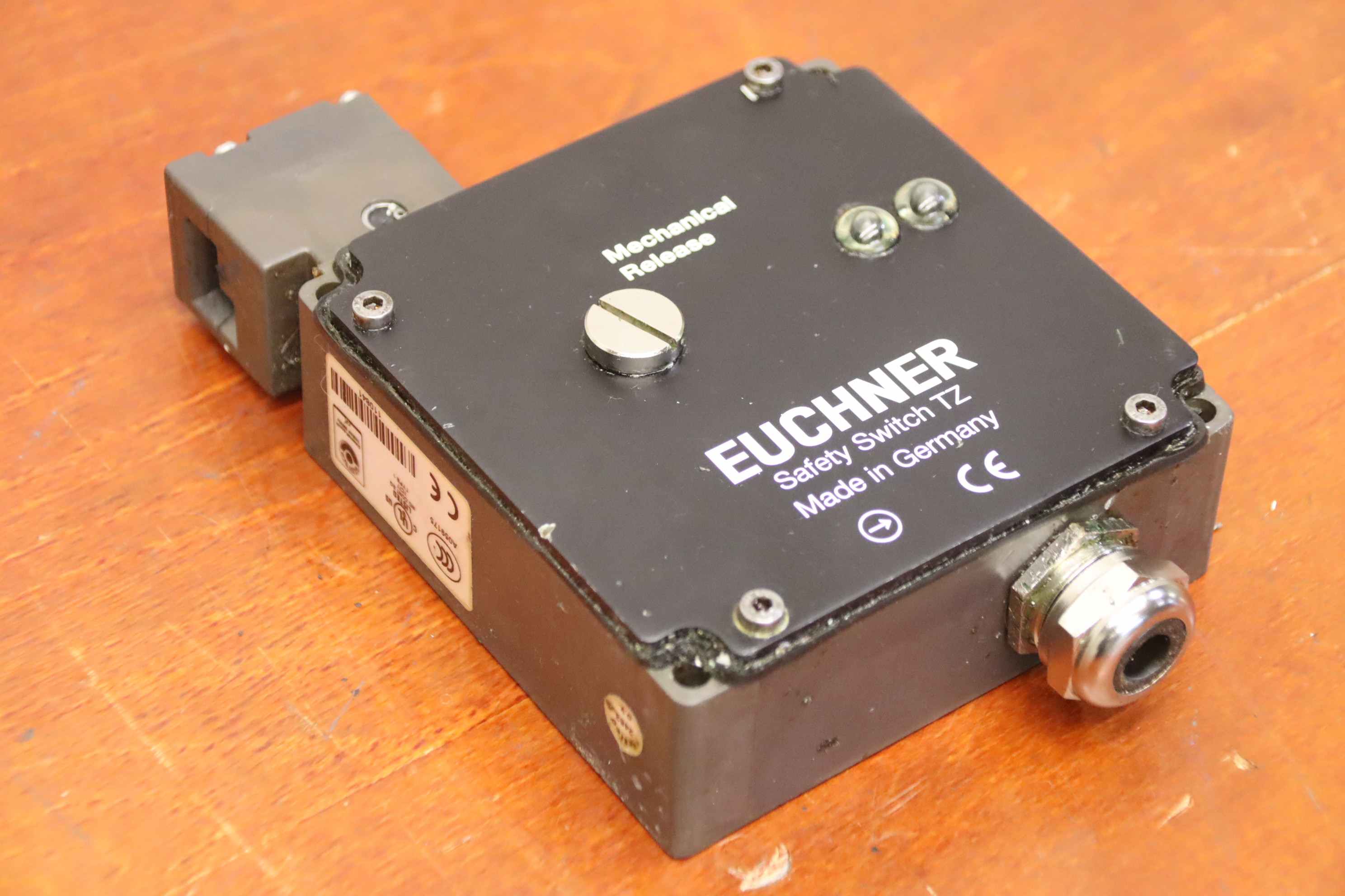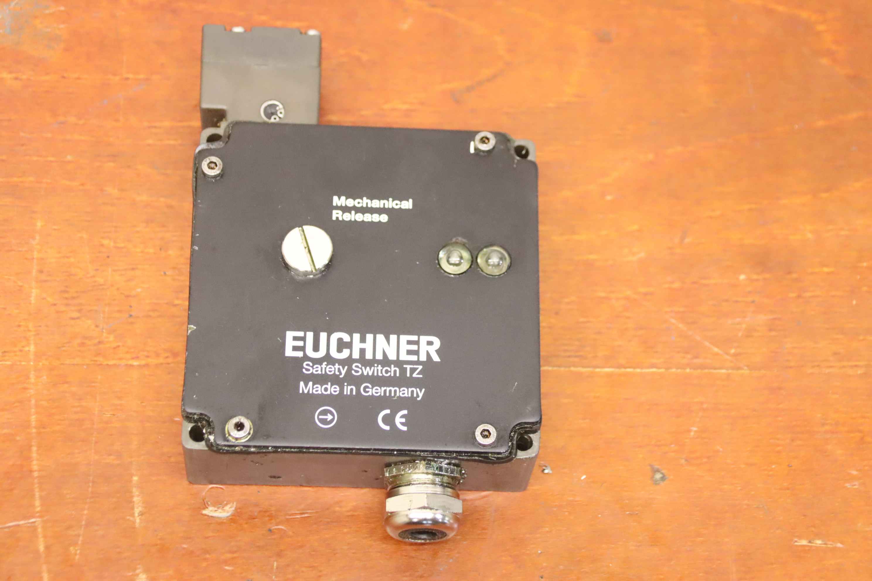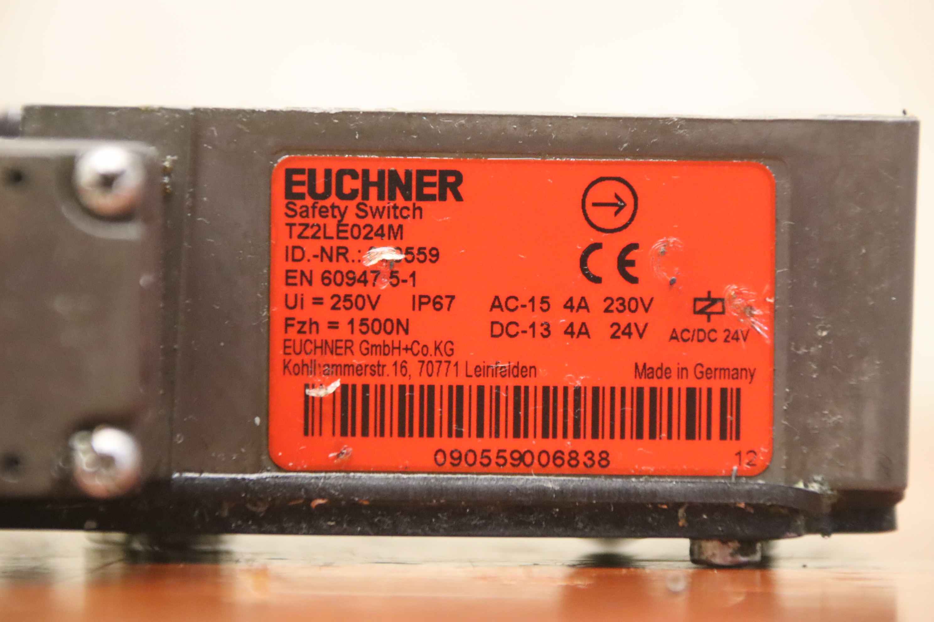 Safety switch, safety switch, protective grid switch -Manufacturer: Euchner, Safety switch from CNC milling machine Mikron UME 600 -Type: TZ2LEO24M ID No.: 090559 Technical data: see photo of the nameplate Quantity: 1 piece available -Dimensions: 170/110/40 mm -Weight: 1.1 kg