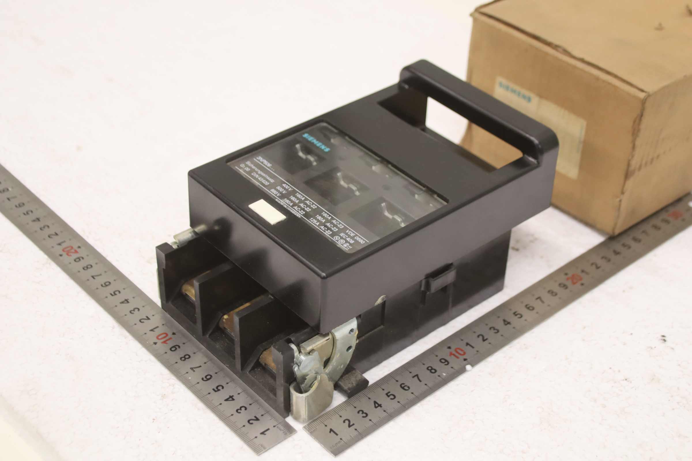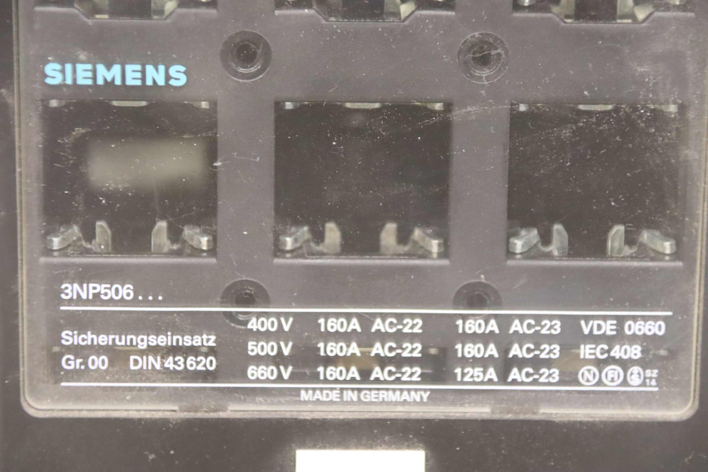 Auxiliary circuit breaker, circuit breaker, miniature circuit breaker, load break switch, load disconnector, power switch, power disconnector, auxiliary switch, main switch, disconnector, fuse-switch disconnector -Manufacturer: Siemens, fuse switch disconnector 160 A, unused, original packaging -Type: 3NP5060-0CA00 -Quantity: 1x load break switch available -Dimensions: 200/140/H100 mm -Weight: 1.6 kg
