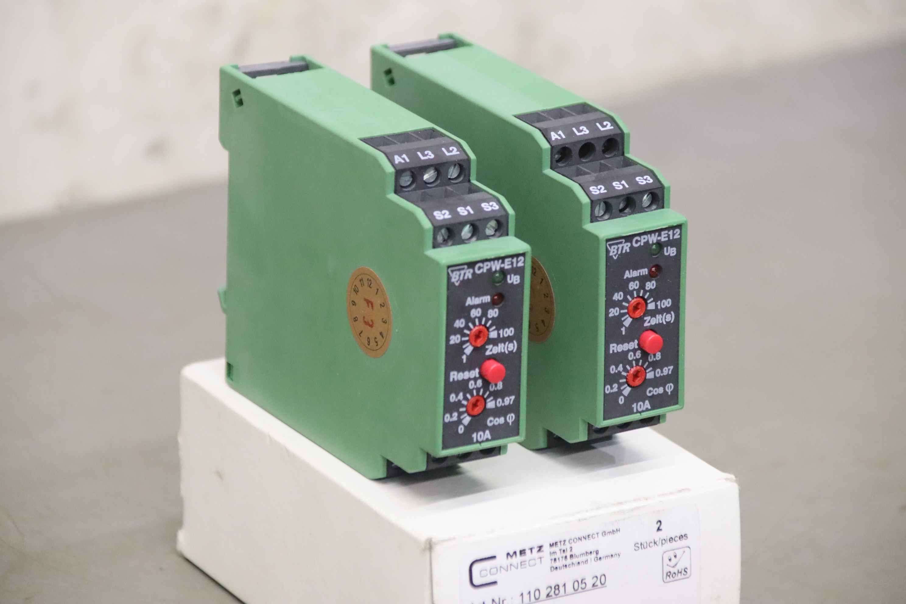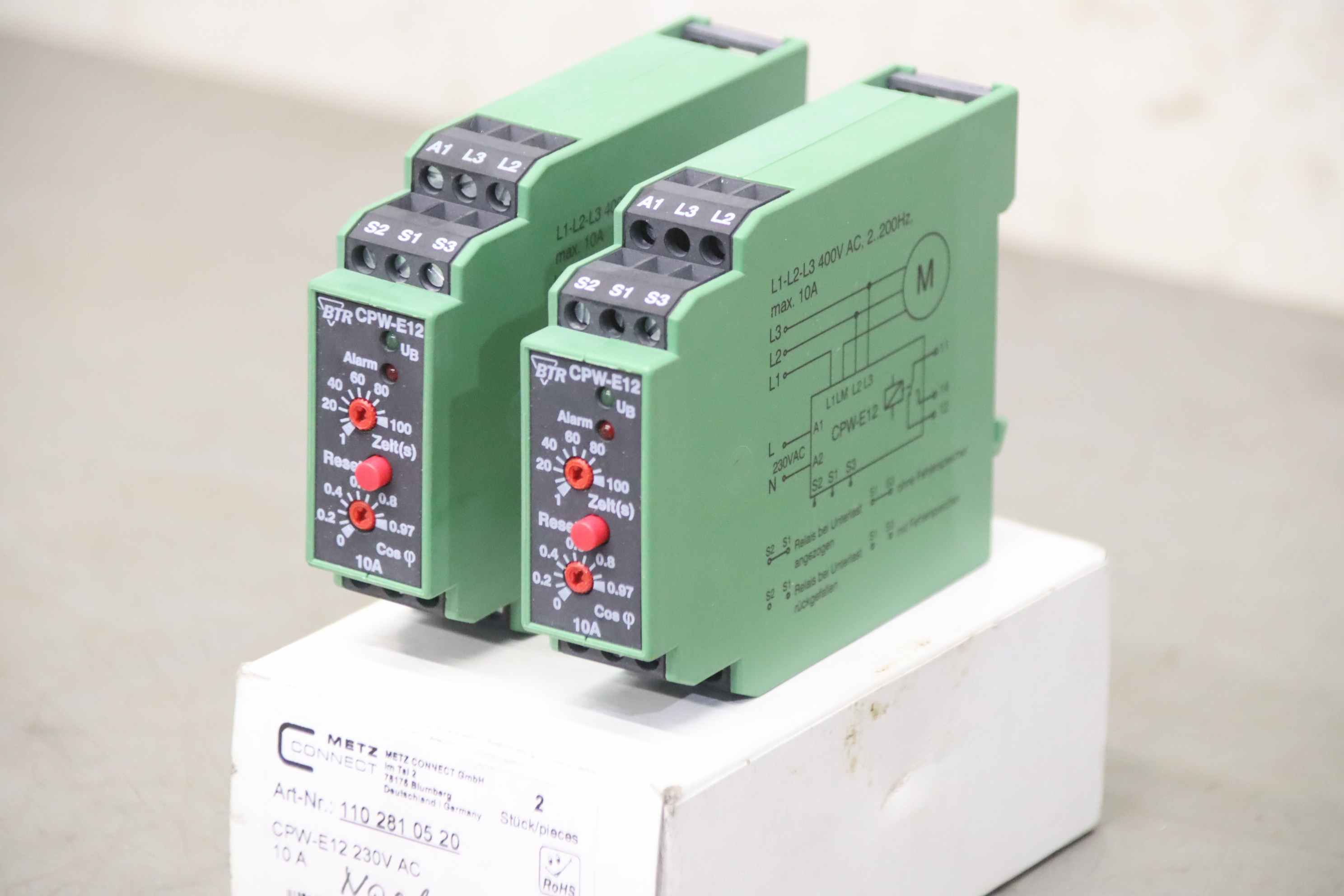 Motor protection relay, relay, heating current monitoring, preheating for generators, contactor, semiconductor contactor, contactor, motor protection, monitoring relay-Manufacturer: BTR, motor protection relay type CPW-E12 2 pieces ovp-Item no.: 110 281 05 20-Voltage: 230V AC-Price/Delivery : complete-Dimensions packaging: 120/80/H50 mm-Weight: 0.3 kg