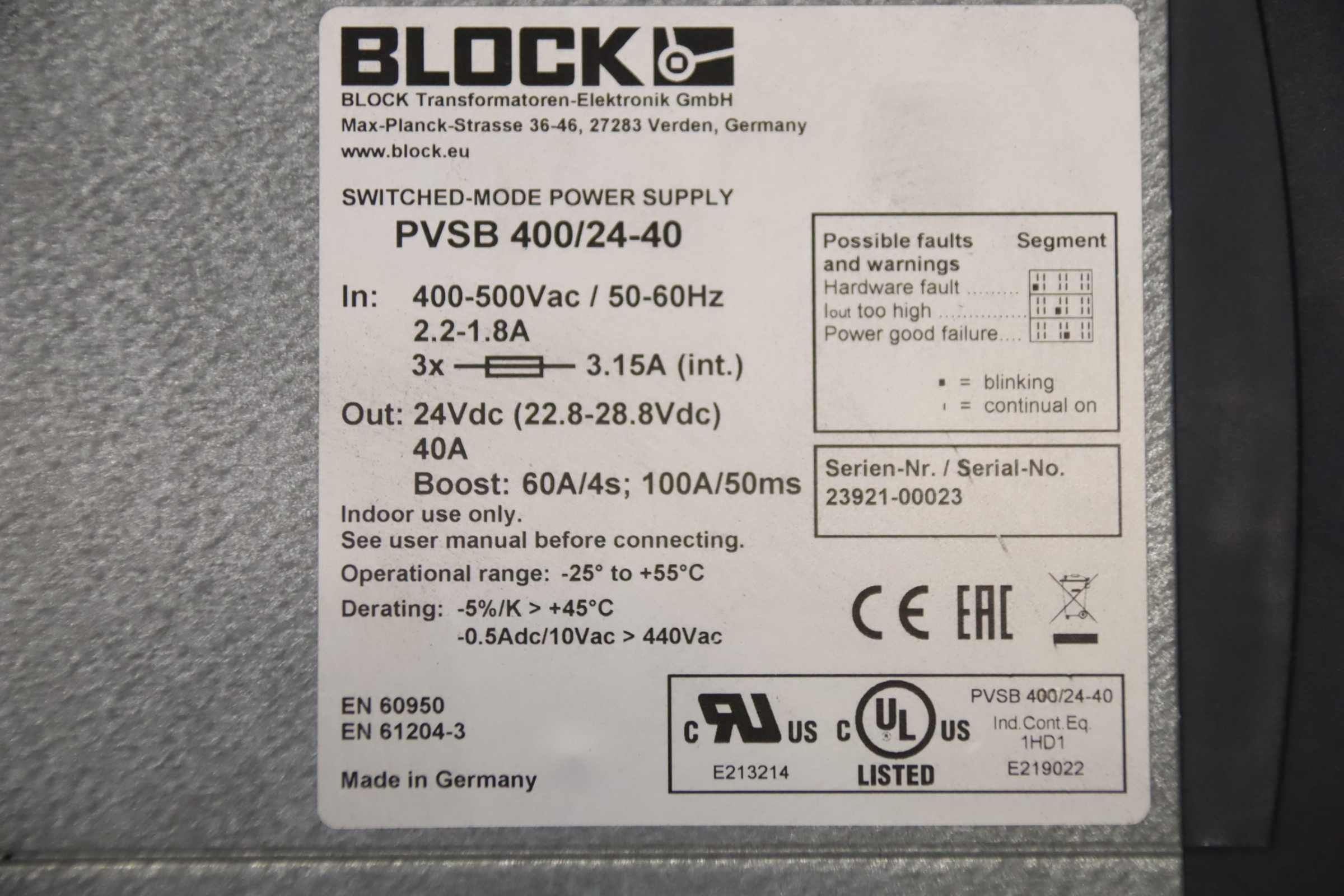Power supply unit, DIN rail power supply unit, switching power supply unit -Manufacturer: Block, DIN rail power supply -Type: PVSB 400/24-40 -Input: 400-500 VAC/50-60 Hz/2.2-1.8 A -Output: 24 V 40 A -Dimensions: 205/130/H130 mm -Weight: 3.1 kg
