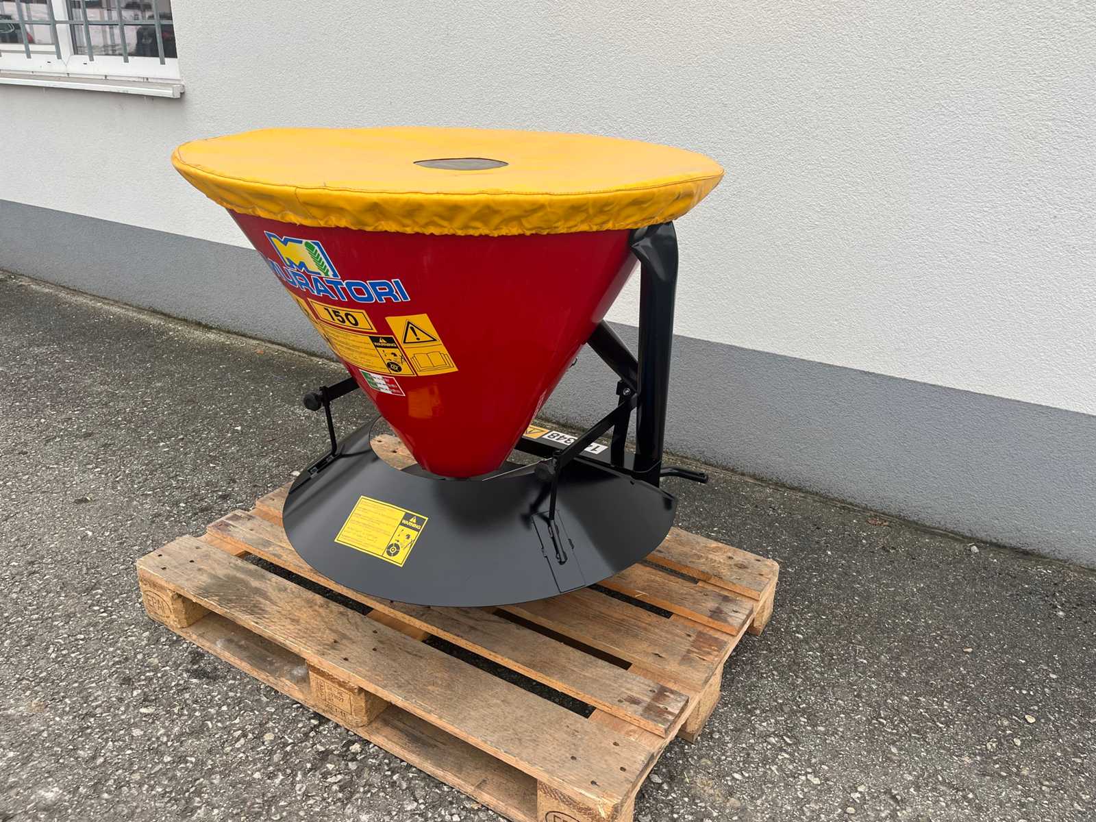 Fertiliser spreader with cone-shaped steel hopper and spreading disc for spreading fertiliser (as granules or powder). With the appropriate accessories, this agricultural tool can also be used to spread salt or sand on snowy or icy roads. Suitable for tractors up to 50 hp. 150L Tank All painted parts are first subjected to the cataphoresis process. STANDARD EQUIPMENT: • Adjustment of the spreading quantity, spreading direction and spreading density, • Galvanized spreading discs with V2A spreading wings and dosing disc, • Permanently installed agitator, Auction-ID: A1-44779-58