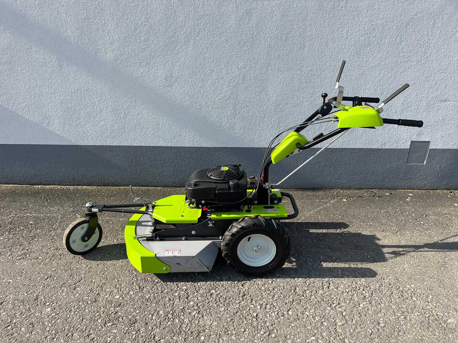 Robust tall grass mower for meadows, embankments and uneven terrain. Hydrostatic drive and strong tractor tyres make it ideal for tall grass and undergrowth. Technical data: Gasoline engine Cutting width: 62 cm Cutting height: 5 – 11 cm infinitely adjustable Drive: hydrostatic drive, 2-wheel drive Speed: infinitely variable up to approx. 4.7–6 km/h Mowing system: rotating mulching blade, rear discharge Weight: approx. 98 kg Ideal for meadows, orchards, hillsides and uneven terrain. Auction-ID: A1-44779-8