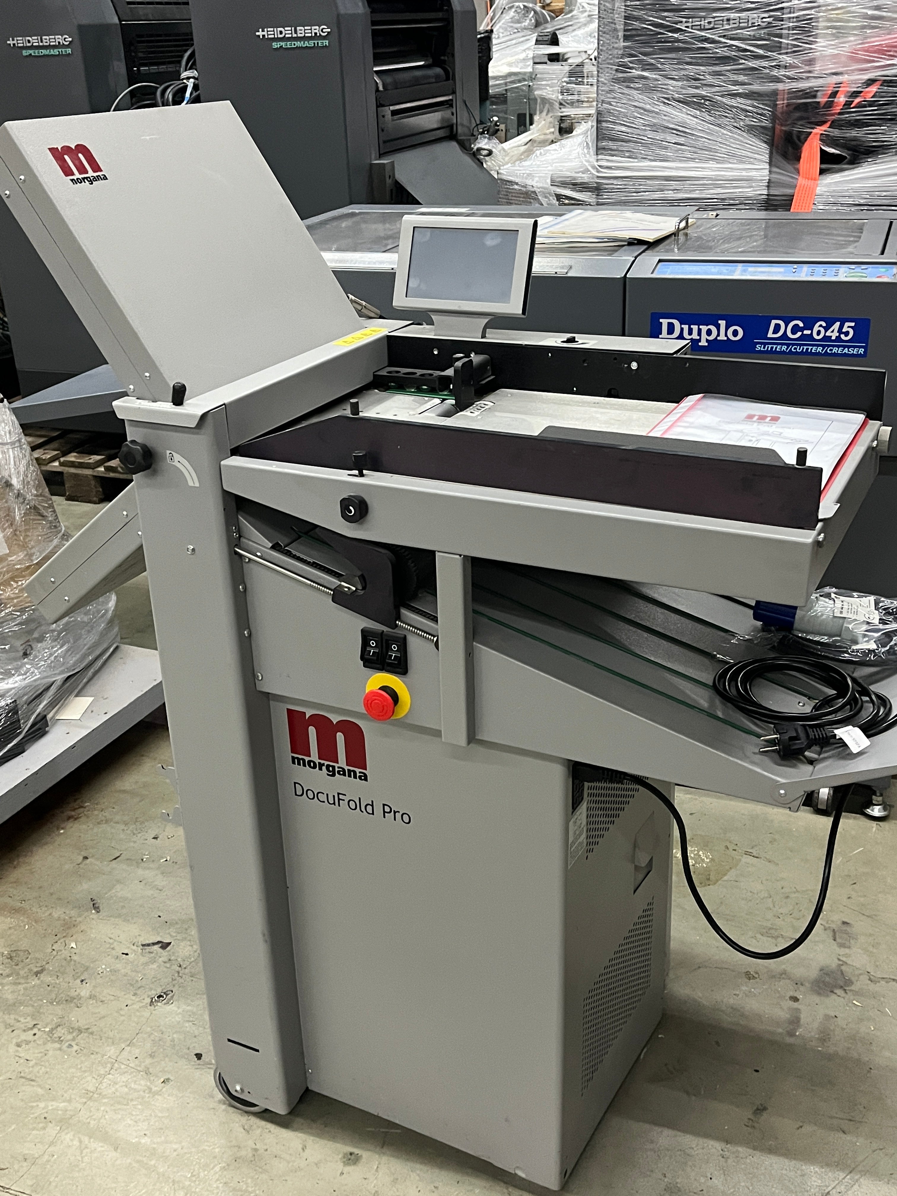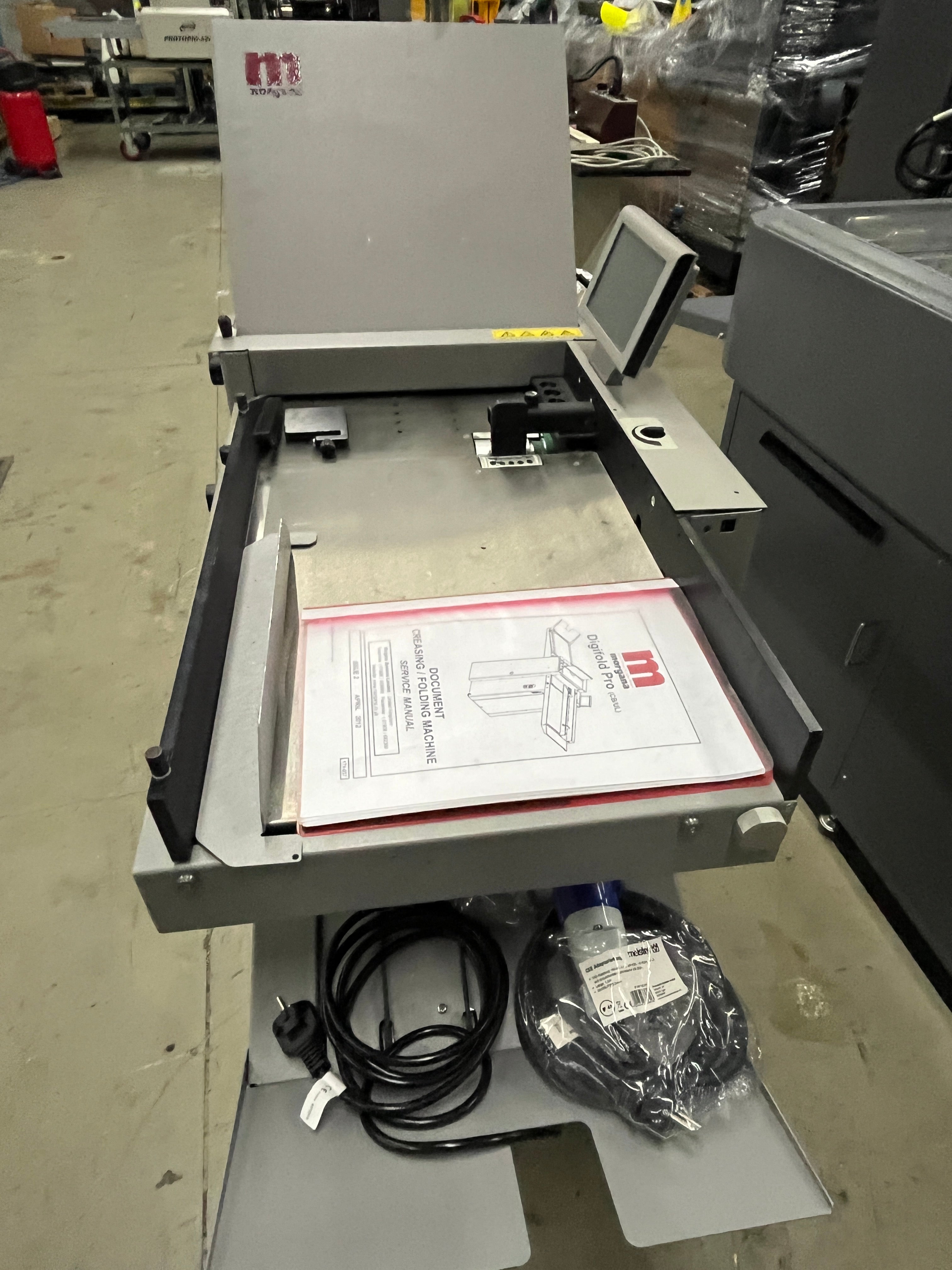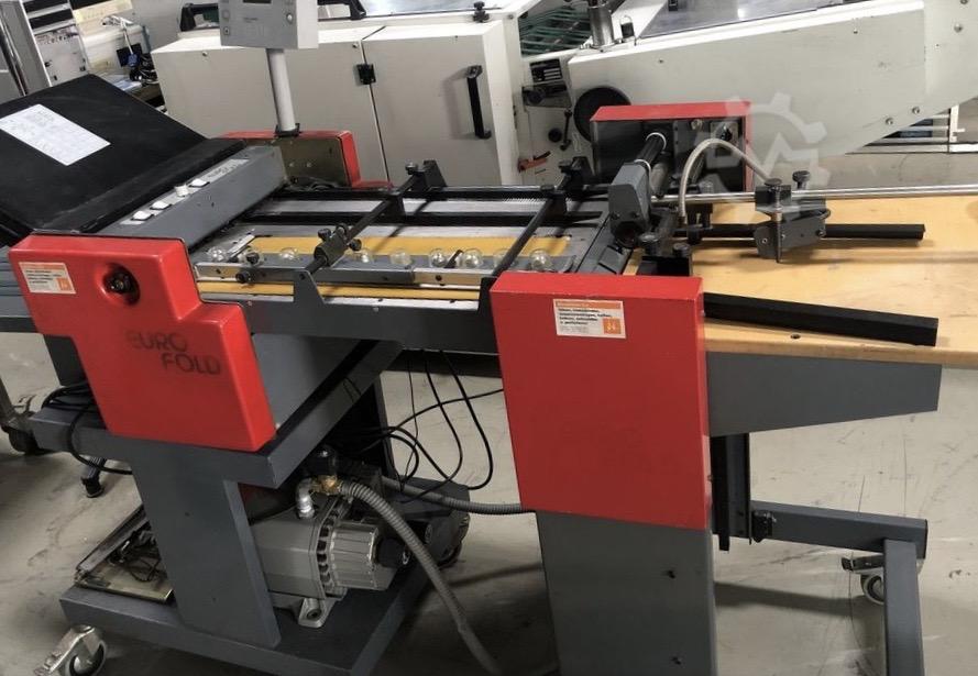 Eurofold 235 ( Swiss Multigraf AG ) With Suction feed, 2 folding plates, 500 sheet feed table Model: 235 Year: 2009 -Suction Feeder -Folding unit 235 with 2 Buckles 35cm all standard folds (Z, C, Half, twice in half) -Counter Forward: EF-2000 -Stream delivery -Vacuum compressor Becker Compact design, machine mounted on a table with wheels Machine is equipped with a creasing and perforating module. Paper size min: 90 x 120 mm Paper size max: 350 x 650 mm GSM: 40 - 240 g/m² Speed: Upto 30.000 Sheets/hour Folding length min: 20 mm Folding length max: 425 mm Power Req. 220 / 240V Frequenz: 50HZ Voltage: max. 16 Amp.