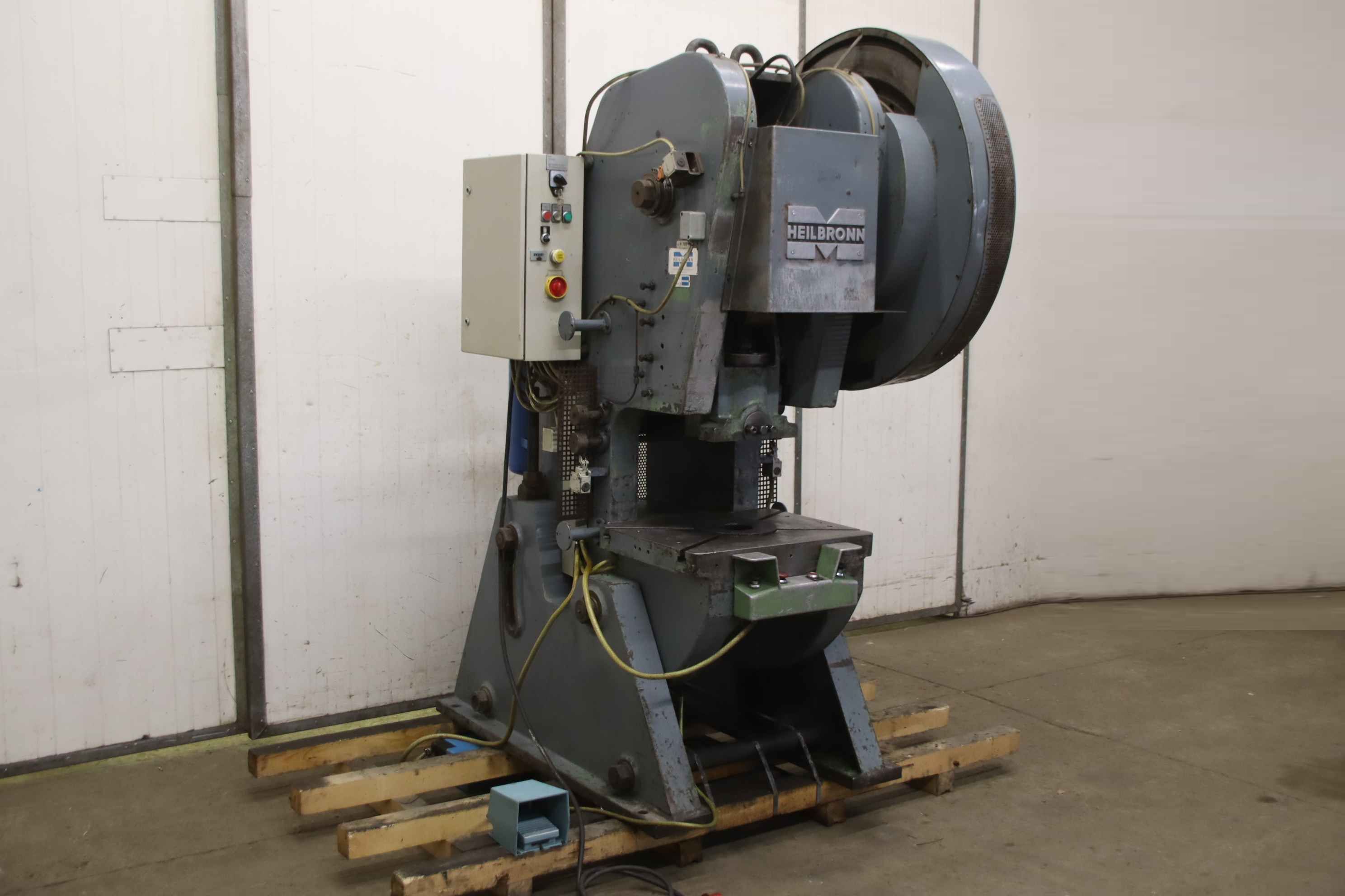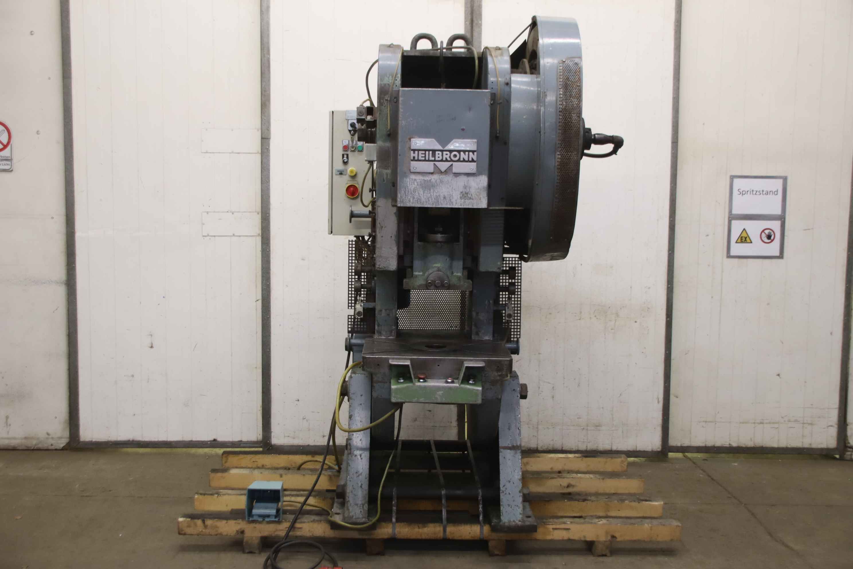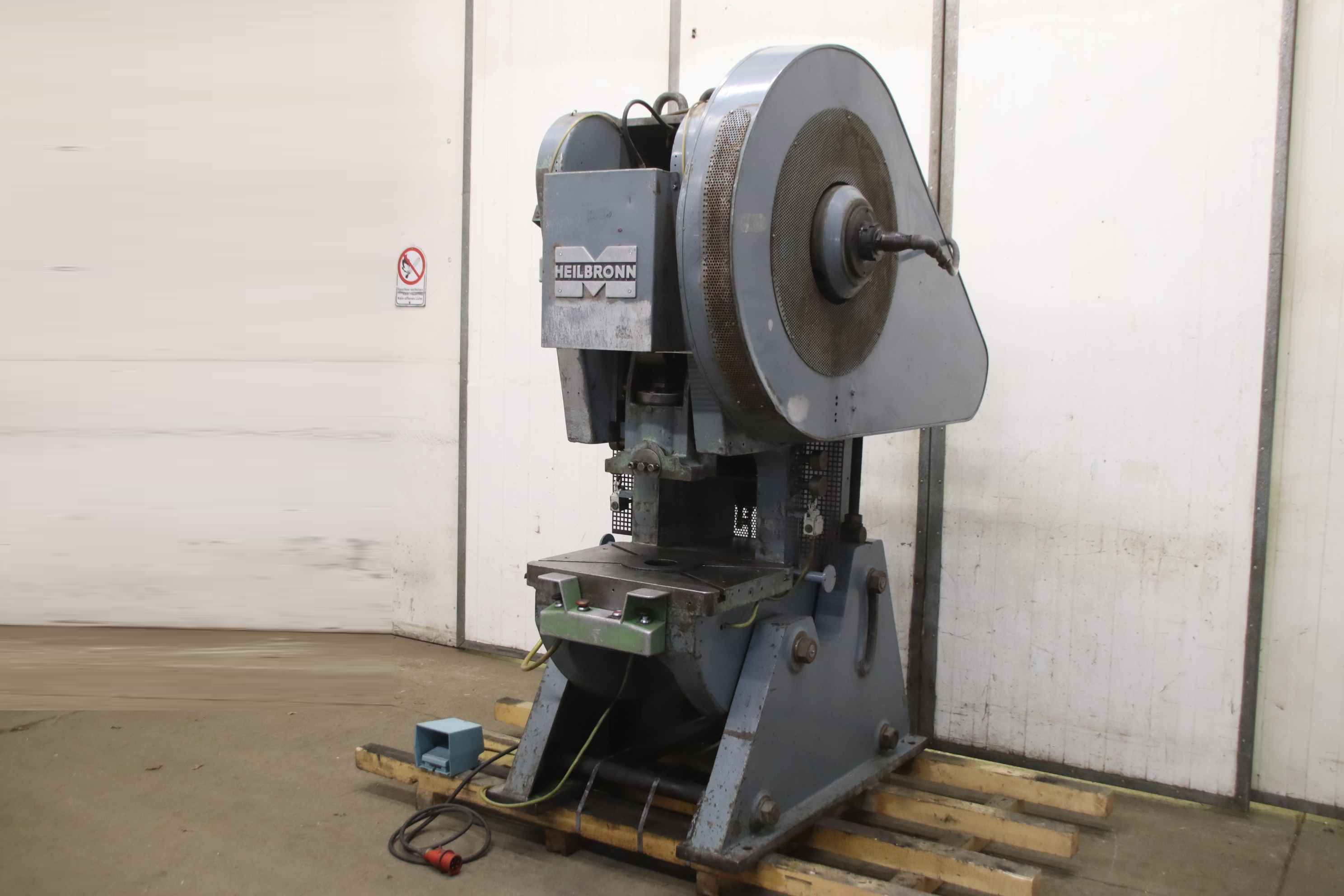 Eccentric press, single column press, punching machine, single column eccentric press, eccentric press, single column press -Manufacturer: Heilbronn, single column eccentric press type NEPD 50 -Pressure capacity: 50 tons -Clutch: pneumatic -Stroke: adjustable 8 - 100 mm -Table size: 500 x 650 mm -Table recess: Ø 240/100 mm -Projection: 255 mm -Punching fixture: Ø 40 mm -Insertion height 355 mm -Dimensions: 1800/1080/H2260 mm -Weight: 3050 kg
