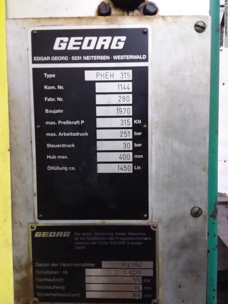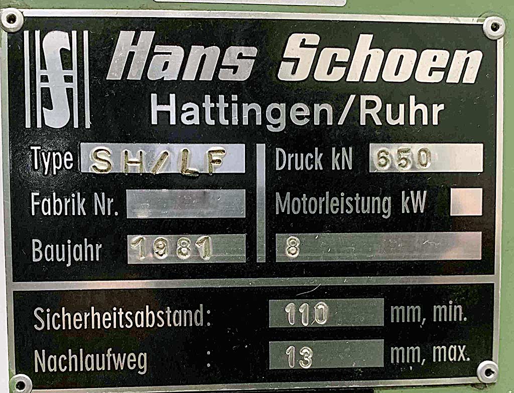 pressure: 120/15 tdistance between columns: 860 mmstroke: 170 mmtable-size: 860 x 600 mmdayligth: 350 mmmax. distance table - ram: 520 mmram head dimension: 860 x 600 mmhole in the table: 200 x 140 mmtable height over floor: 850 mmtotal power requirement: 25 kWweight of the machine ca.: 7,5 tdimensions of the machine ca.: 2,3 x 1,7 x 3,4 mMaximum ram pressure: 120 kNMaximum pull-out pressure: 15 kNSick light curtainSafety distance: 180 mmMaximum overrun: 15 mmThe data for this ad was created with ModulMWS - the software solution of LogoTech oHG.