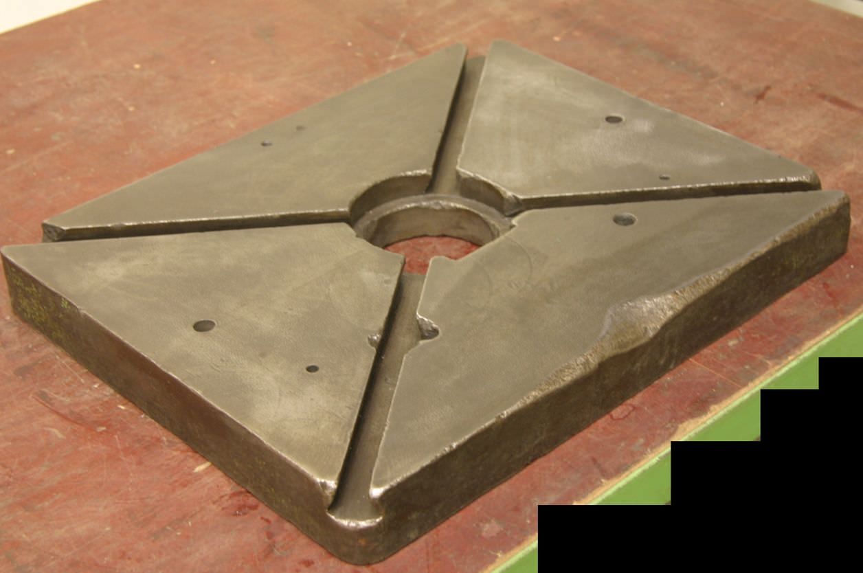 T-slot plate, clamping plate with dovetail slots, plate field, welding table, welding table -Intermediate plate: for hydraulic press eccentric press -Opening: 150 x 100 mm -Groove width: 18 mm -Hole spacing: 200 x 250 mm, Ø 14 mm -Dimensions: 480/350/H60 mm -Weight: 66 kg