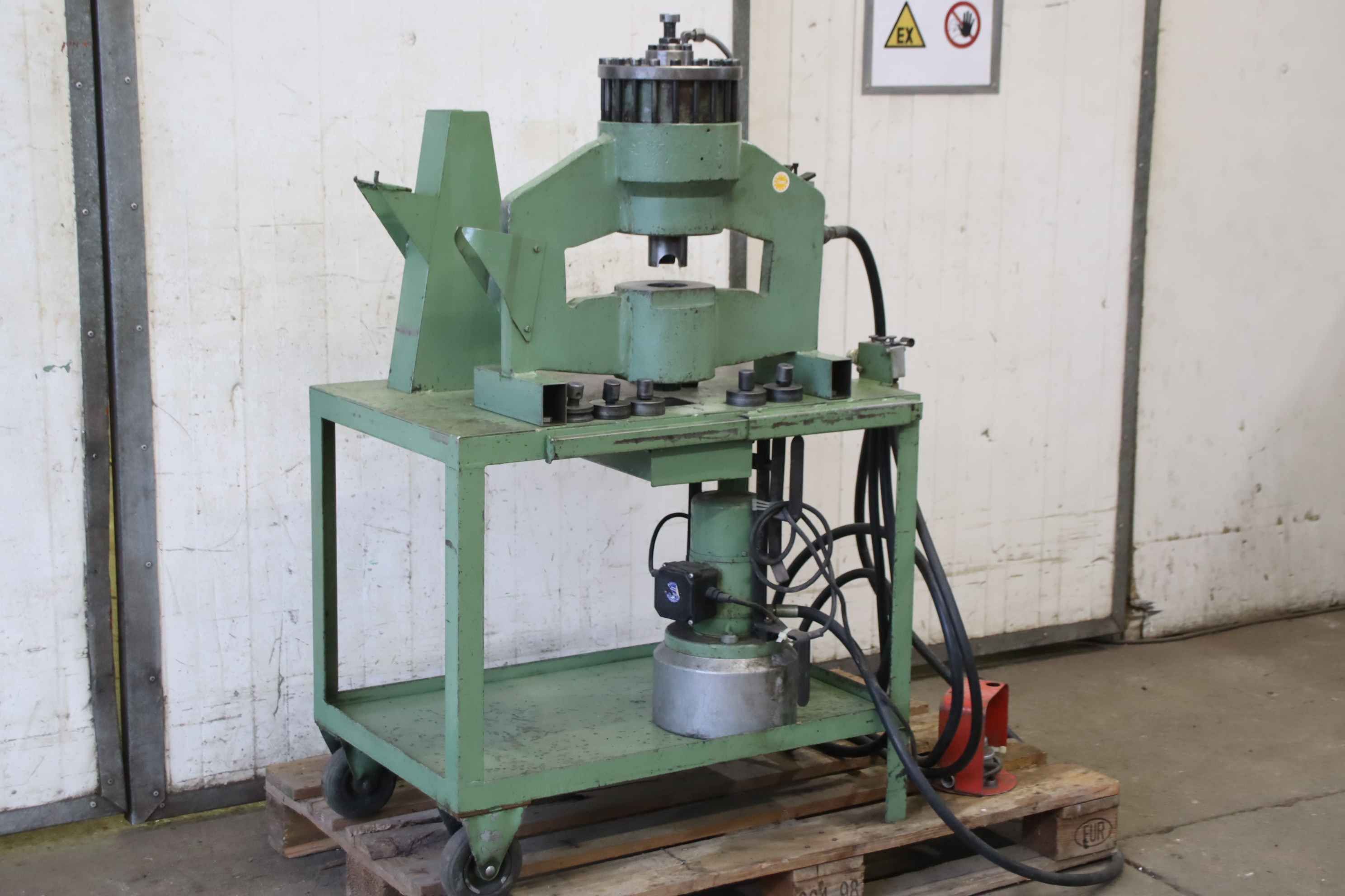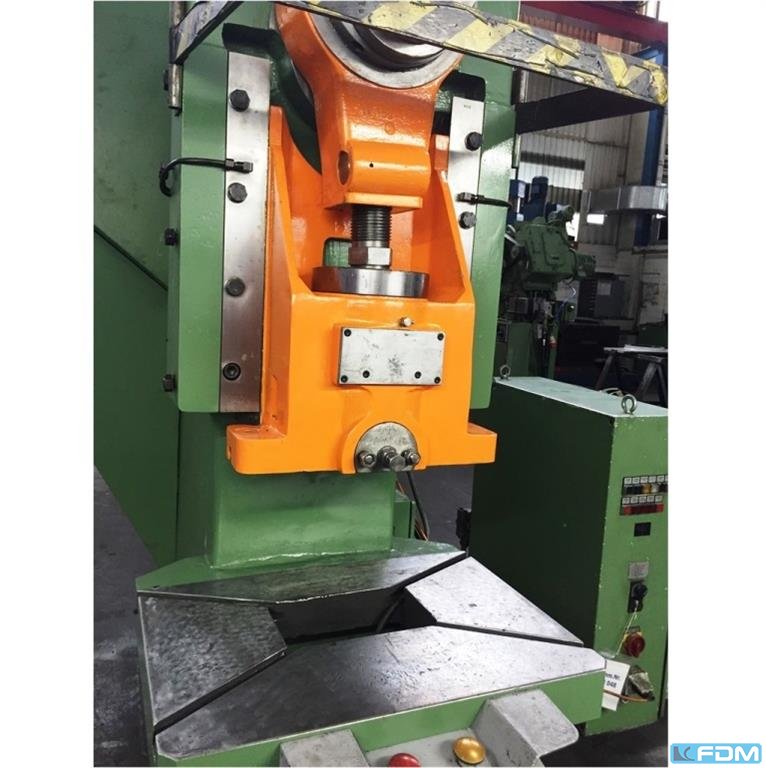 pressure:100 tthroat:320 mmstroke:160 mmdistance table/ram, max. stroke up, adjustment up:480 mmtable surface area:630 x 550 mmhole in the table:200 mmtable height over floor:860 mmram surface:560 x 450 mmoil volume:500 lpower requirement:30,5 kWweight:6,4 tdimensions (WxDxH):1,6 x 2,0 x 2,9 mGerman Safety: permitted for manual loading:UVV 11.064 - VBG 7n5.2 cutting impact cushioning:hydraulic depth stop:mechanical