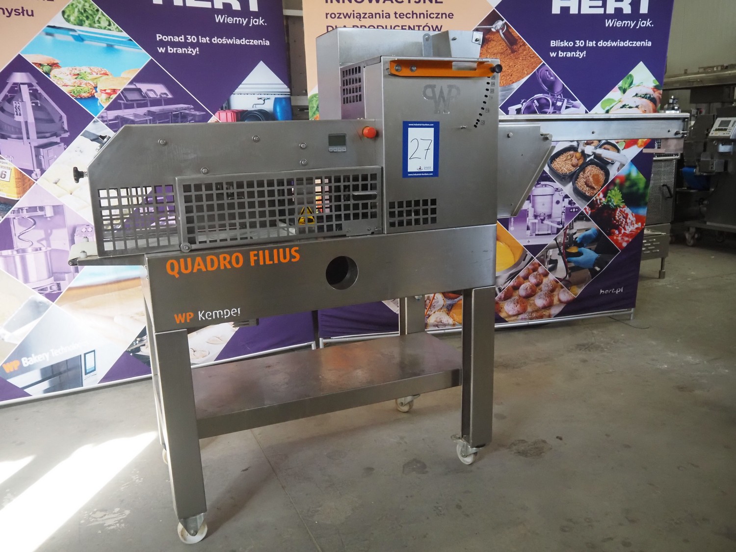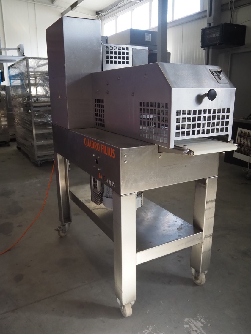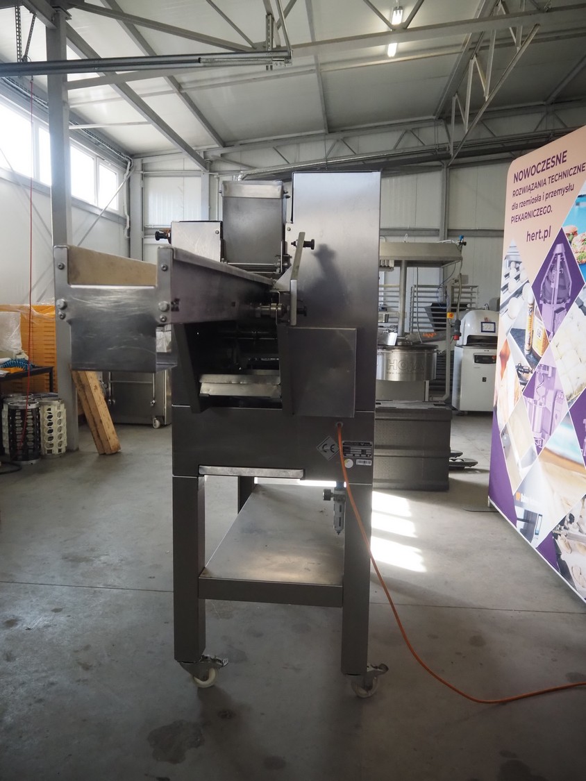 Делитель теста Emil Kemper GmbH, тип: Quadro Filius, номер машины: E-0001360, год производства: 2012, 230 В, 1 Ph, 50 Гц, пластиковый лент, ширина ленты: 130 мм, 300 мм, зазор: 130 мм x 90 мм, размеры воронки: 190 мм x 150 мм x 240 мм, ширина щётки: 190 мм, ширина ножа: 300 мм, пластиковые ролики, ширина валика: 135 мм, общие размеры: 2700 мм x 700 мм x 1800 мм.