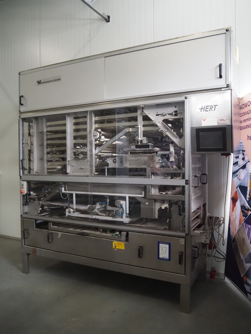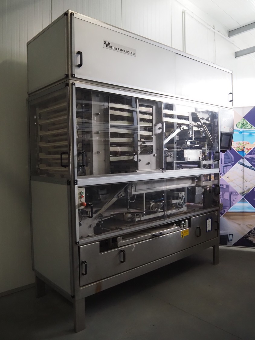 Производственная линия булочок Werner & Pfleiderer, тип: Rollmeister SC51, номер: 265615, год производства: 1999, 400 В, 3 Ph, 50 Гц, 32 A, ширина ремня: 600 мм, общие размеры: 2900 мм x 1200 мм x 2850 мм.