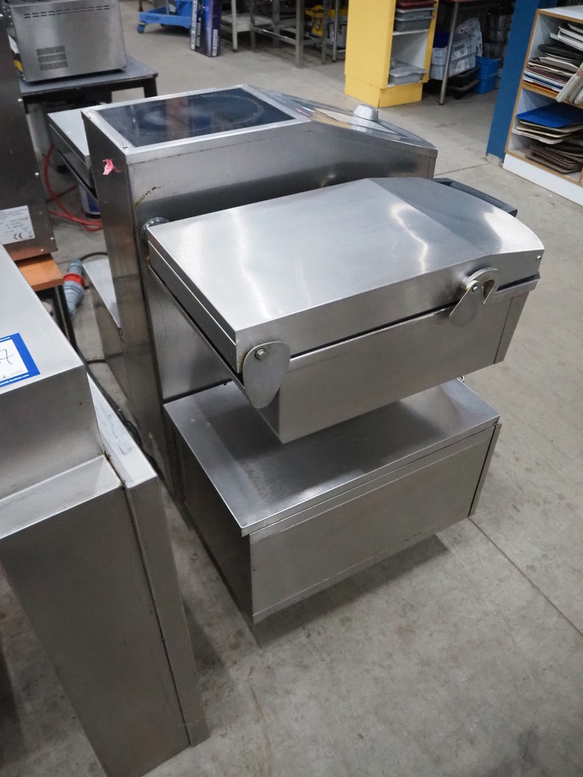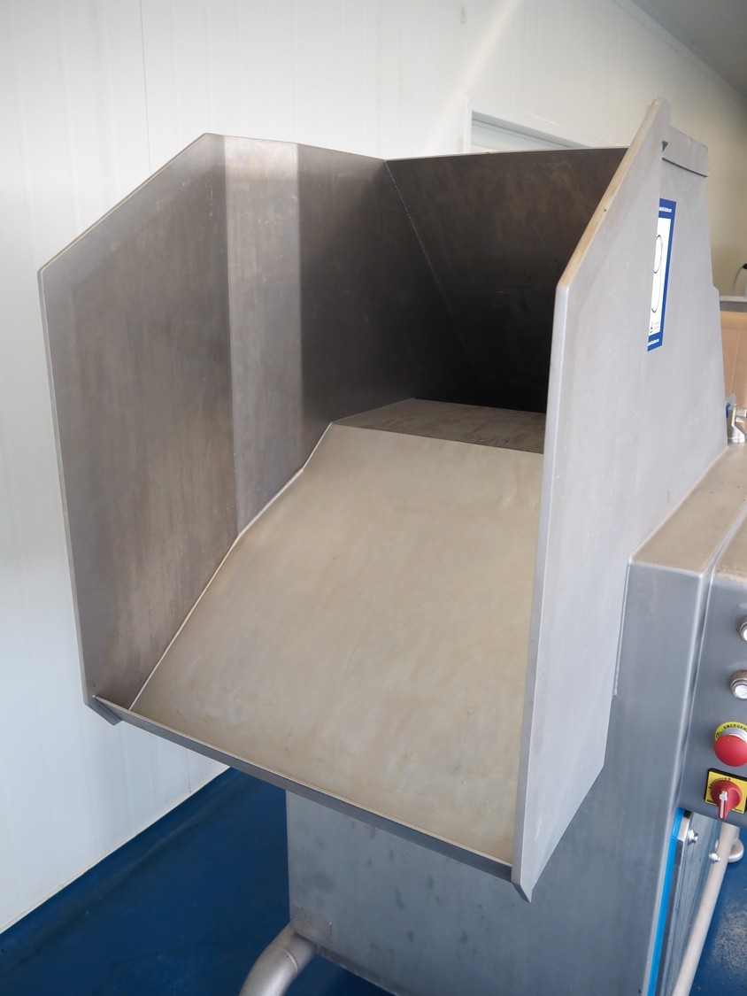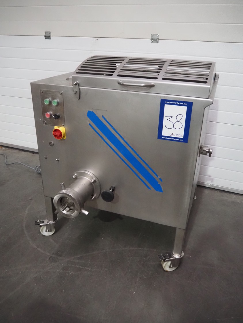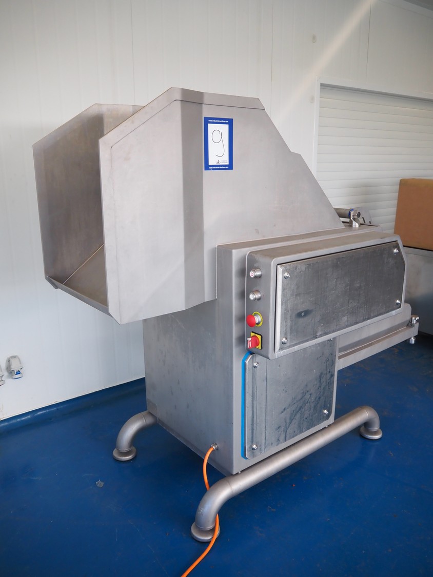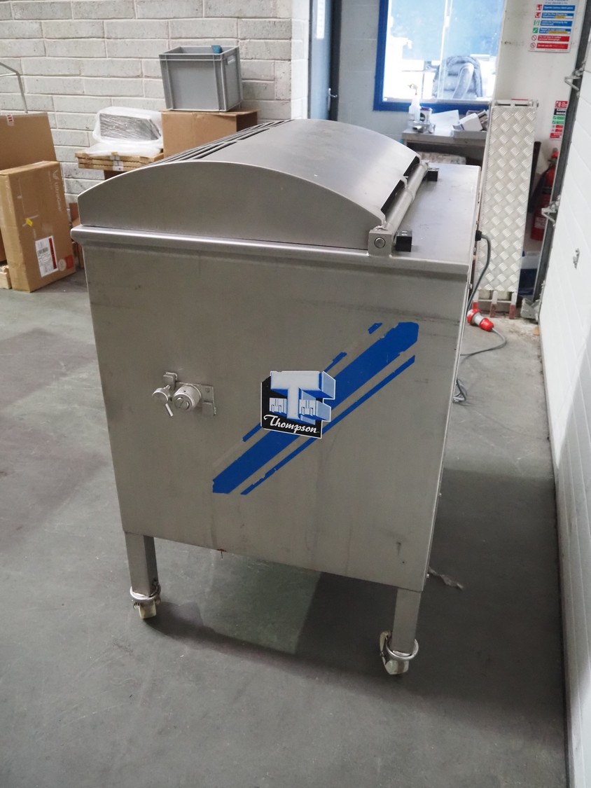 Thompson Meat Machinery Mobile Meldle Mixer-Grinder, тип: TMG 900 M, серийный номер: TMG / 900M / 570, год постройки: 05.2004, 415 В, 50 Гц, 11 А, 4 / 1,1 кВт, диаметр пластины: 98 мм, общие размеры: 1200 мм x 1200 мм x 1300 мм. Неполные, отсутствующие пластины и ножи.