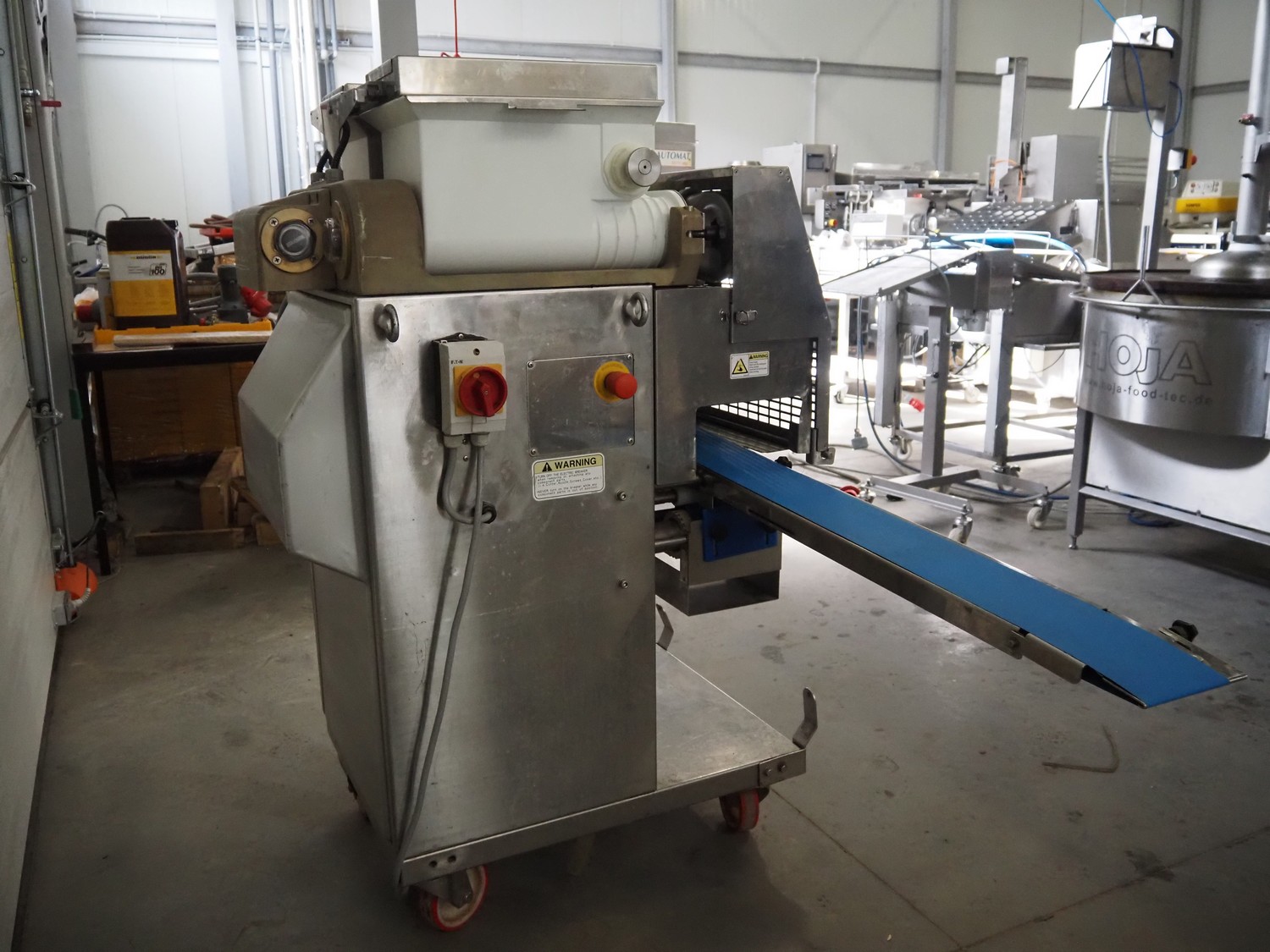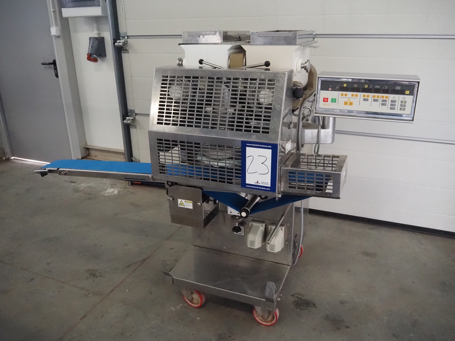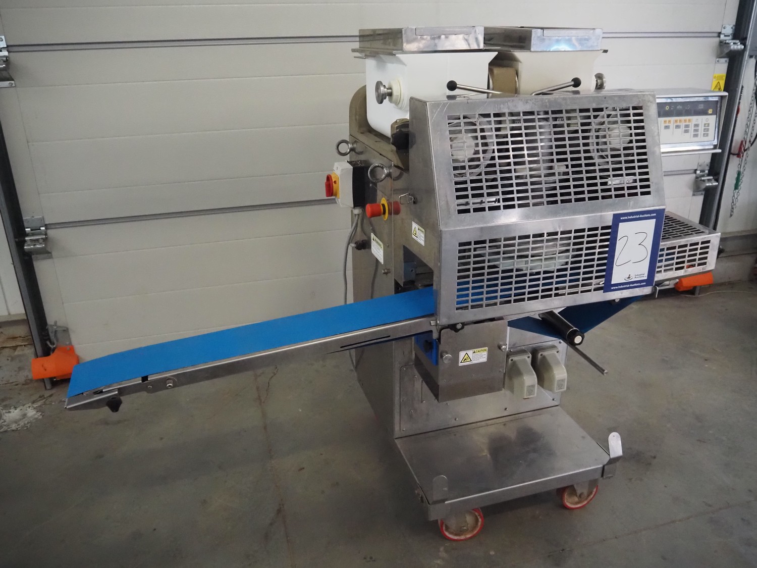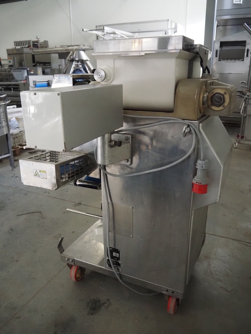 Мобильная машина Rheon, тип: KN135, номер: 308, год изготовления: июнь 2011, 400 В, 3 Ph, 50 Гц, пластиковый лент, ширина ленты: 130 мм, общие размеры: 1900 мм x 900 мм x 1350 мм. Капитальный ремонт в 2022 году.