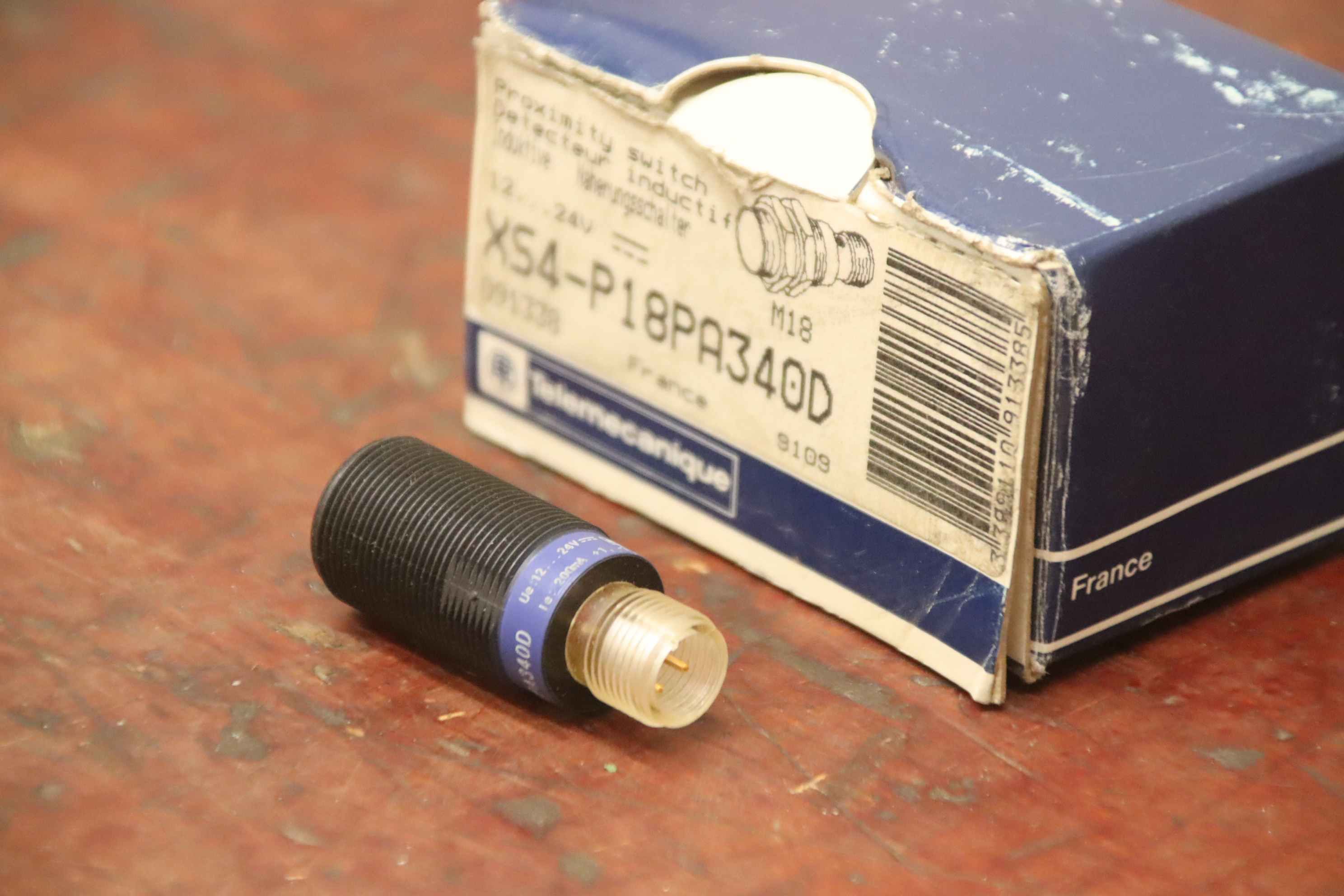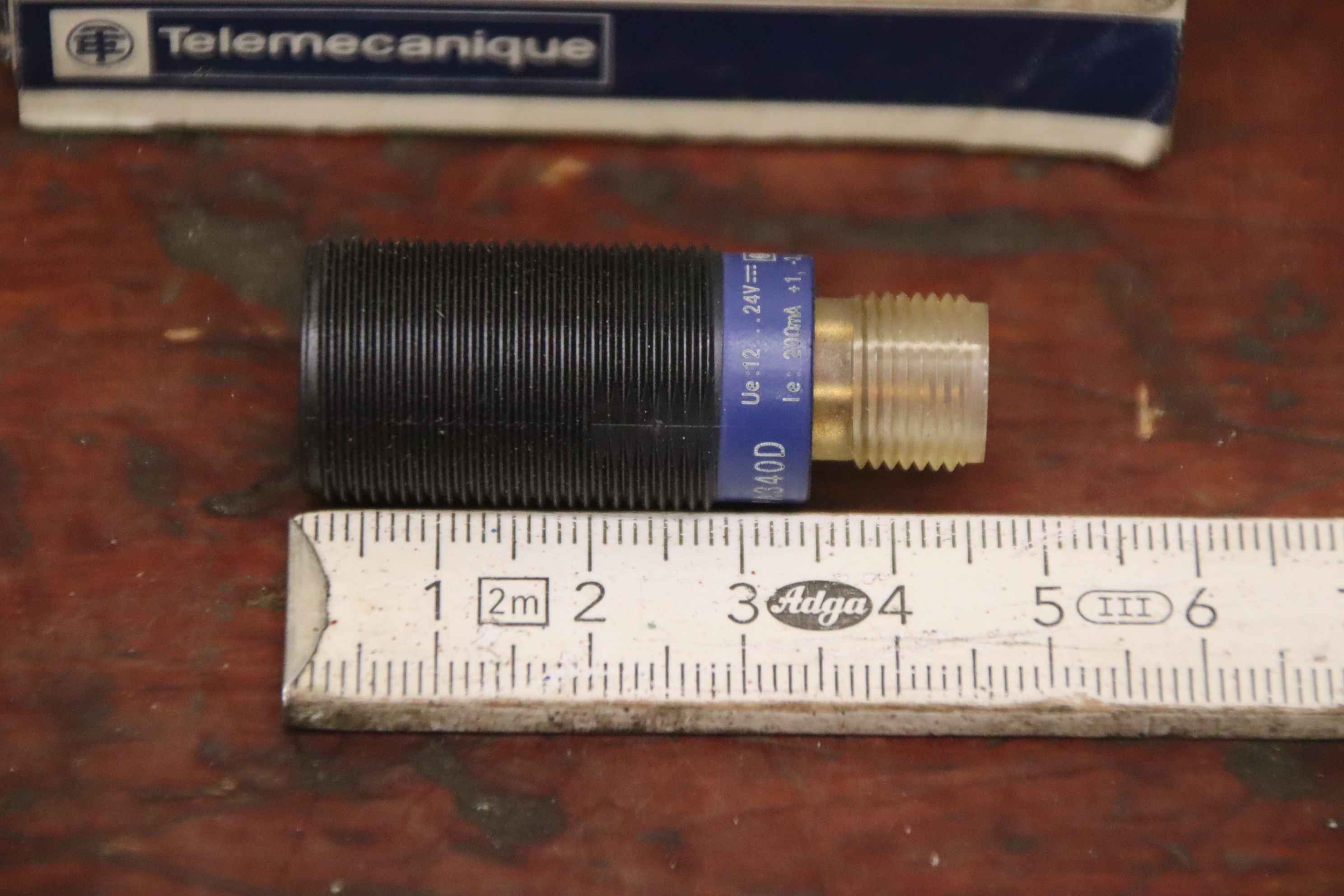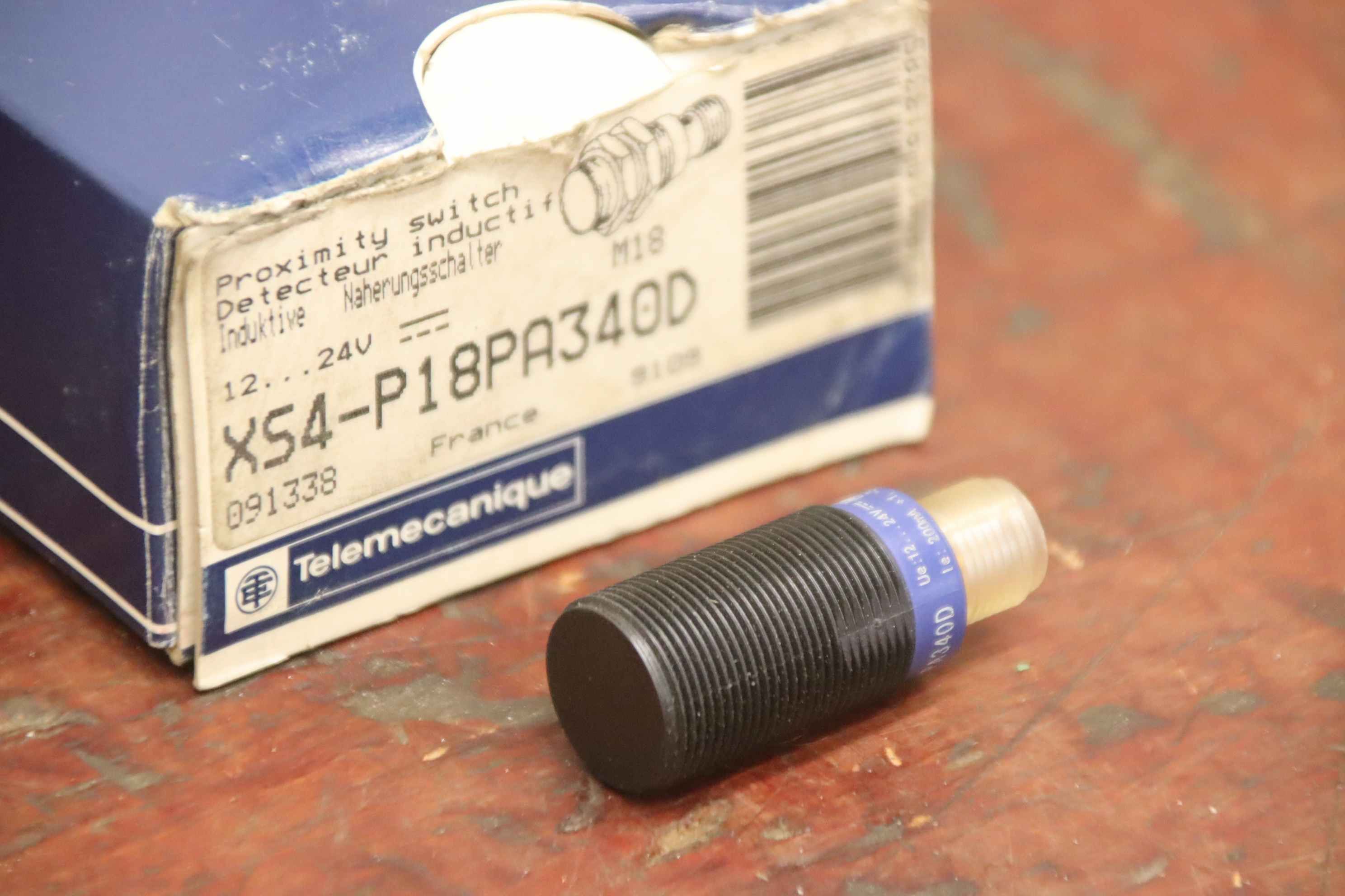 Inductive sensor, electronic sensor, proximity switch, proximity sensor, proximity transmitter-Manufacturer: Telemecanique, Inductive Sensor Proximity Switch unused Ovp-Type: XS4P18PA340D-Number: 1x sensor available-Dimensions box: 80/50/H45 mm-Weight: 0.1 kg.