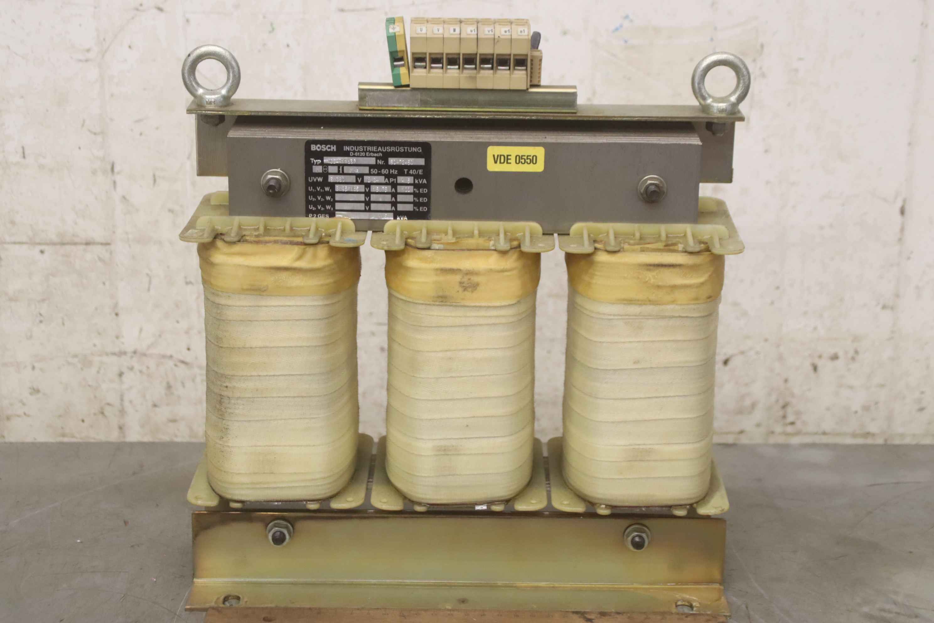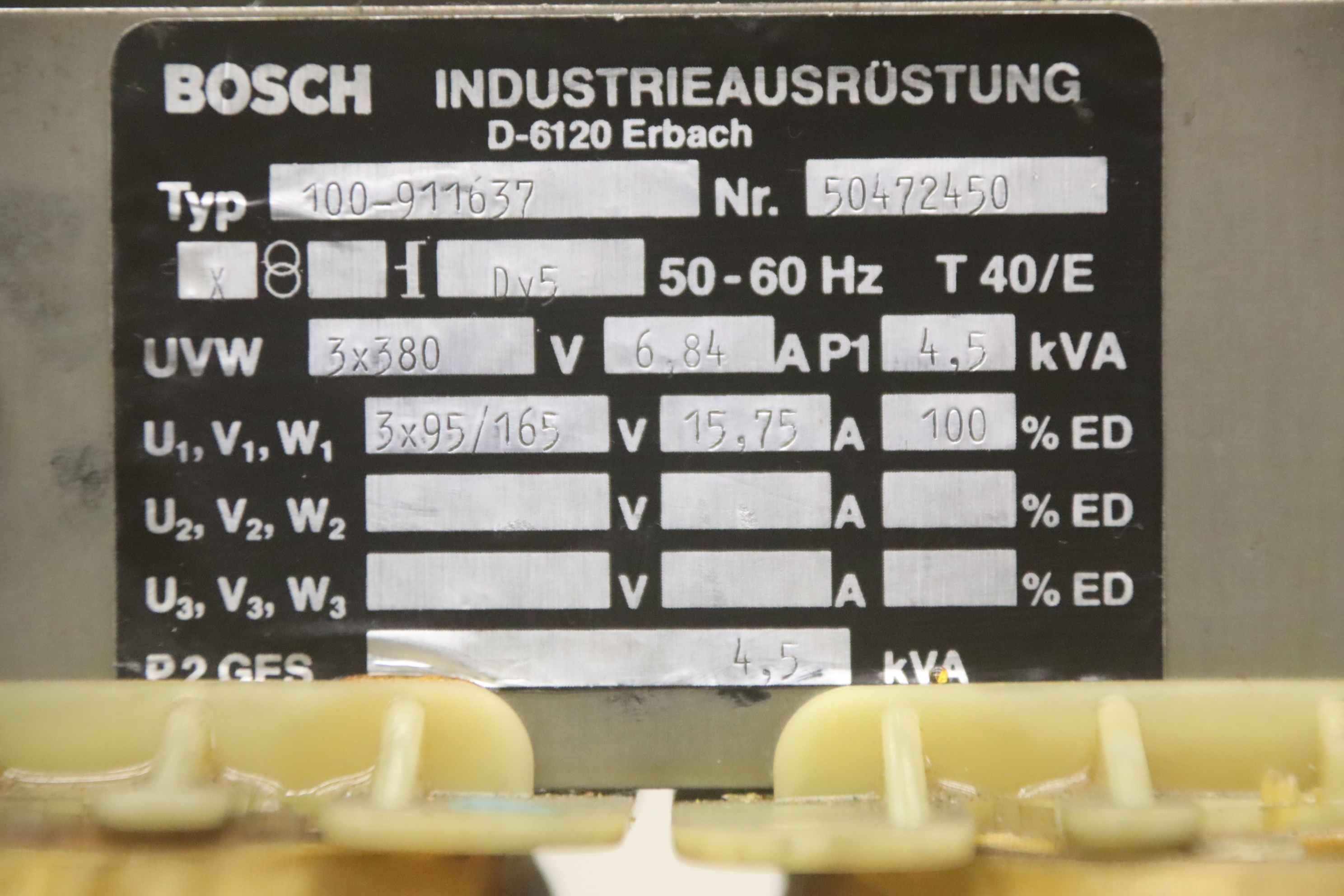 Transformer, transformer, converter, three-phase autotransformer, three-phase transformer-Manufacturer: Bosch, three-phase transformer from CNC milling machine Mikron WF 51C/155-Type: 100-911637-Power: 4.5kVA-Primary: 3x380V-Secondary: 3x95/165 V-Dimensions: 335/135/H350 mm-Weight: 41 kg