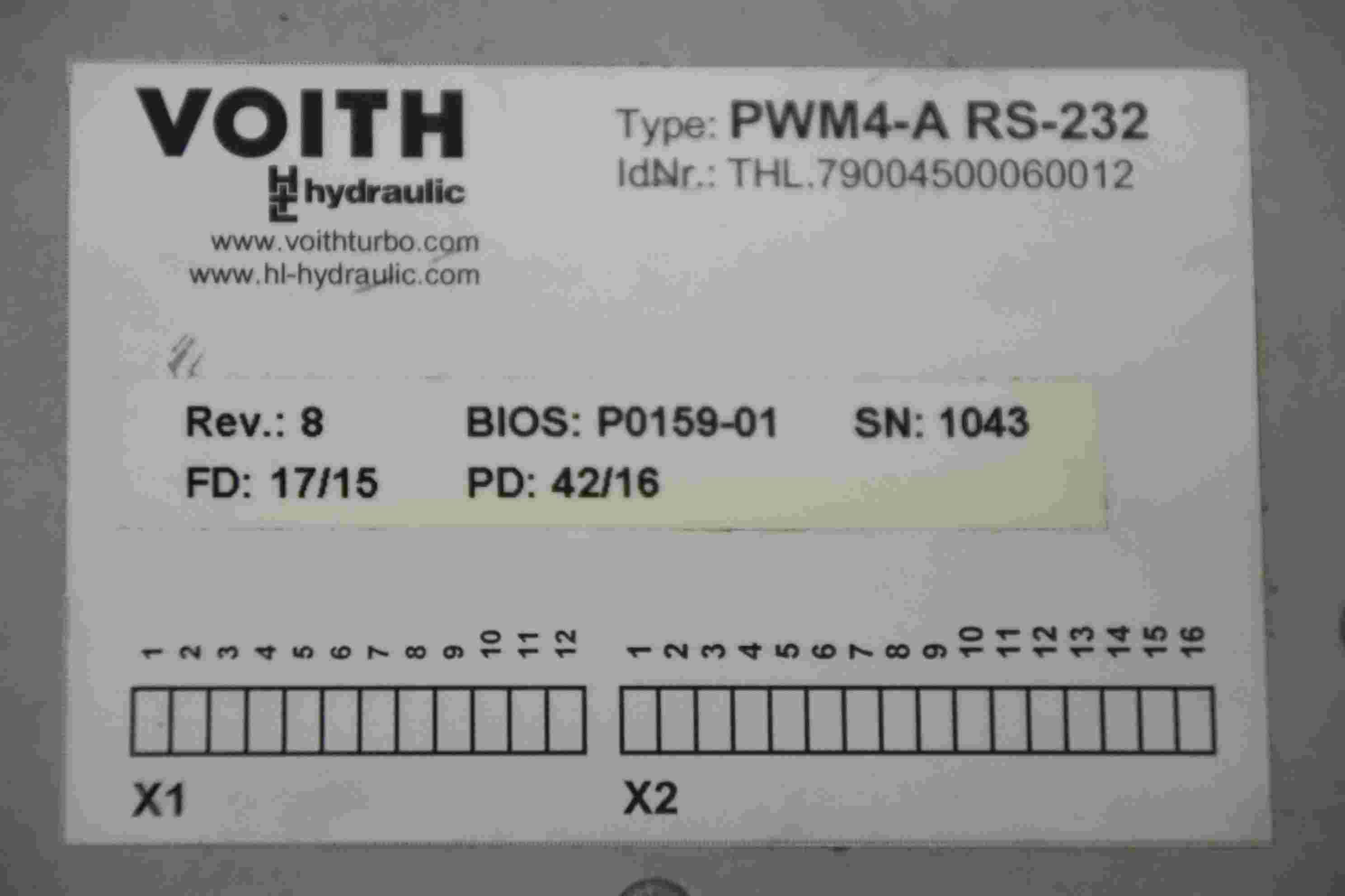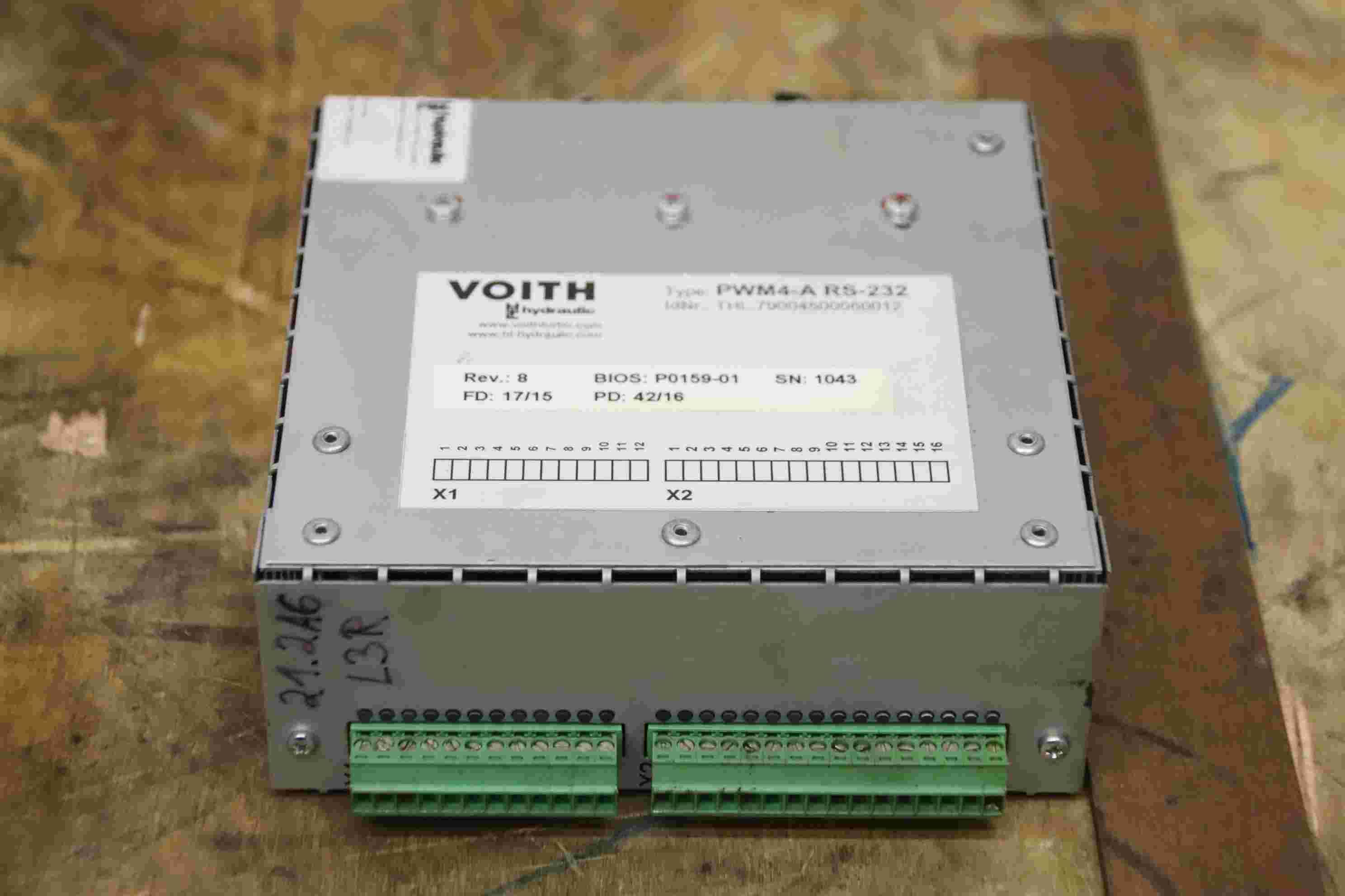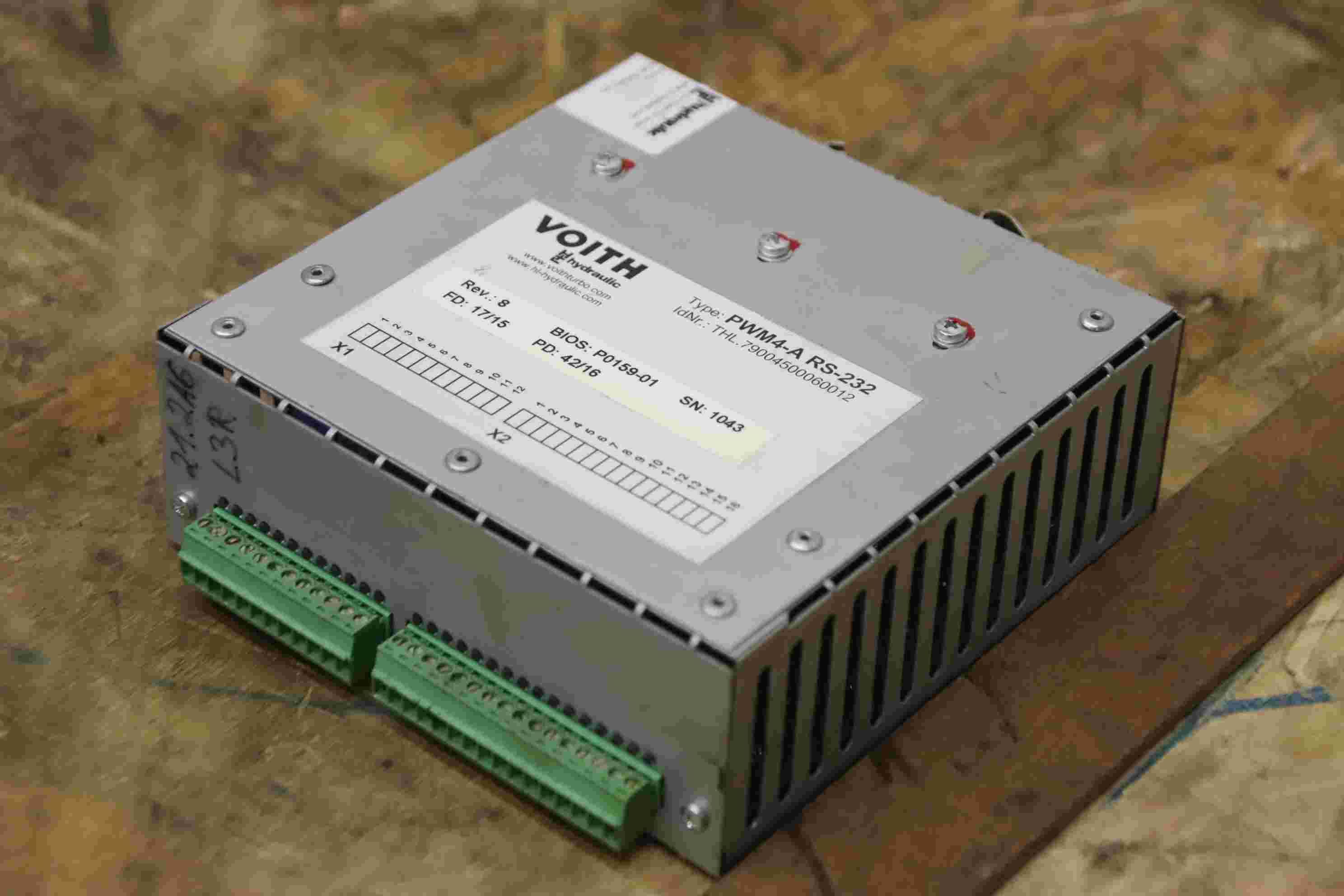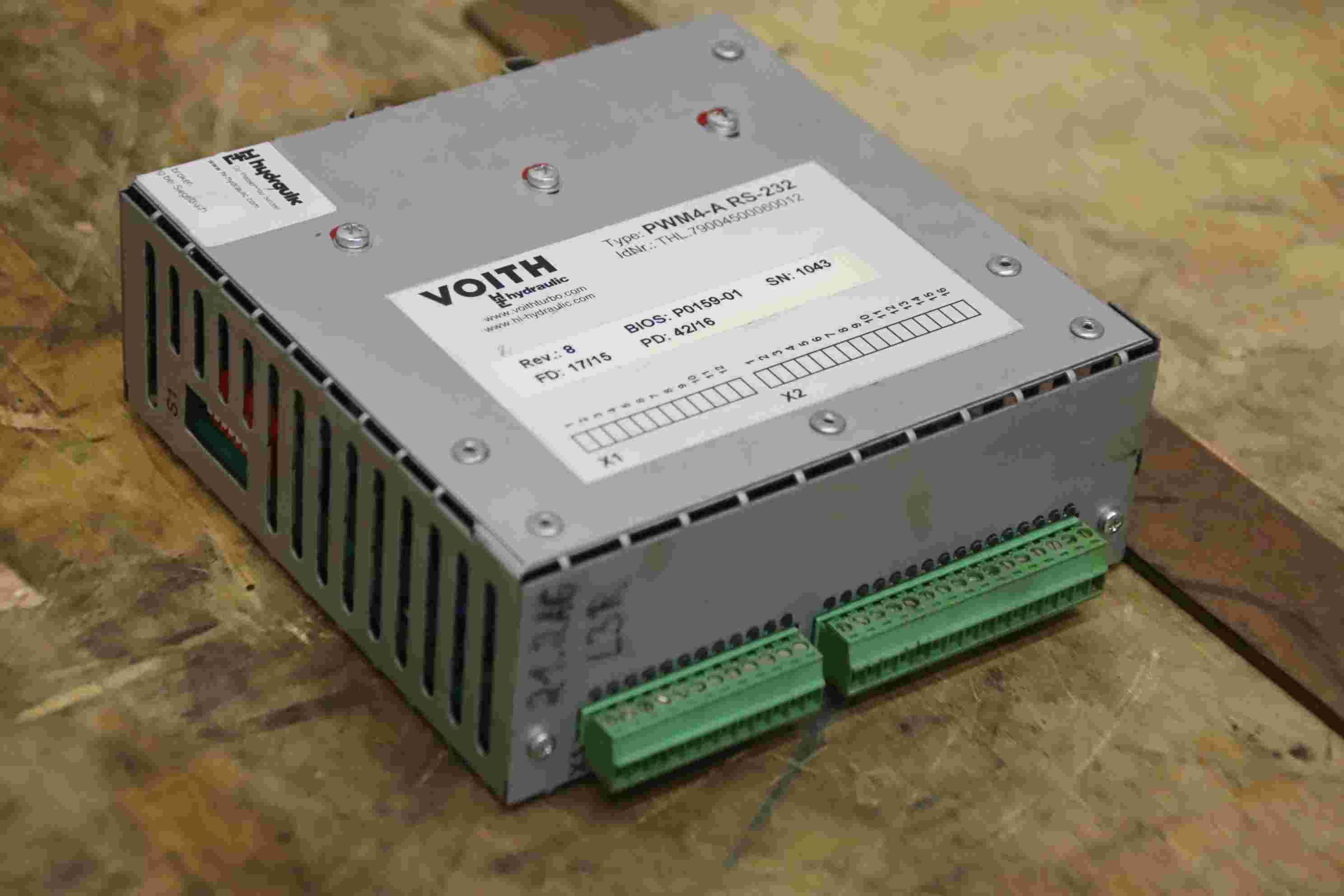 Valve block, control block, hydraulic control block, control unit, hydraulic control-Manufacturer: Voith, control unit from Uldrian TSM 22-8 rotary transfer machine-Type: PWM4-A RS-332 REV.: 8 BIOS : P0159-01-Number: 5x control unit available-Price per piece-Dimension: 150/135/H50 mm-Weight: 0.5 kg/pc.