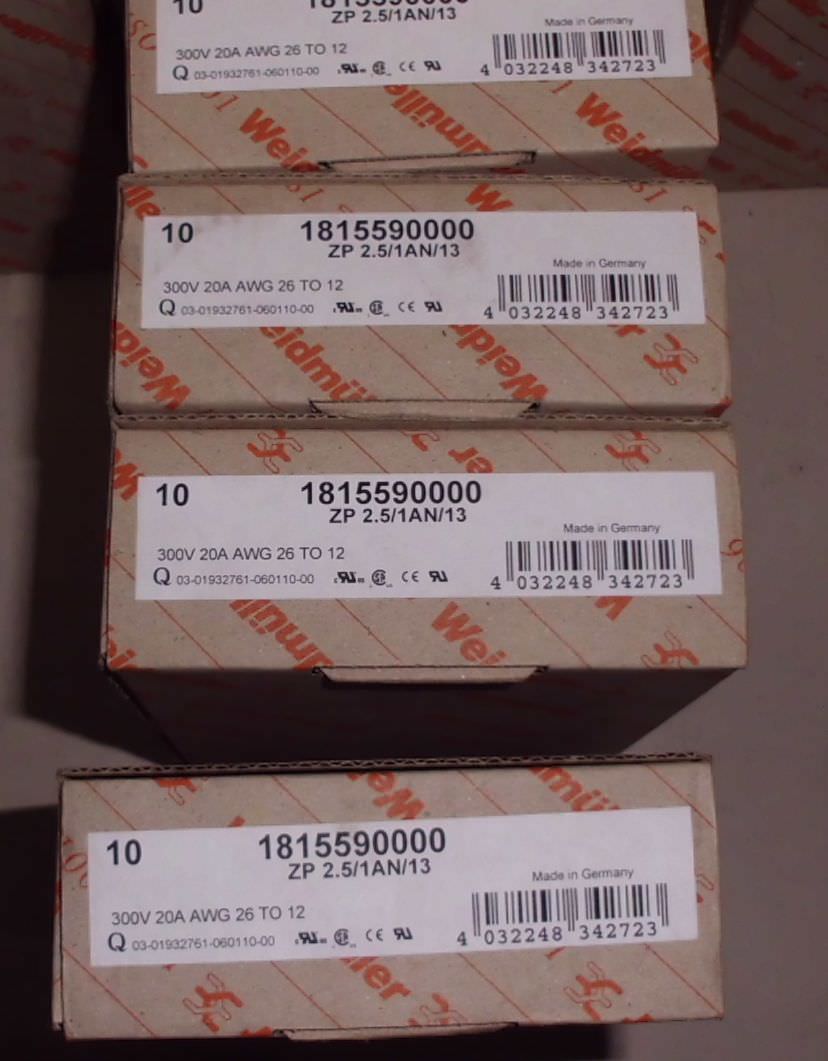 Terminal block, terminal block, feed-through terminal block -approx. 1240 pieces: various clamps -1x: 1770370000 ZDU 4-2/2AN -1x: 1651980000 ZIA 1.5/3L-1S -3/4 Package: 1632080000 ZPE4 -5x: 1632050000 ZDU4 -2x: 1775480000 ZDU1.5 -1x: 1867180000 ZP2.5/1AN/11GN/BE -5x: 1652030000 ZIA1.5/4L-PE -5x: 1/2x 1867190000 ZP25/1AN/12GN/BE -5x: 1652030000 ZIA1.5/4L-PE -4x: 1815590000 ZP2,5/1AN/13 Price: complete -Weight: 16.5 kg