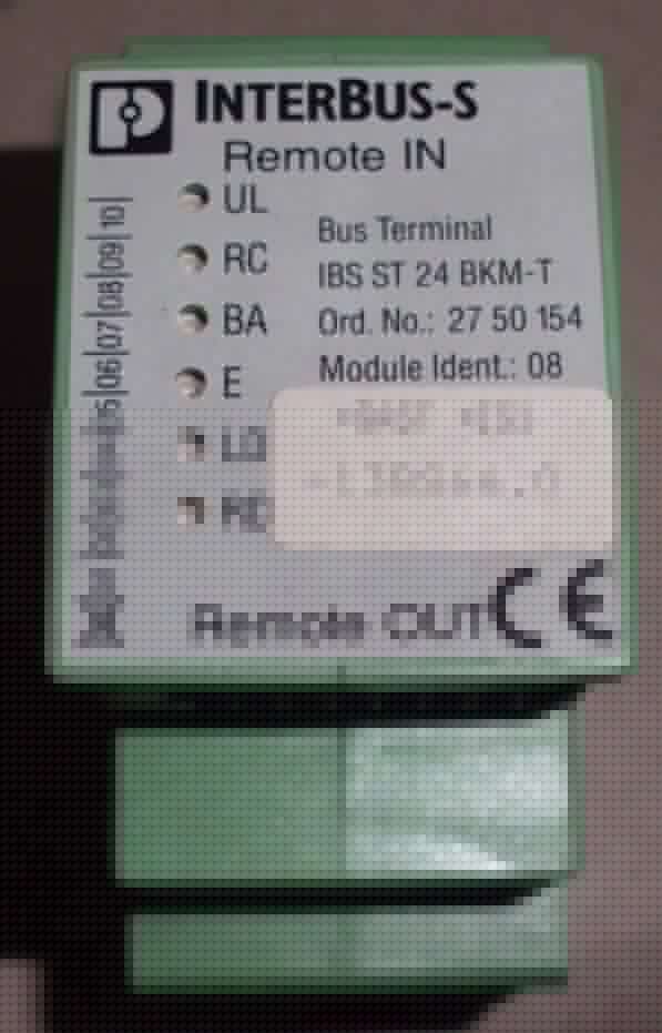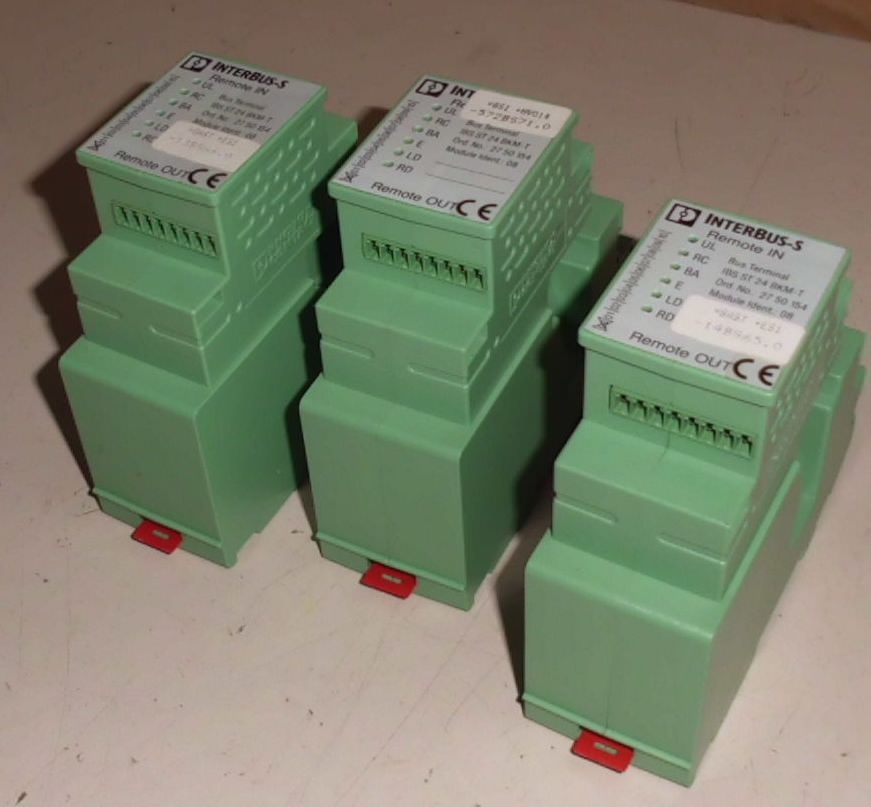 InterBus-S, bus coupler, bus terminal, bus terminal -Manufacturer: Phoenix Contact, Interbus-S Bus Terminal -Type: IBS ST 24 BKM-T Ord.No. 27 50 154 -Price: per piece -Number: 17 modules available -Dimensions: 115/45/H115 mm -Weight: 0.2 kg/pc.