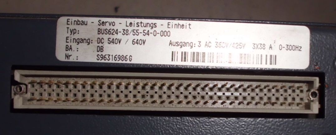 Basic - feed-in unit, feed-in module, inverter, frequency converter, frequency transformer, drive inverter, controller, variable speed drive -Type: BUS624-38/55-54-0-000 -Input: DC 540 V/640 V -Output: 3AC 360V/425V 3x38A 0-300Hz -Number: 4 servo power units available Price: per piece -Dimensions: 190/380/H300 mm -Weight: 14 kg