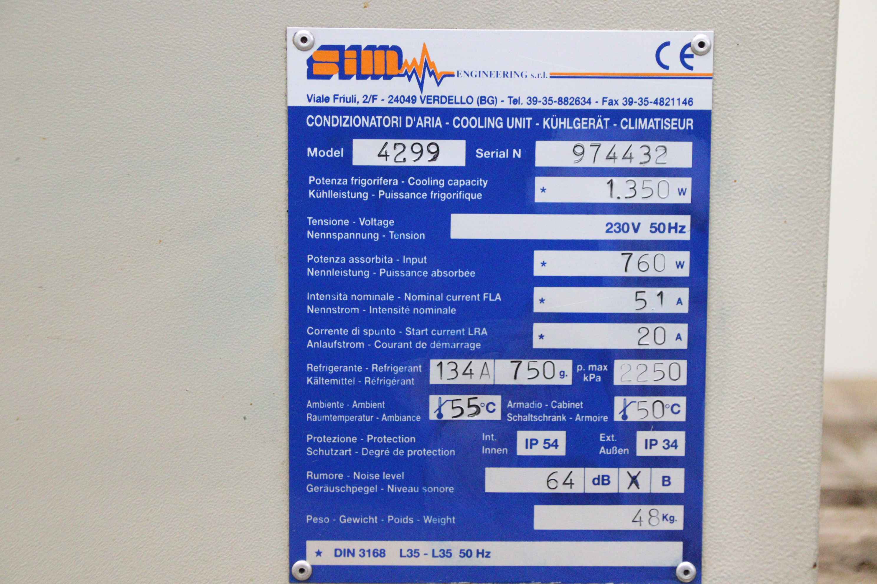Switch cabinet cooling unit, switch cabinet air conditioner, distribution cabinet, heat exchanger, wall-mounted cooling unit, switch cabinet cooler -Manufacturer: Sim, heat exchanger control cabinet cooling unit -Type: 4299 -Voltage: 230V -Cooling capacity: 1,350 W -Dimensions: 400/245/H1000 mm -Weight: 54 kg