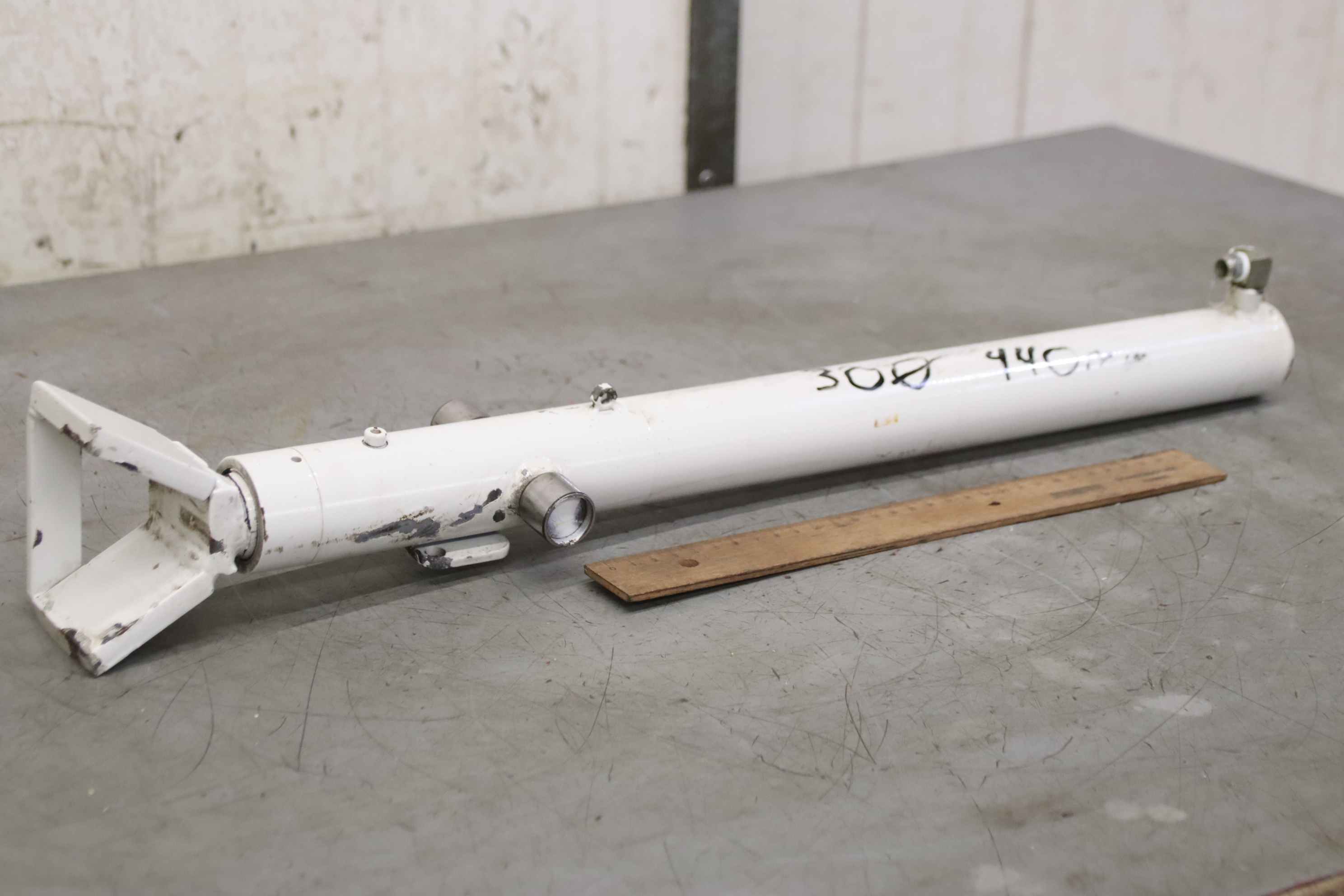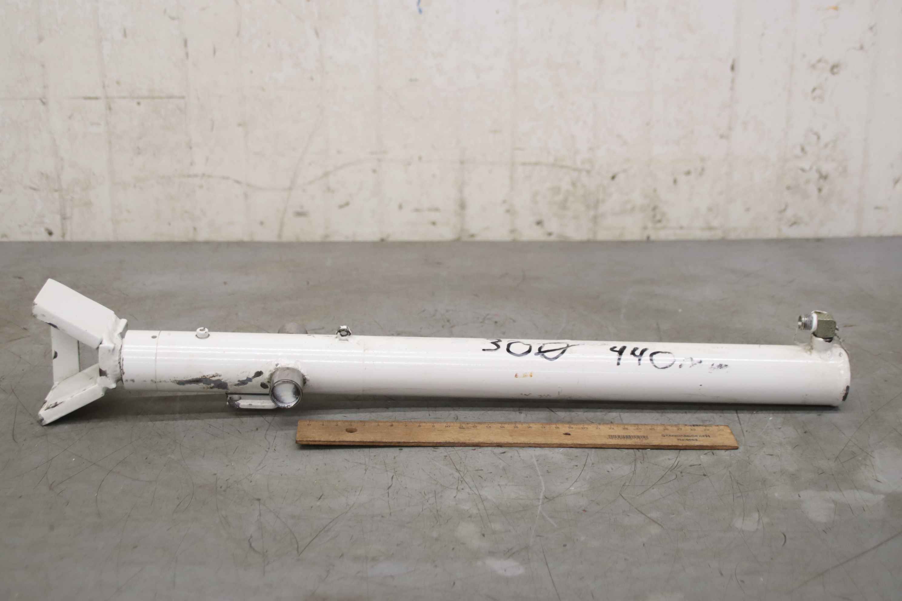 Hydraulic cylinder, support cylinder, hydraulic piston, pressure piston, tilting cylinder -Manufacturer: GSL (German Standard Lift), Hydraulic cylinder, stroke 440 mm -Type designation: E030ZM50479 -Piston rod: Ø 30 mm -Hole: Ø 24 mm, see photos -Quantity: 1 cylinder available -Dimensions: 470/50/H80 mm -Weight: 7 kg