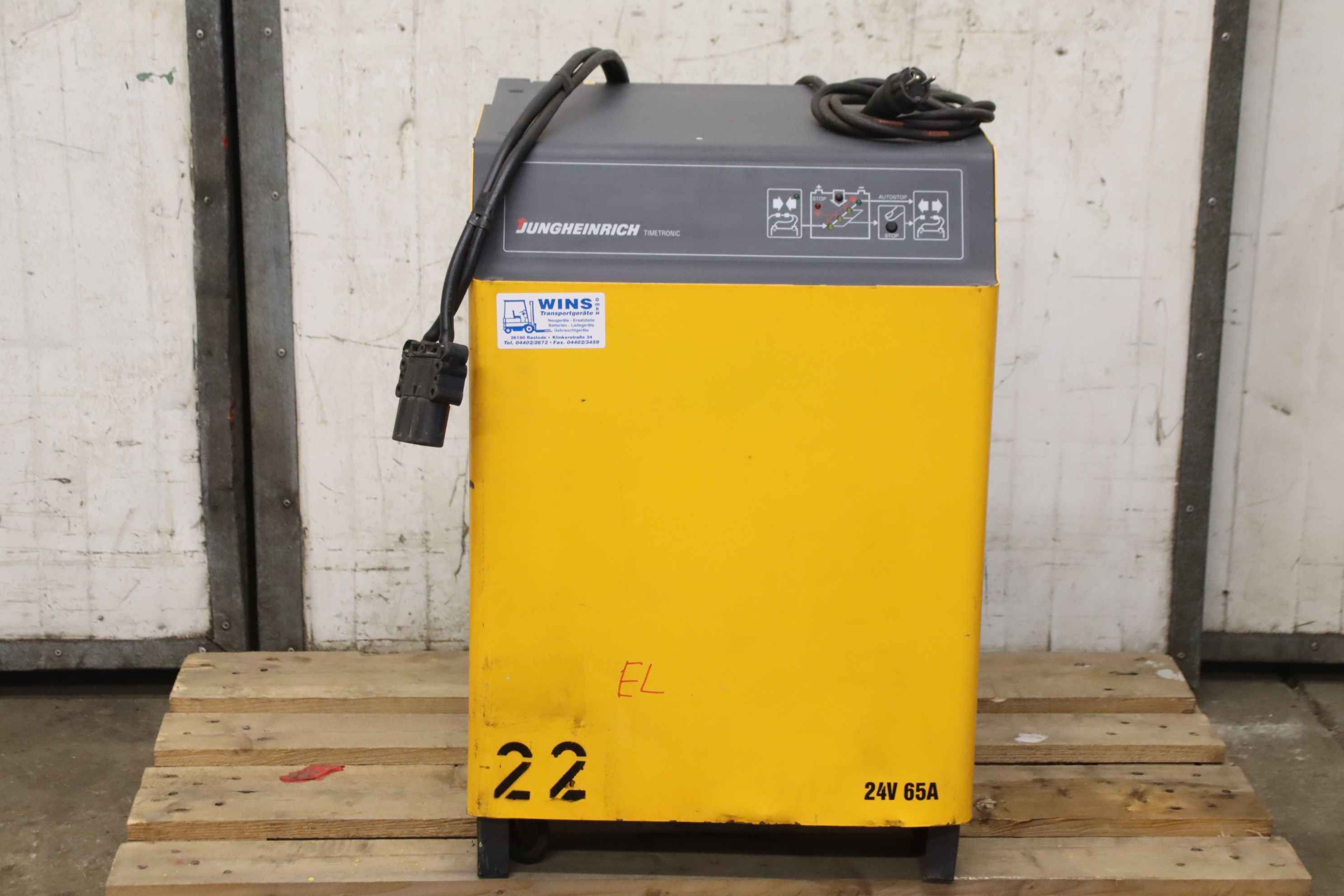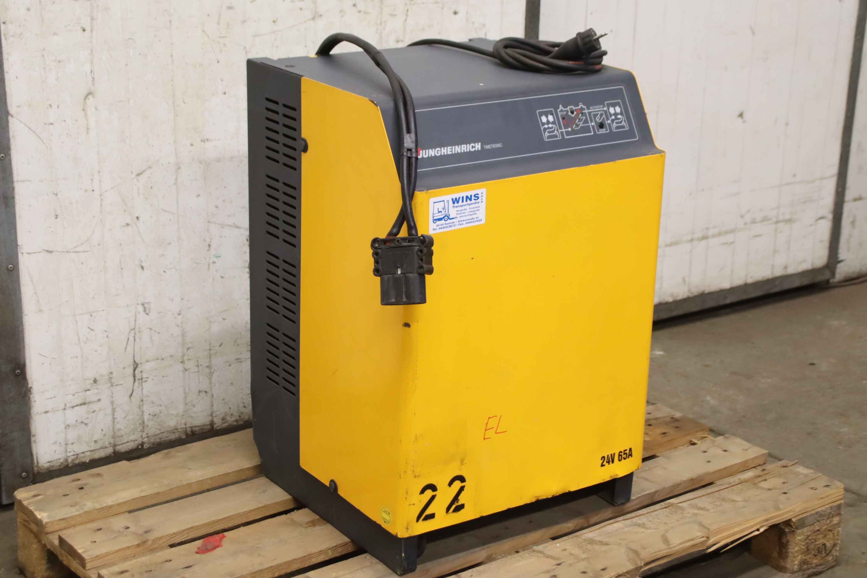 Forklift battery charger, industrial charger, forklift battery charger, industrial charger, Si rectifier-Manufacturer: Jungheinrich, charger type Timetronic E230 G 24/65 B-ET-Input voltage: 230V 50-60Hz-Power: 24V/65A-Number: 1x charger available-Dimensions: 500/490/H7355 mm-Weight: 53 kg