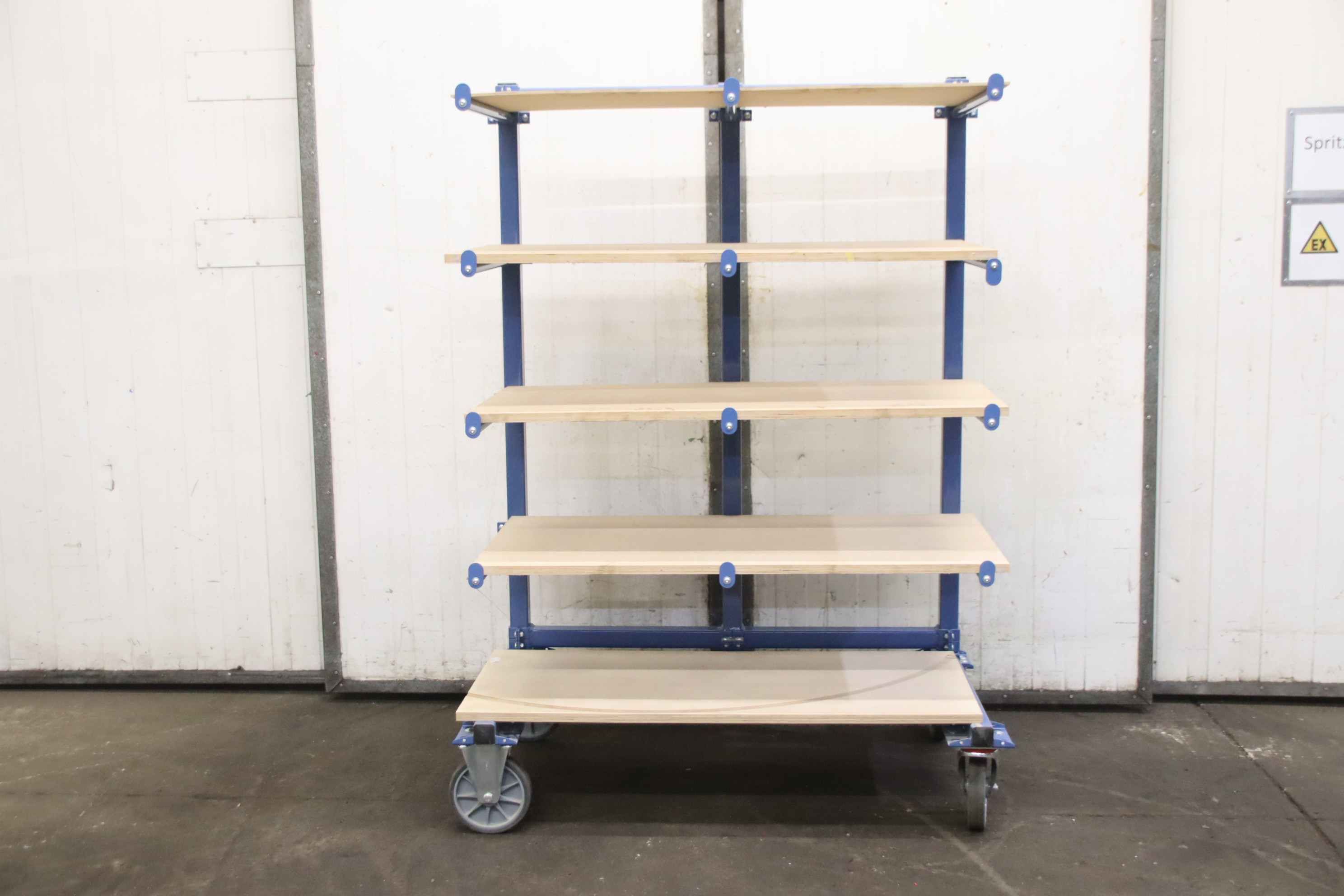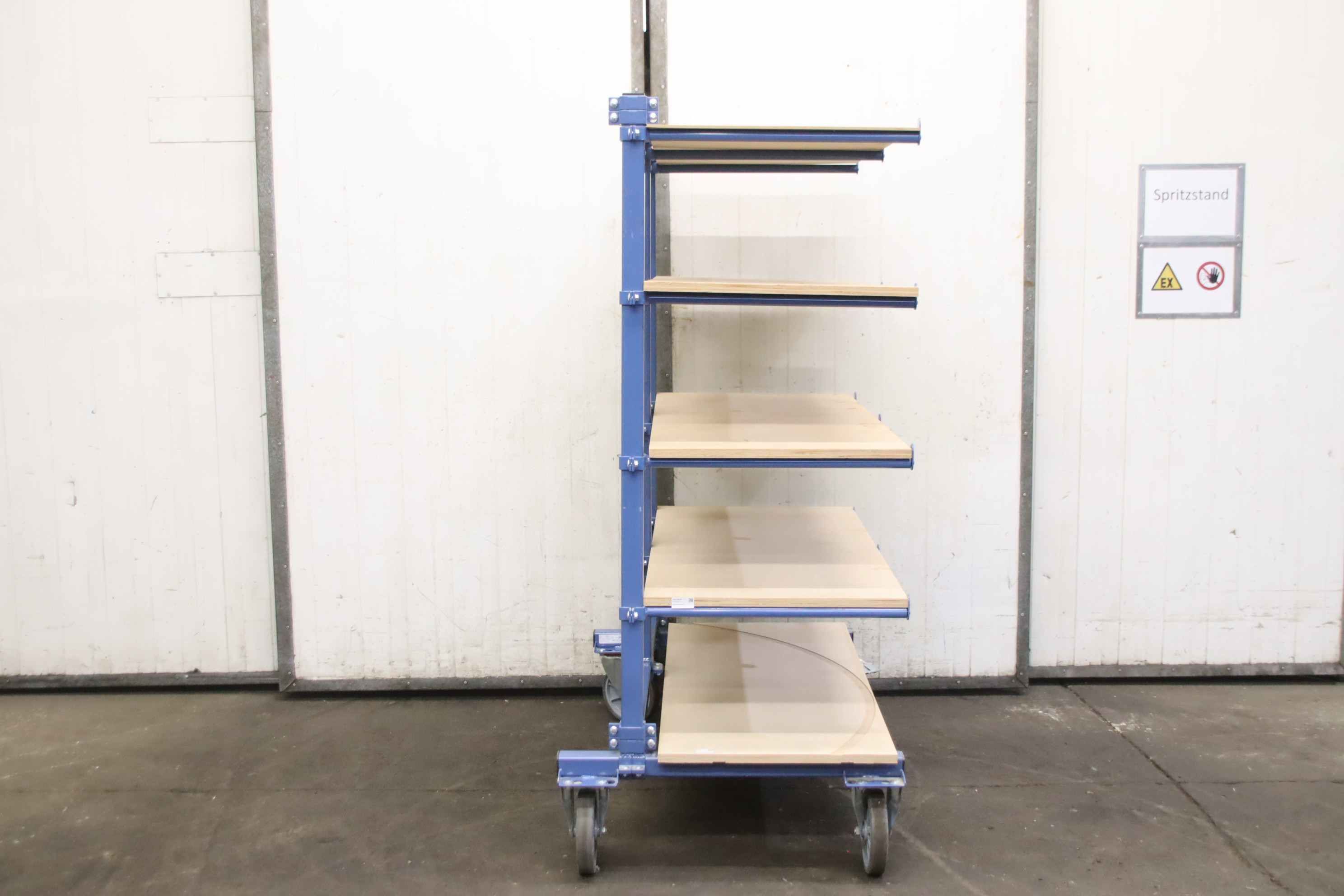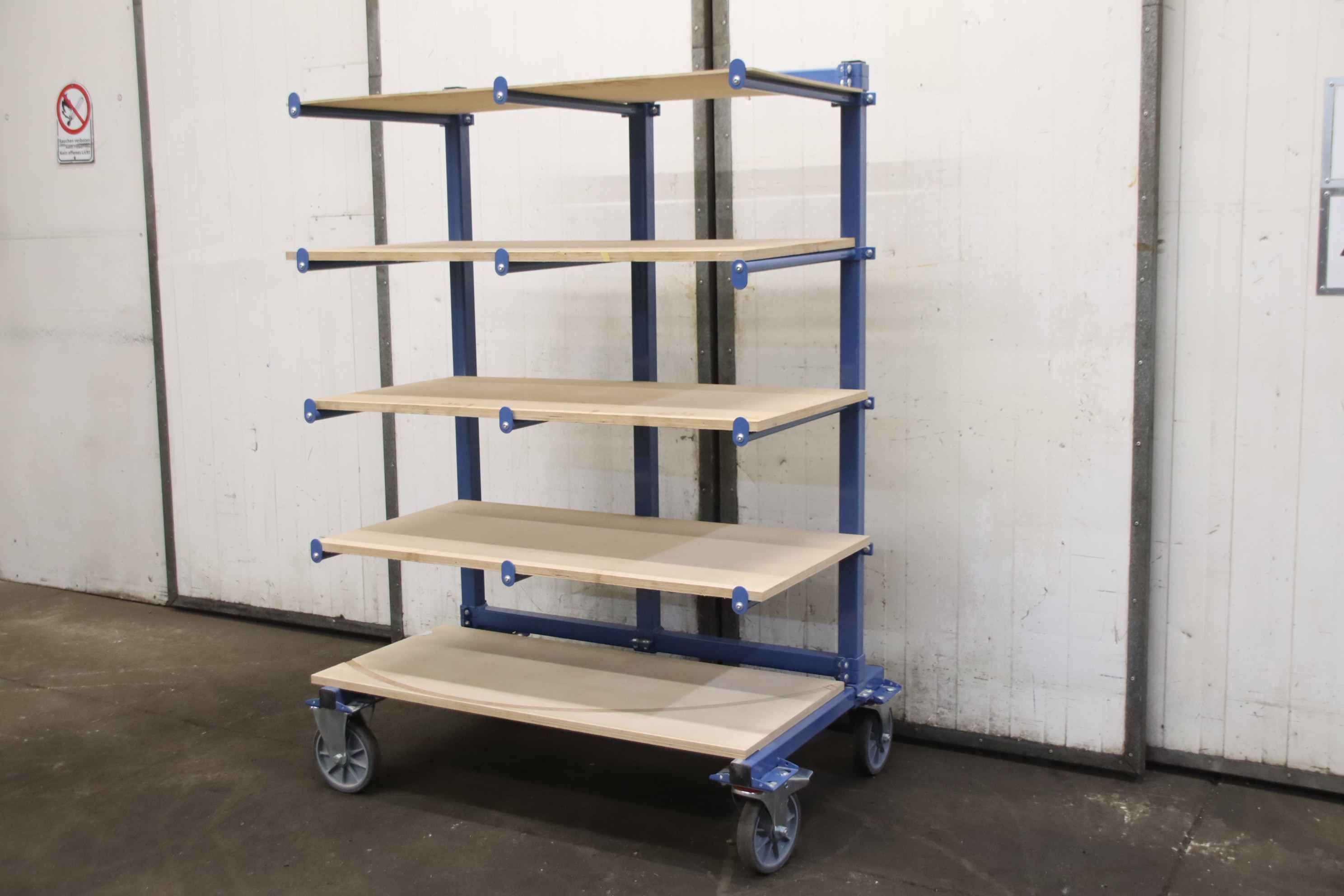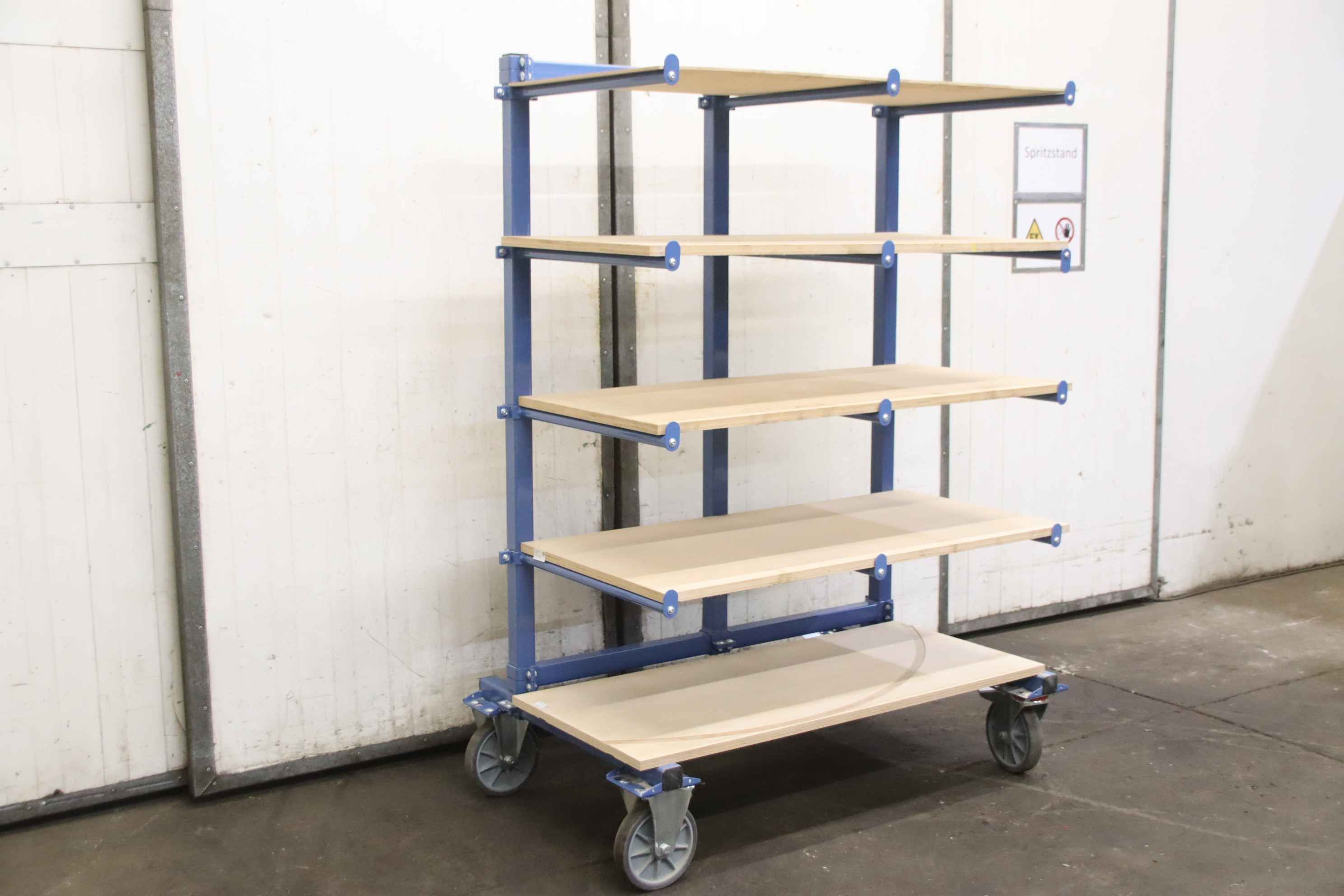 Shelving trolleys, transport trolleys, shelf trolleys, sorting trolleys, order picking trolleys, mobile shelving, support arm trolleys-Manufacturer: Fetra, support arm trolley type 4614AS with roll-off protection-Load capacity: 500 kg / 80 kg per level-Support arm length: 600 mm, height adjustable-Chassis: 2 swivel castors with brakes / 2 fixed castors-Shelves: 5 pieces-Total dimensions: 1300/810/H1800 mm-Weight: 114 kg