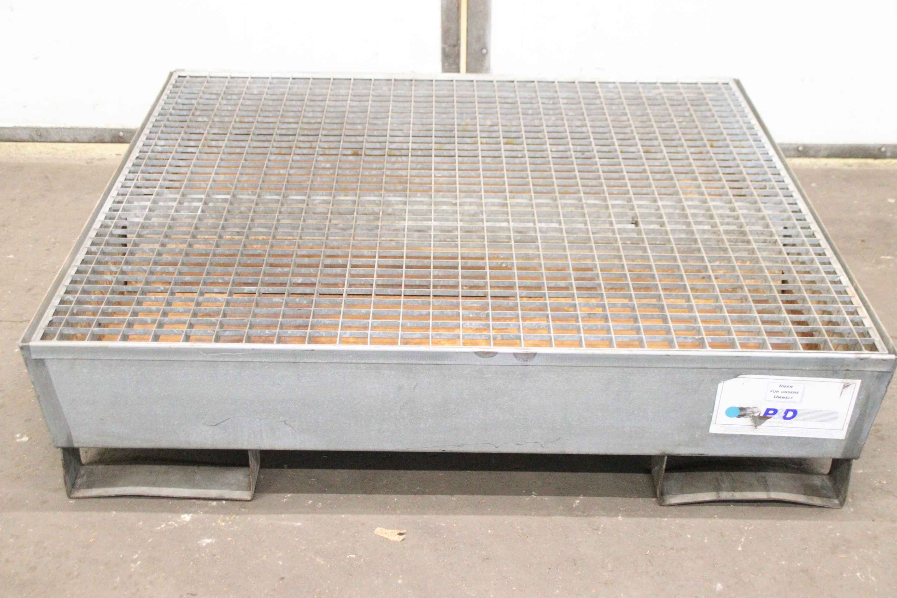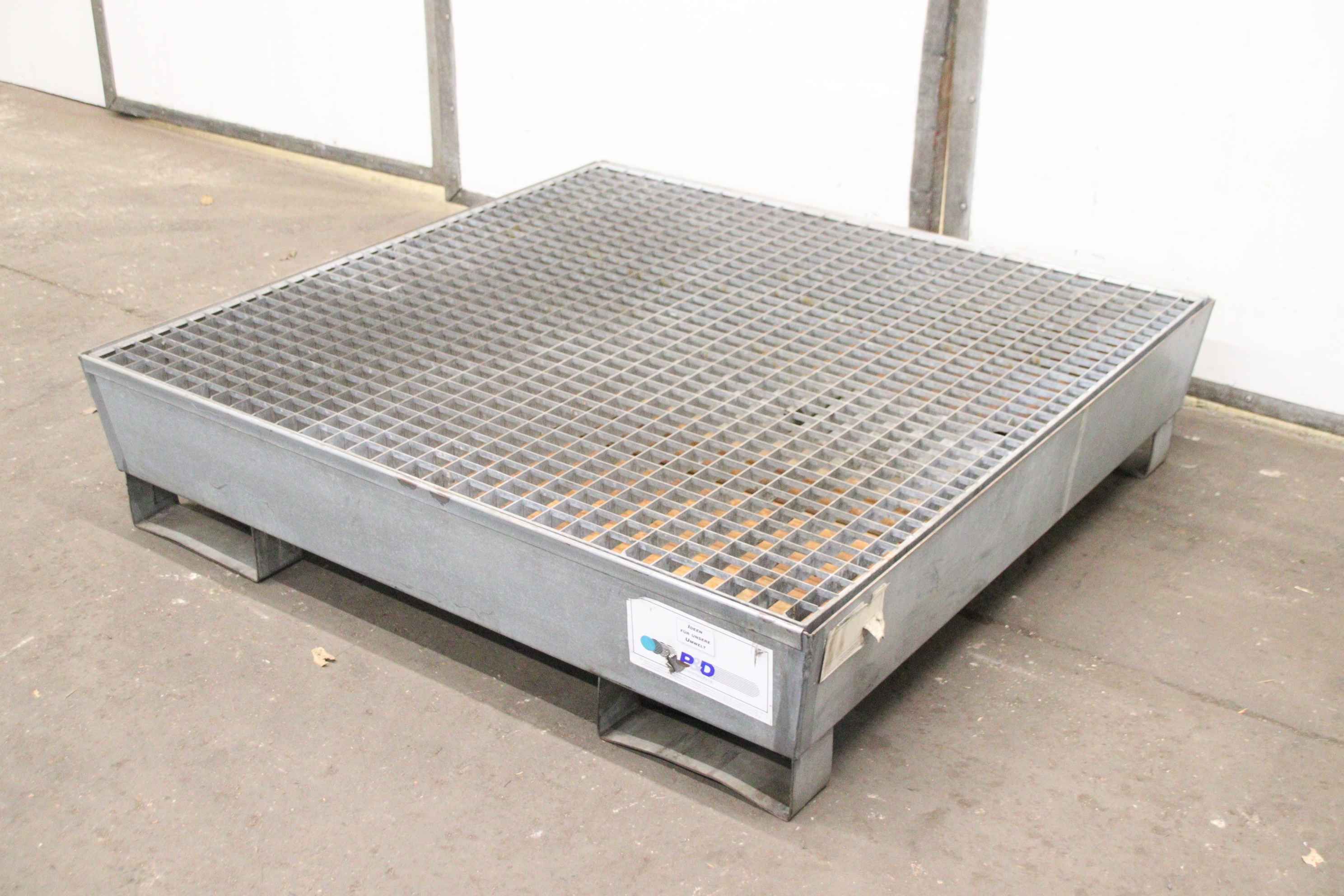 Shelf tray, spill tray, floor tray, pallet tray, collection container, spill pallet -Manufacturer: P&D, drip tray -Drip tray: Type -Collection volume: 180 liters -Load capacity: 800 kg -Grating: galvanized -Dimensions: 1210/1240/H285 mm -Weight: 493 kg