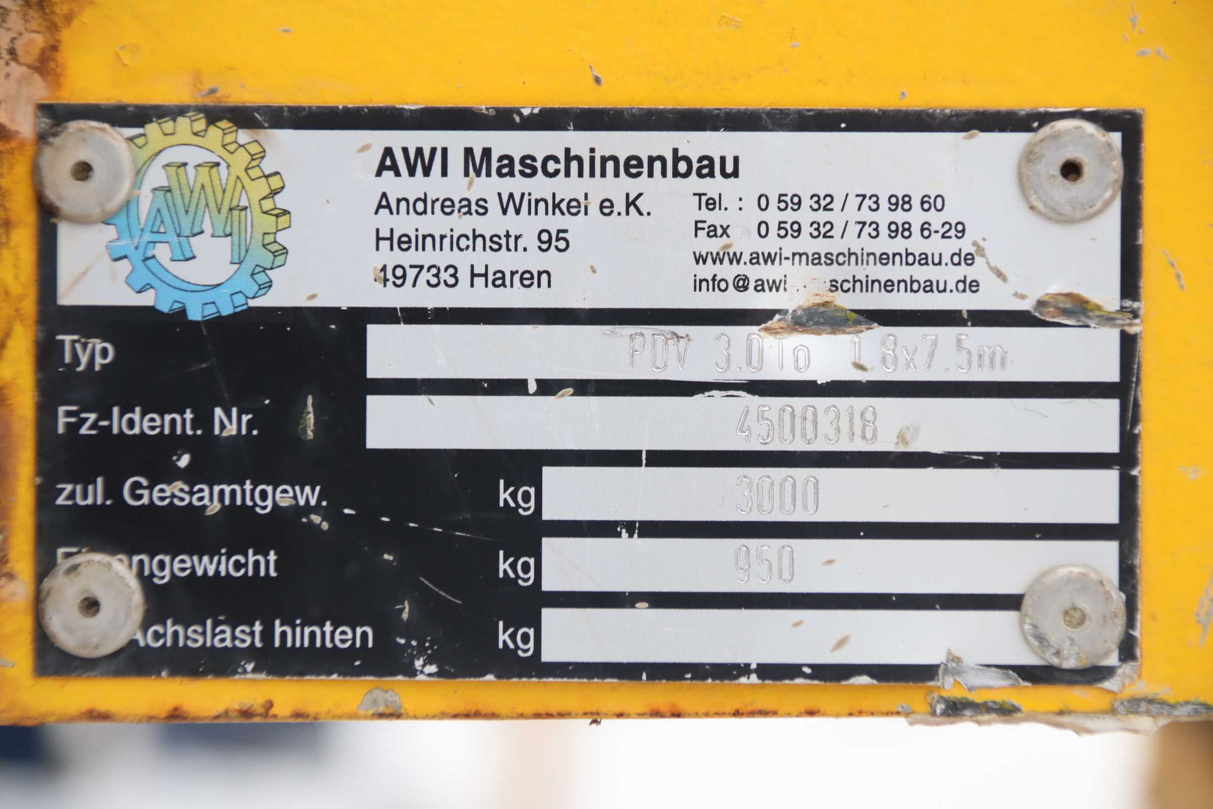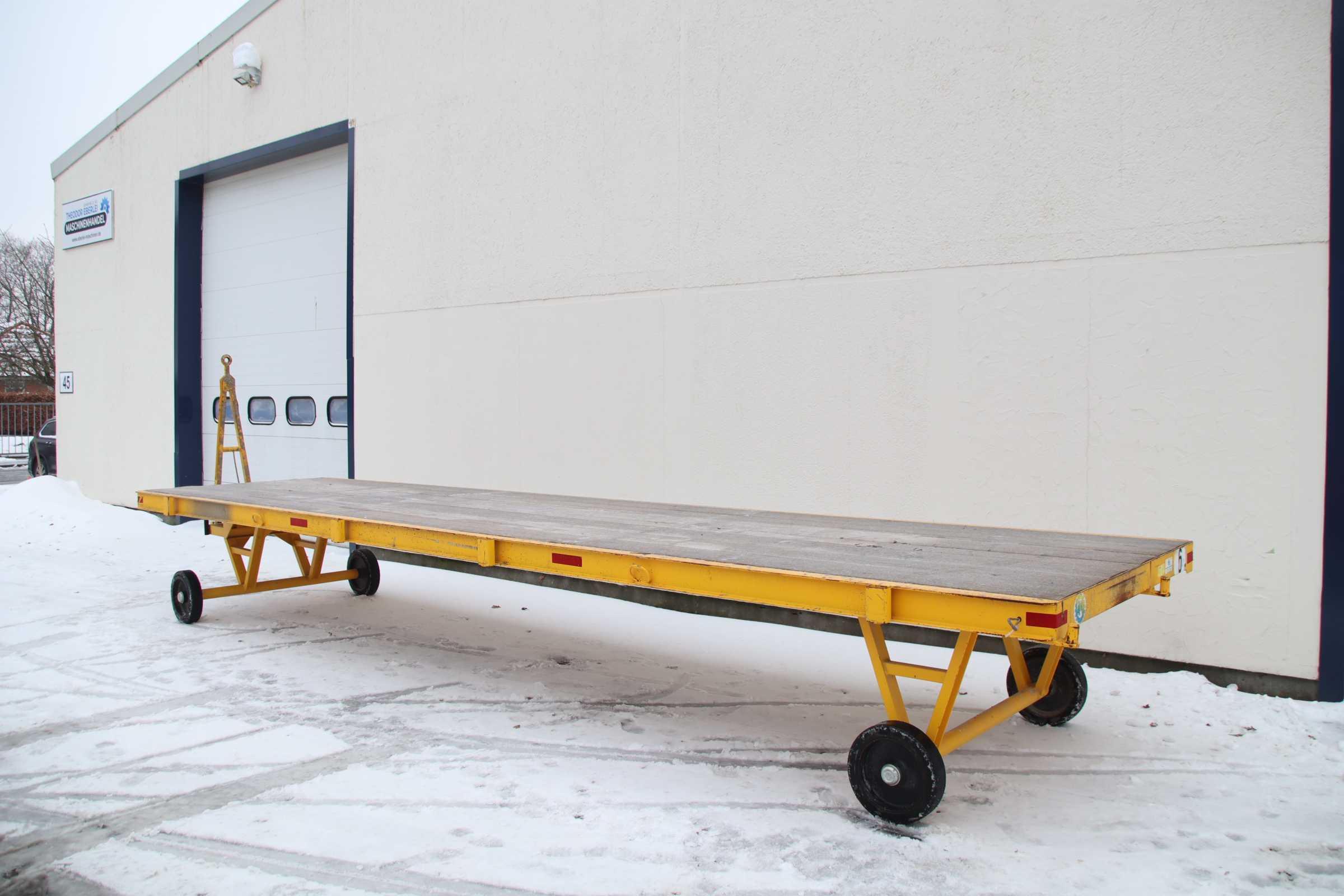 Platform trolley, transport trolley, heavy-duty trolley, table trolley, assembly trolley, industrial trailer, container dolly, heavy-duty trailer, industrial heavy-duty trailer -Manufacturer: AWI Maschinenbau, heavy-duty transport wagon with 1-axle turntable steering -Type: PDV 3.0 To 1.8x7.5 m -Platform: 7615/1800/H1000 mm -maximum weight allowed: 3 t -Tires: Solid rubber tires 415/100-305 -Overall dimensions: 9135/1860/H1000 mm -Transport dimensions: 7615/1860/H1000 mm -Weight: 860 kg