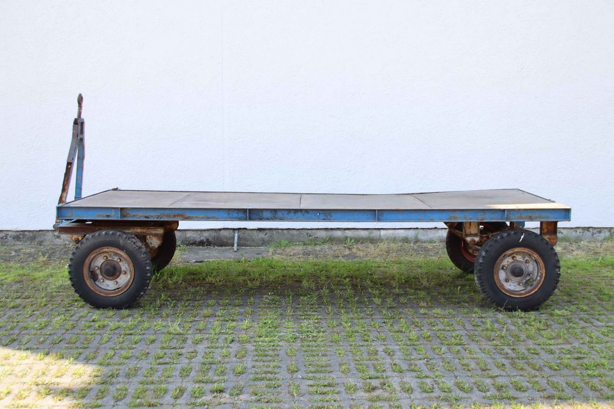 Platform trolleys, transport trolleys, heavy-duty trolleys, table trolleys, assembly trolleys, industrial trailers -Handover: in current condition as viewed -Platform: uneven, see photos -Load capacity: 1.5 t -Industrial trailer with 1-axle turntable steering, braked -Platform: 3800/1400/H790 mm, dimensions see photo technical drawing -Tires: pneumatic tires 23-5 -Transport dimensions: 4100/1400/H1650 mm -Weight: 800kg