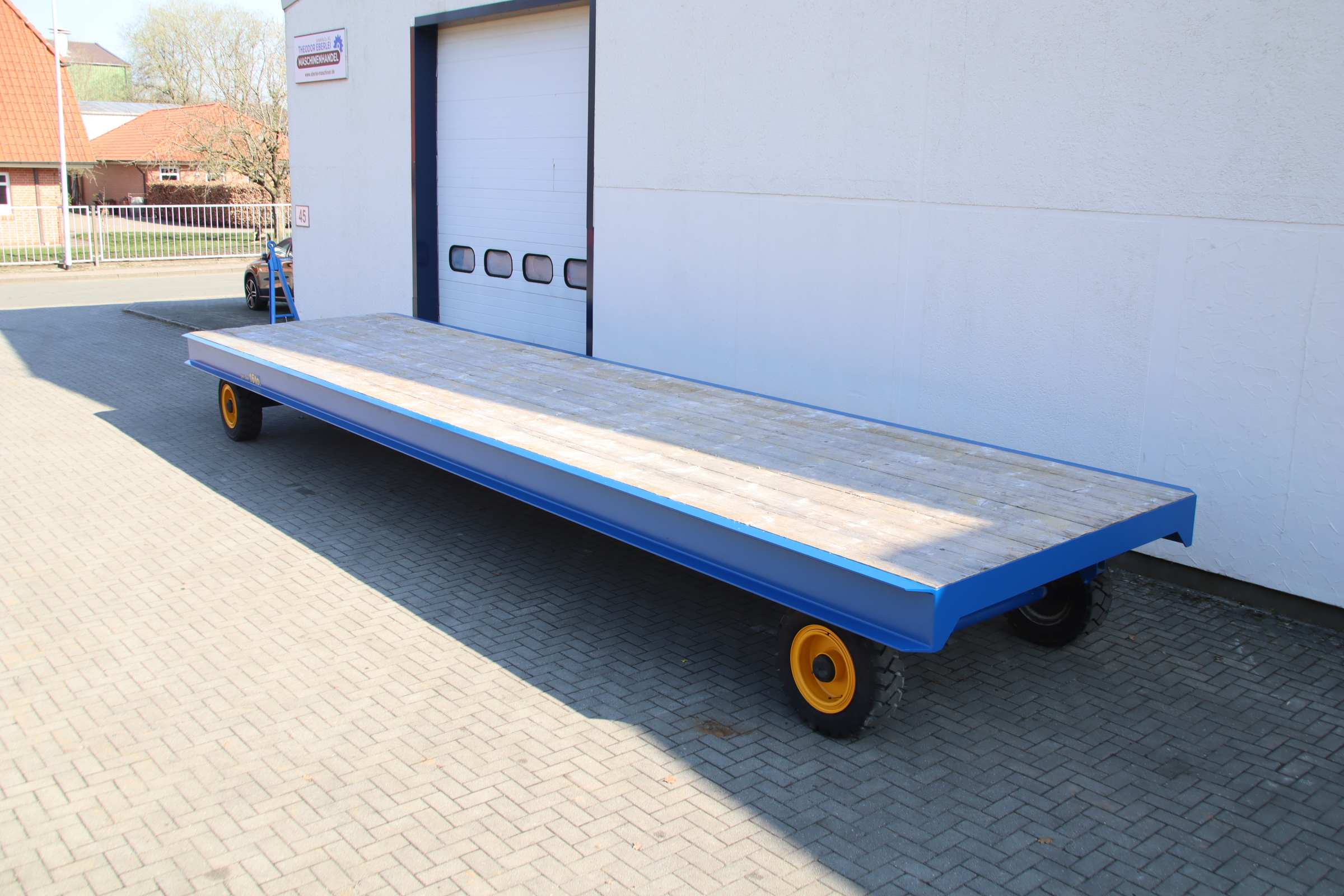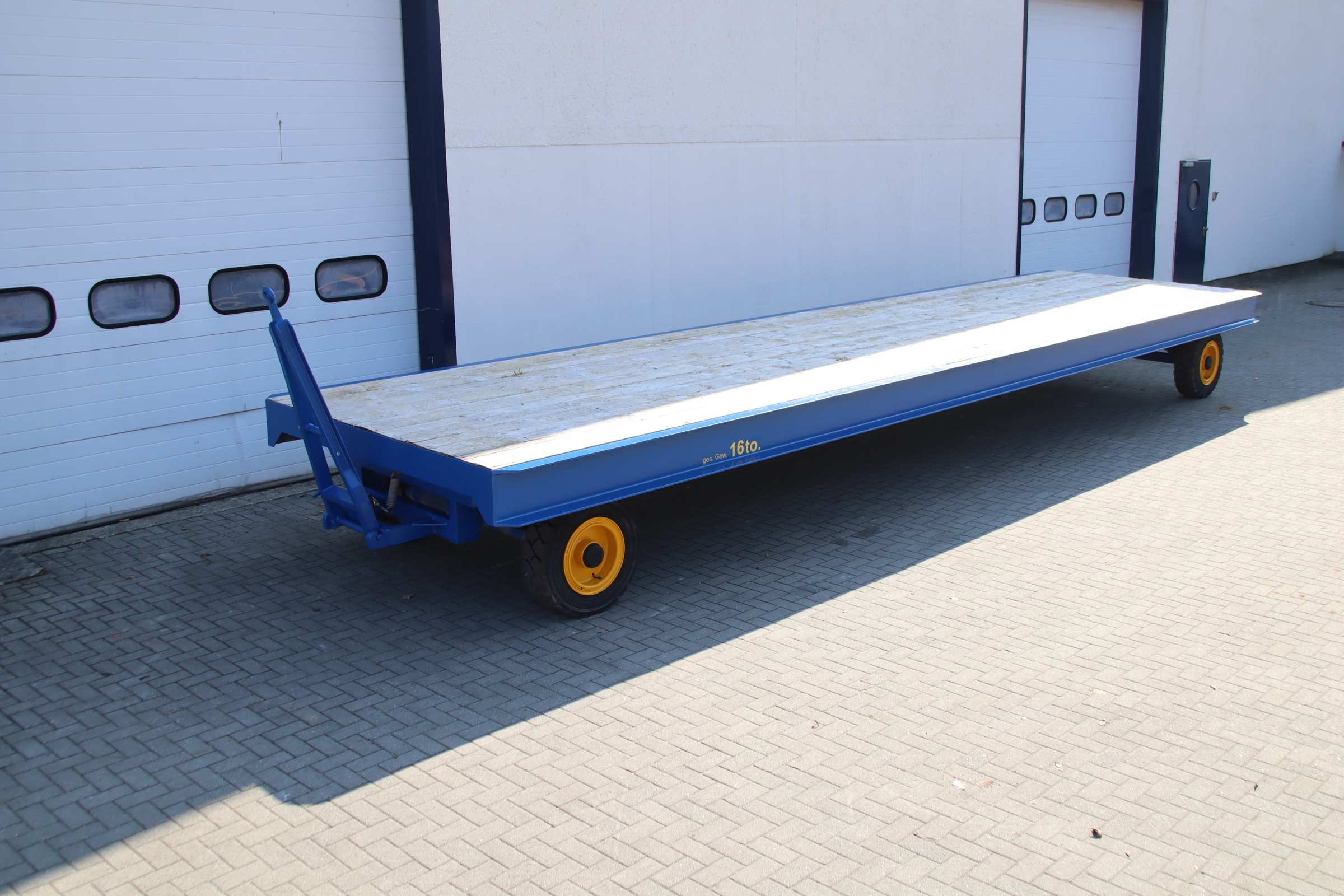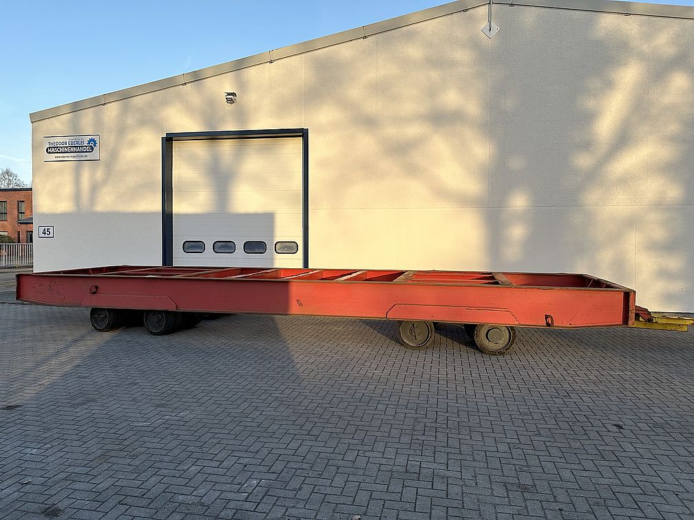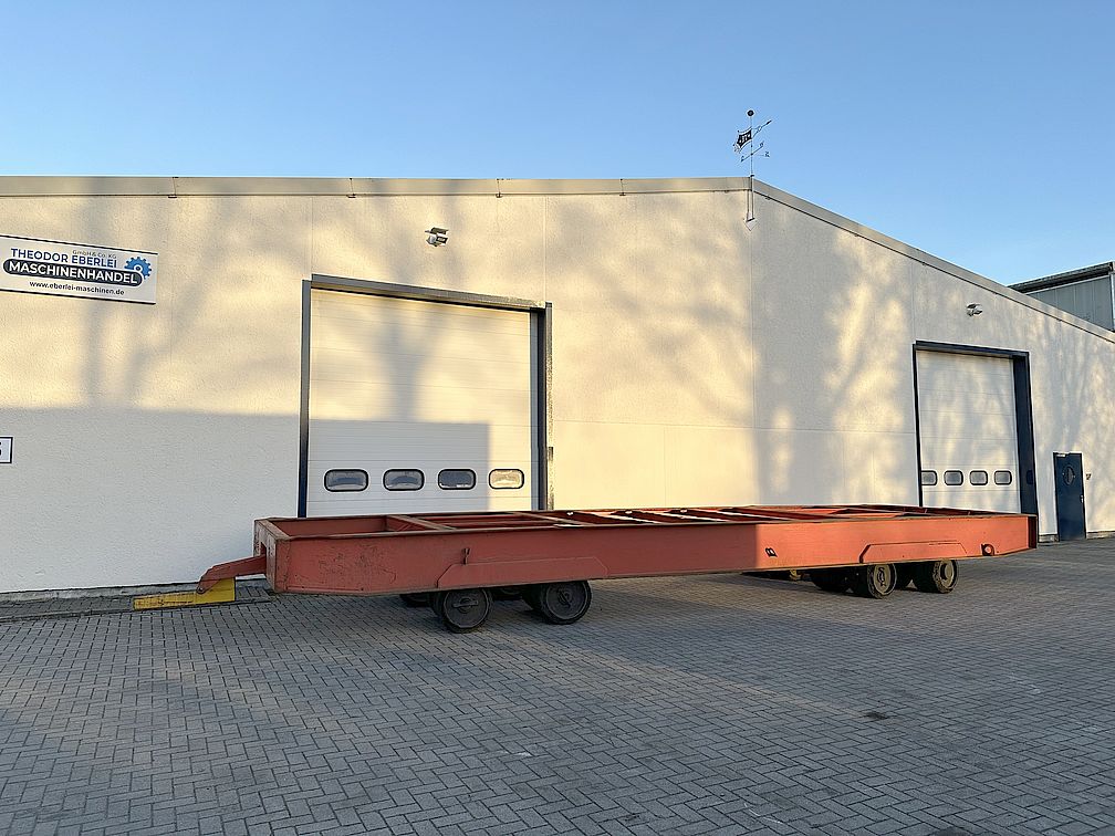 Platform trolley, transport trolley, heavy-duty trolley, table trolley, assembly trolley, industrial trailer, container dolly, heavy-duty trailer -Platform: 11,000/3,000/H1,100 mm -Load capacity: 100 tons -Steering: possible on both sides -Drawbar length: 1500 mm -Drawbar eye: Ø 50 mm -Number of wheels: 32 pieces -Wheel size: 646/200-480 -Overall dimensions: 12,300/3,000/H1,100 mm -Weight: 12960 kg -Handover: in its current condition as inspected -Note: Check the condition of the wheels