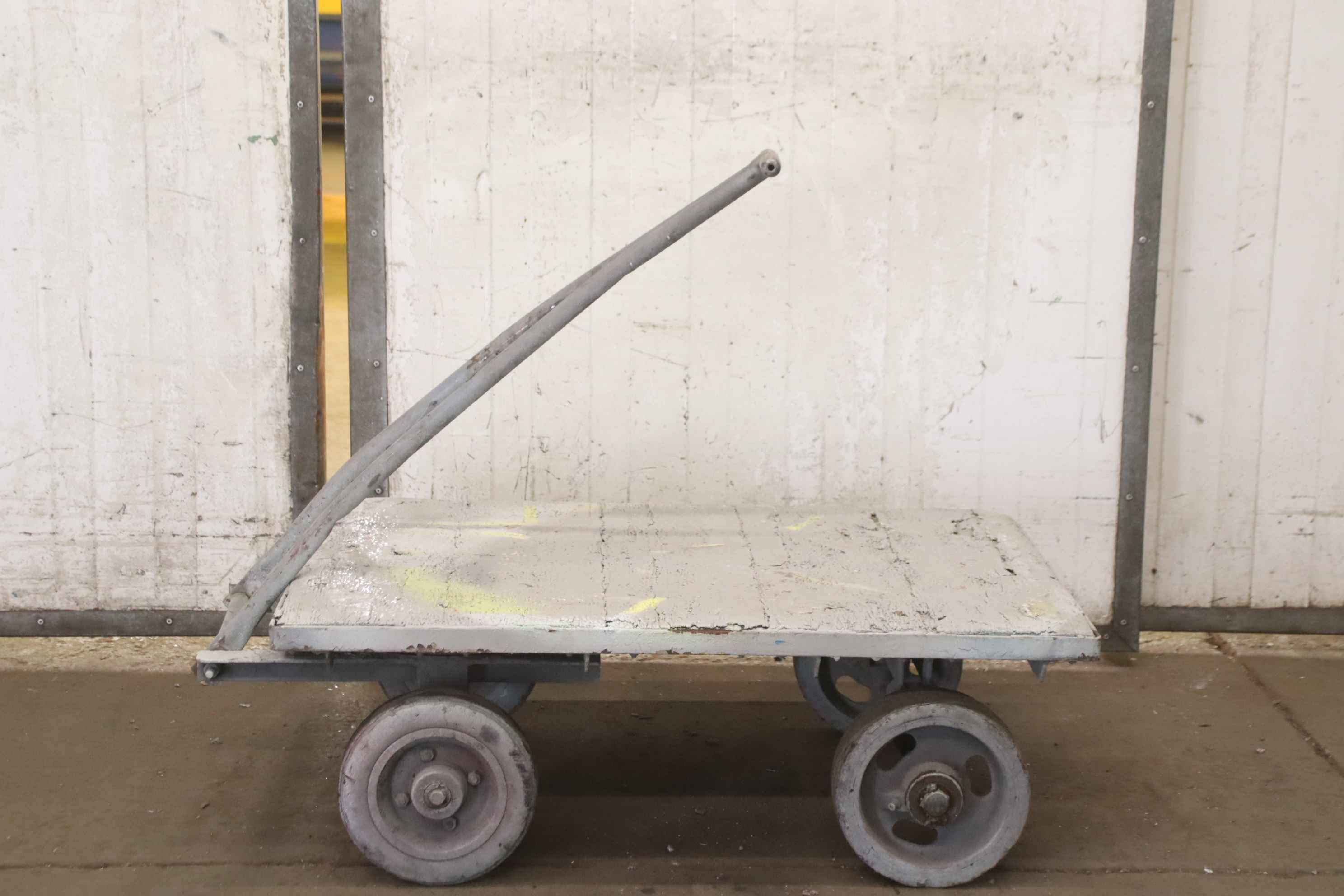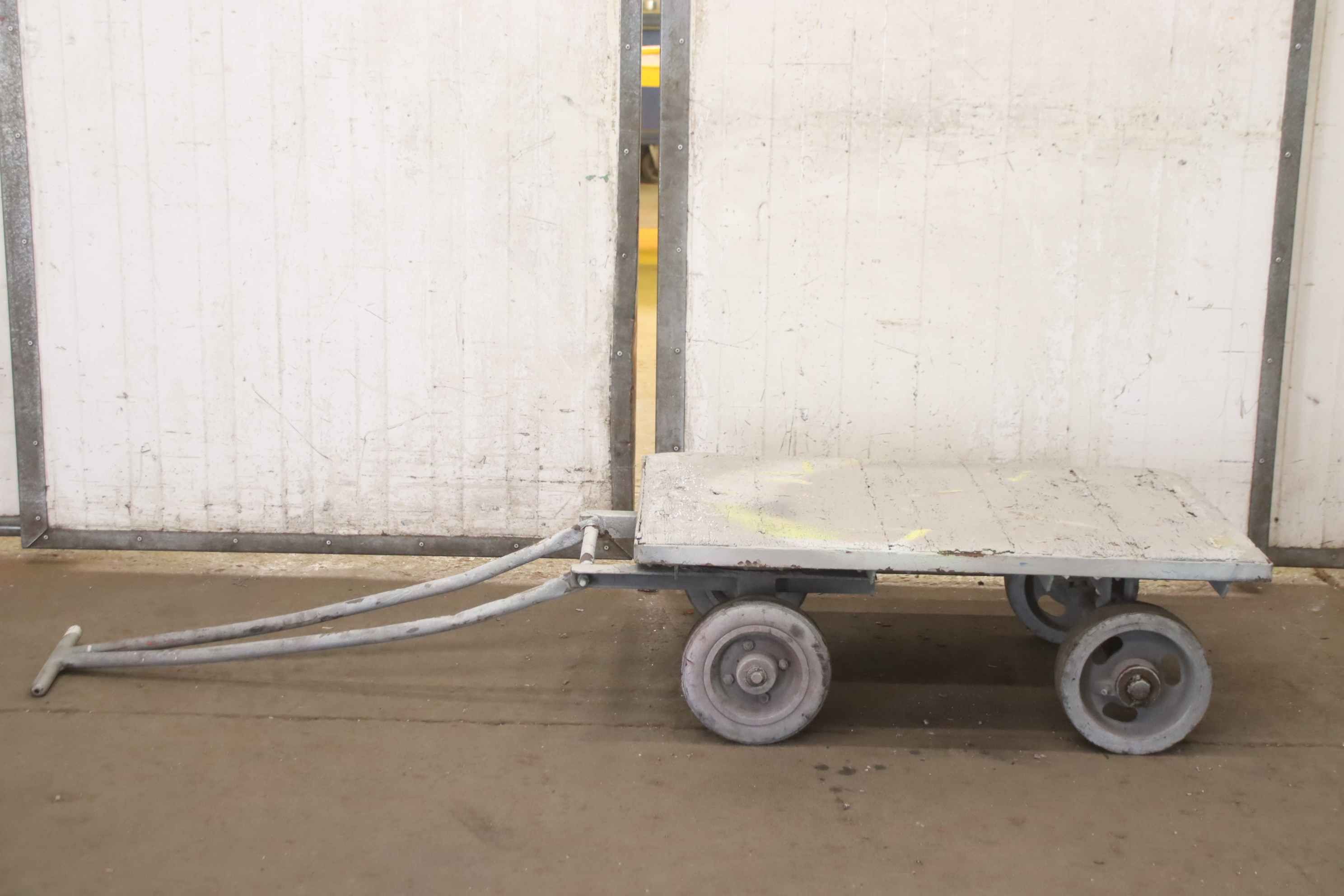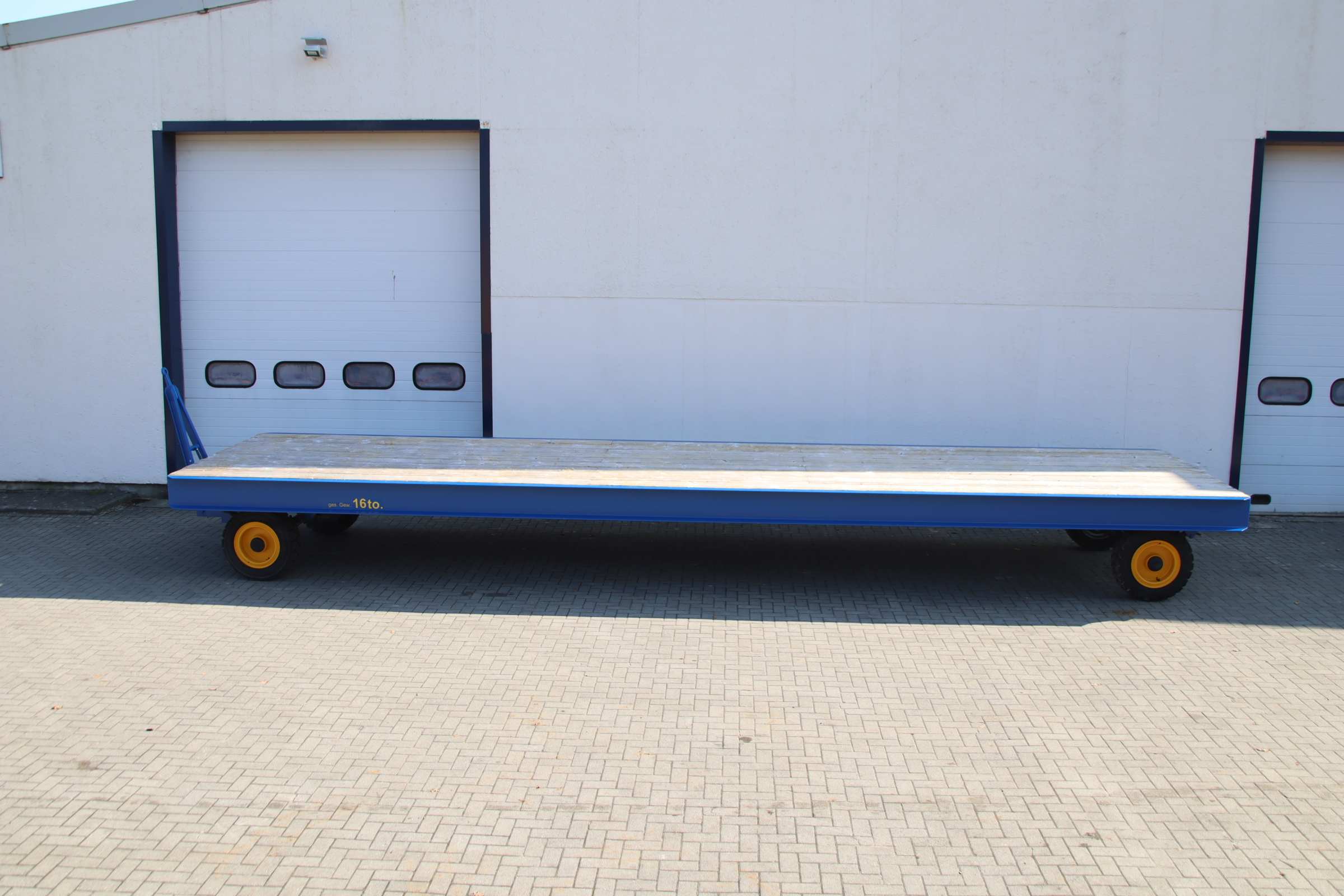 Platform trolley, transport trolley, heavy-duty trolley, table trolley, assembly trolley, industrial trailer, container dolly, heavy-duty trailer -Platform: 11,000/3,000/H1,100 mm -Load capacity: 100 tons -Steering: possible on both sides -Drawbar length: 1500 mm -Drawbar eye: Ø 50 mm -Number of wheels: 32 pieces -Wheel size: 646/200-480 -Overall dimensions: 12,300/3,000/H1,100 mm -Weight: 12960 kg -Handover: in its current condition as inspected -Note: Check the condition of the wheels