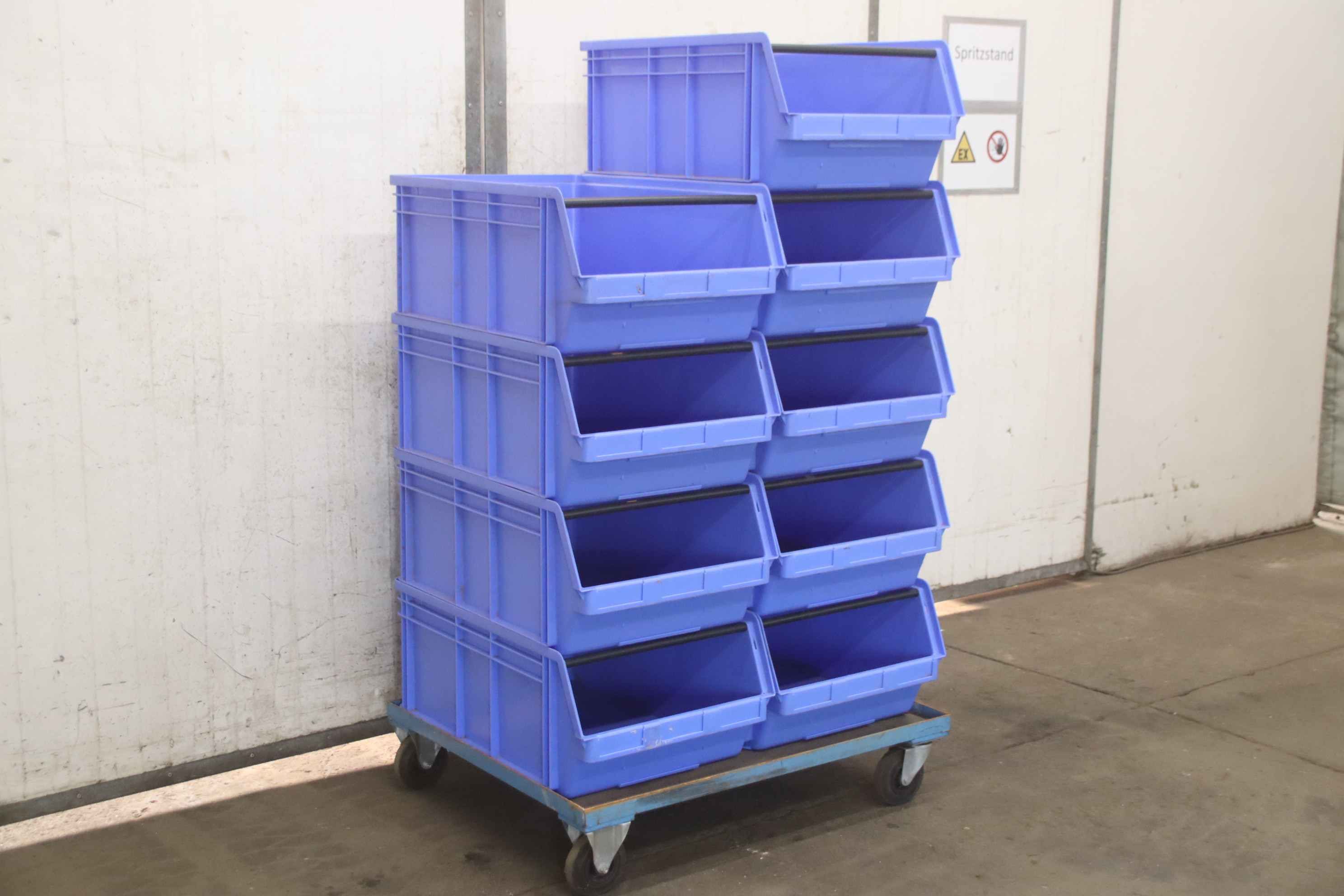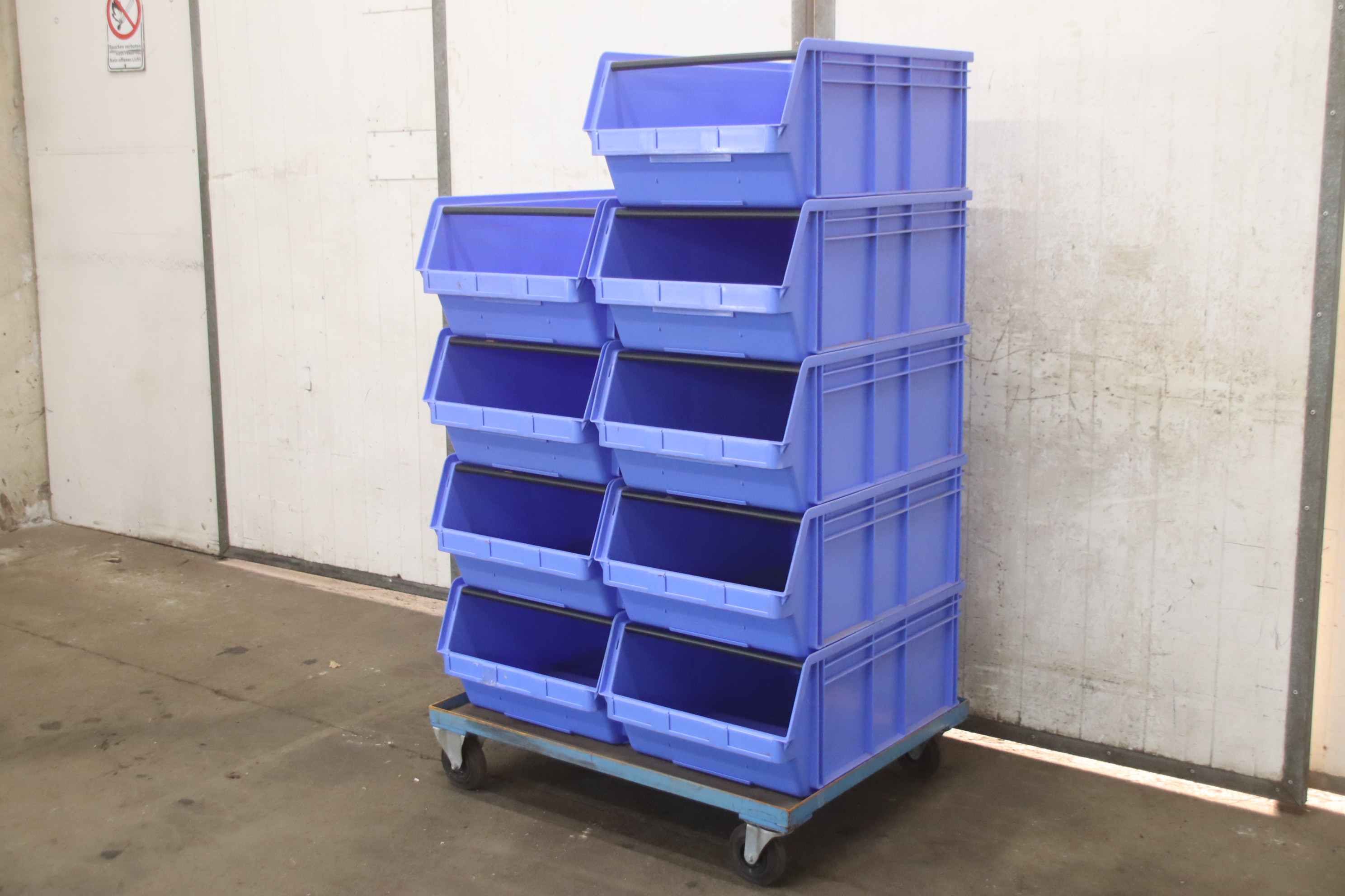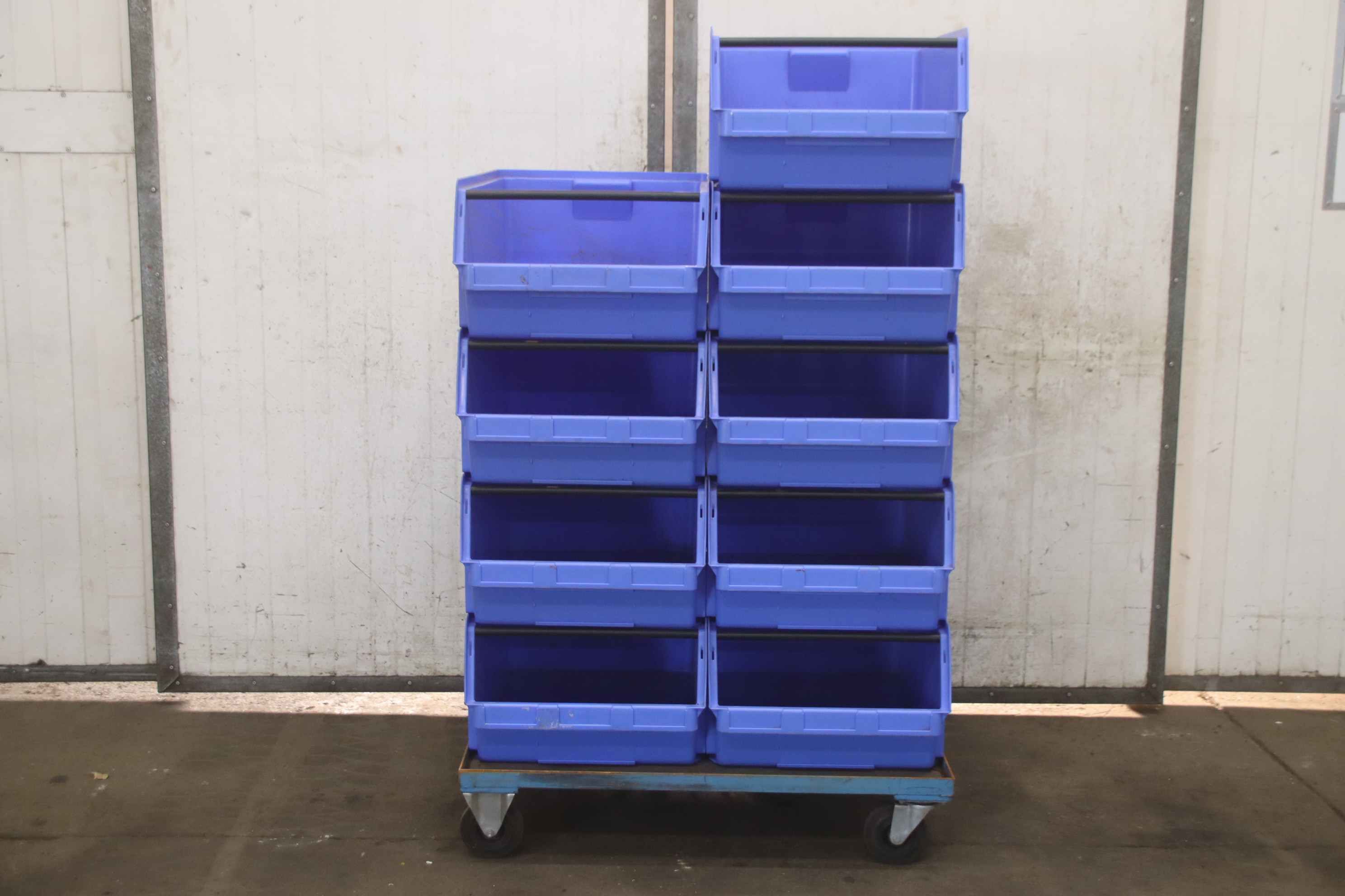 Tier trolleys, transport trolleys, shelf trolleys, sorting trolleys, order picking trolleys, mobile racks, support arm trolleys-Magazine trolley: transport trolley with visible storage boxes-Transport trolley: 950 x 750 mm-Open storage boxes: 9 pieces 715 x 465 x H300 mm-Levy/Price: complete-Total dimensions: 950/750/H1610 mm-Weight: 67 kg