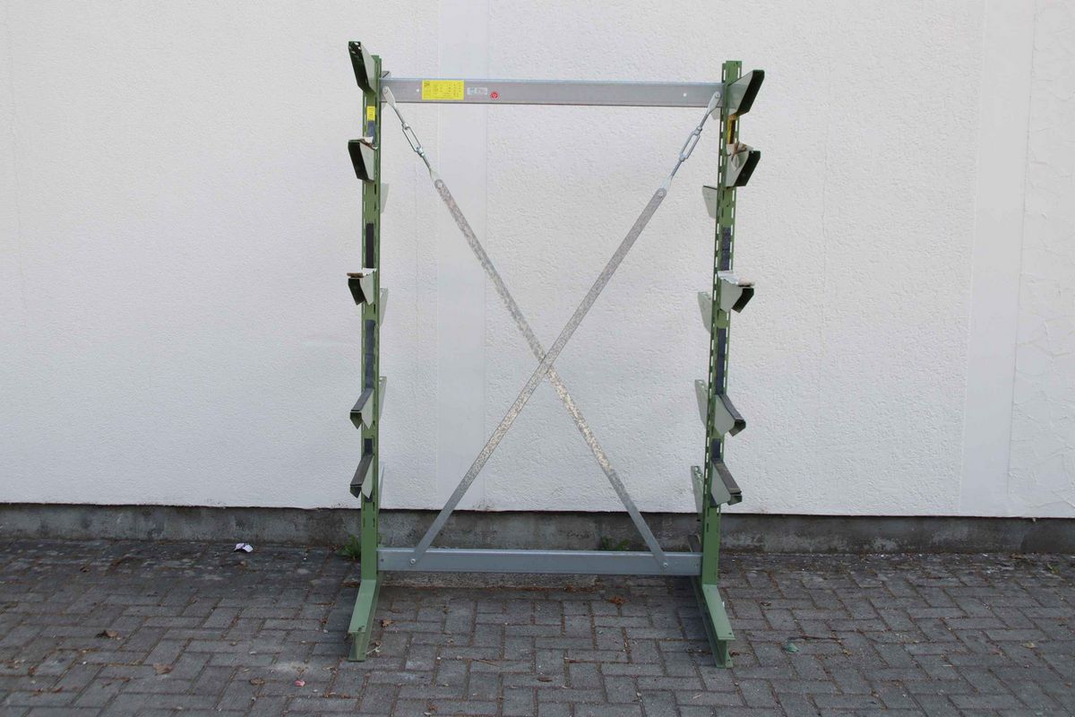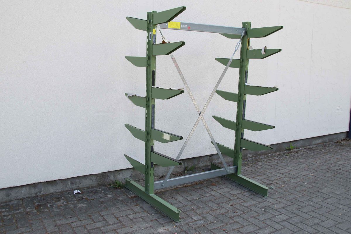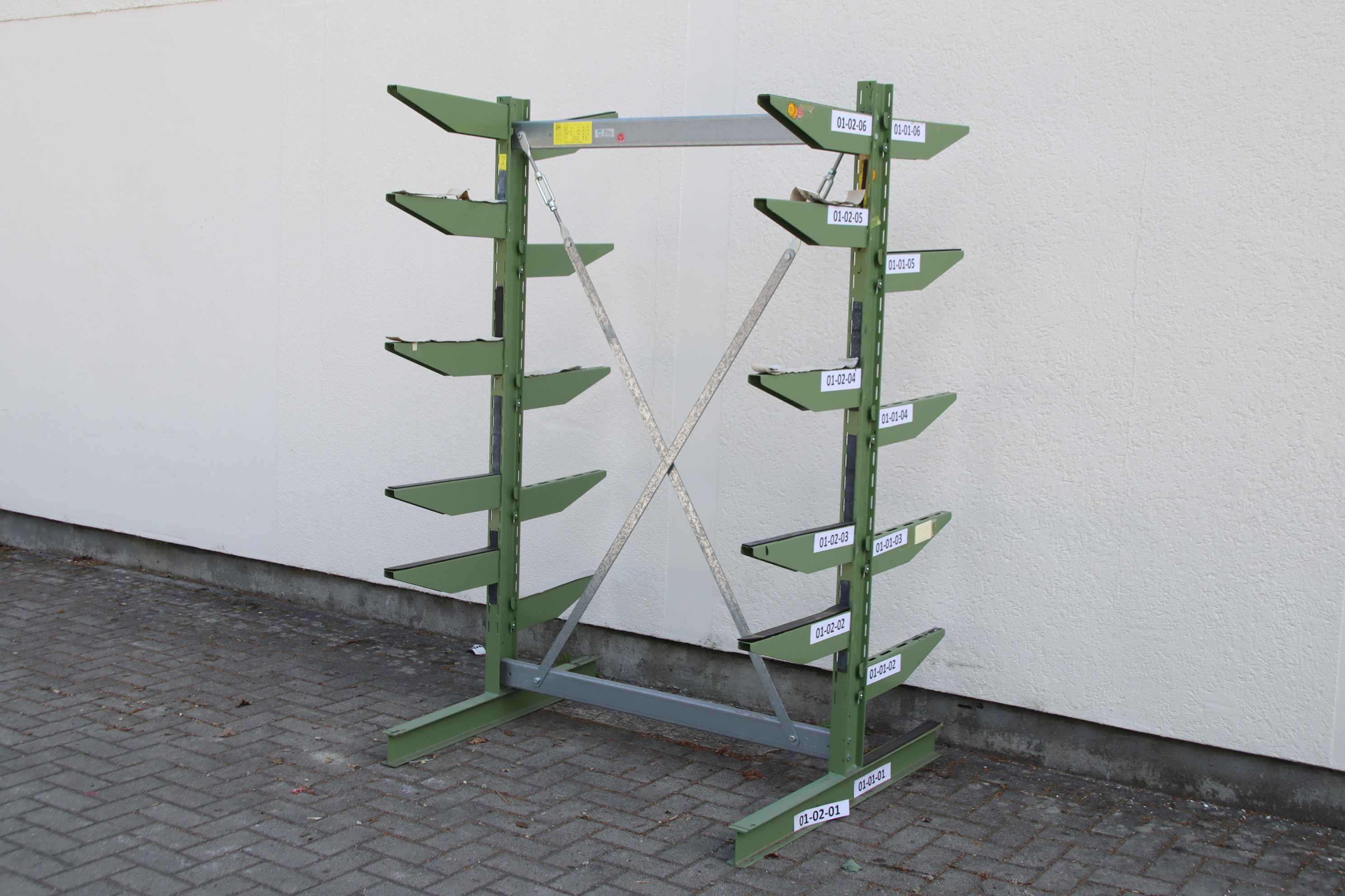 Cantilever rack, heavy-duty rack -Manufacturer: LBE, cantilever rack base field double-sided -Cantilever arms: 5 levels per side, length 500 mm -Compartment height: variably adjustable -Load capacity: 1-sided 630 kg, see photos type plate -Quantity: 1x shelf available -Dimensions: 1300/1180/H1985 mm -Weight: 80 kg