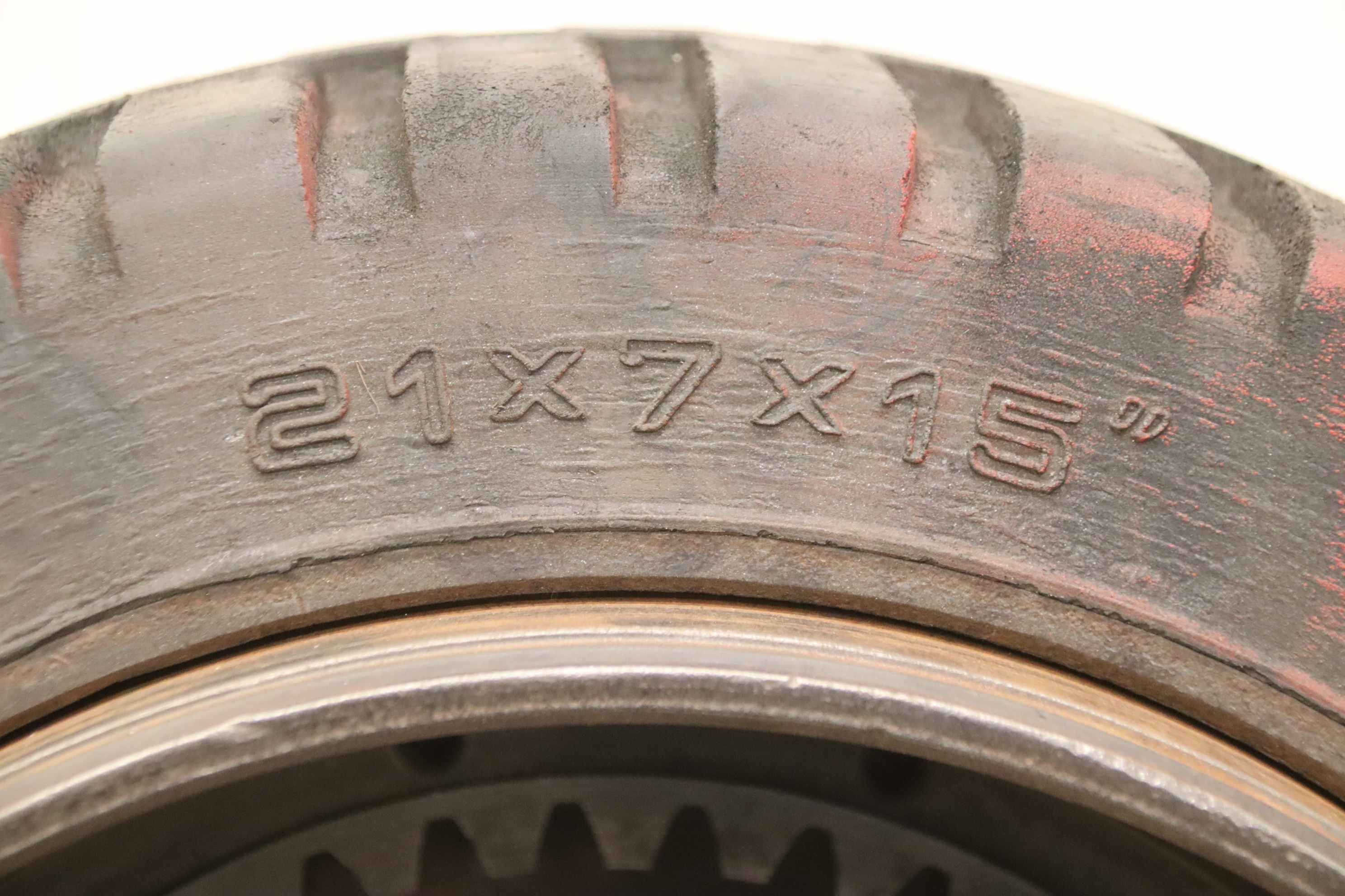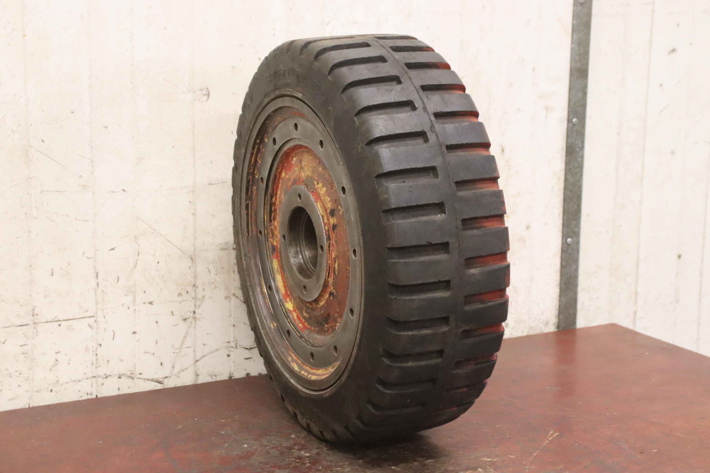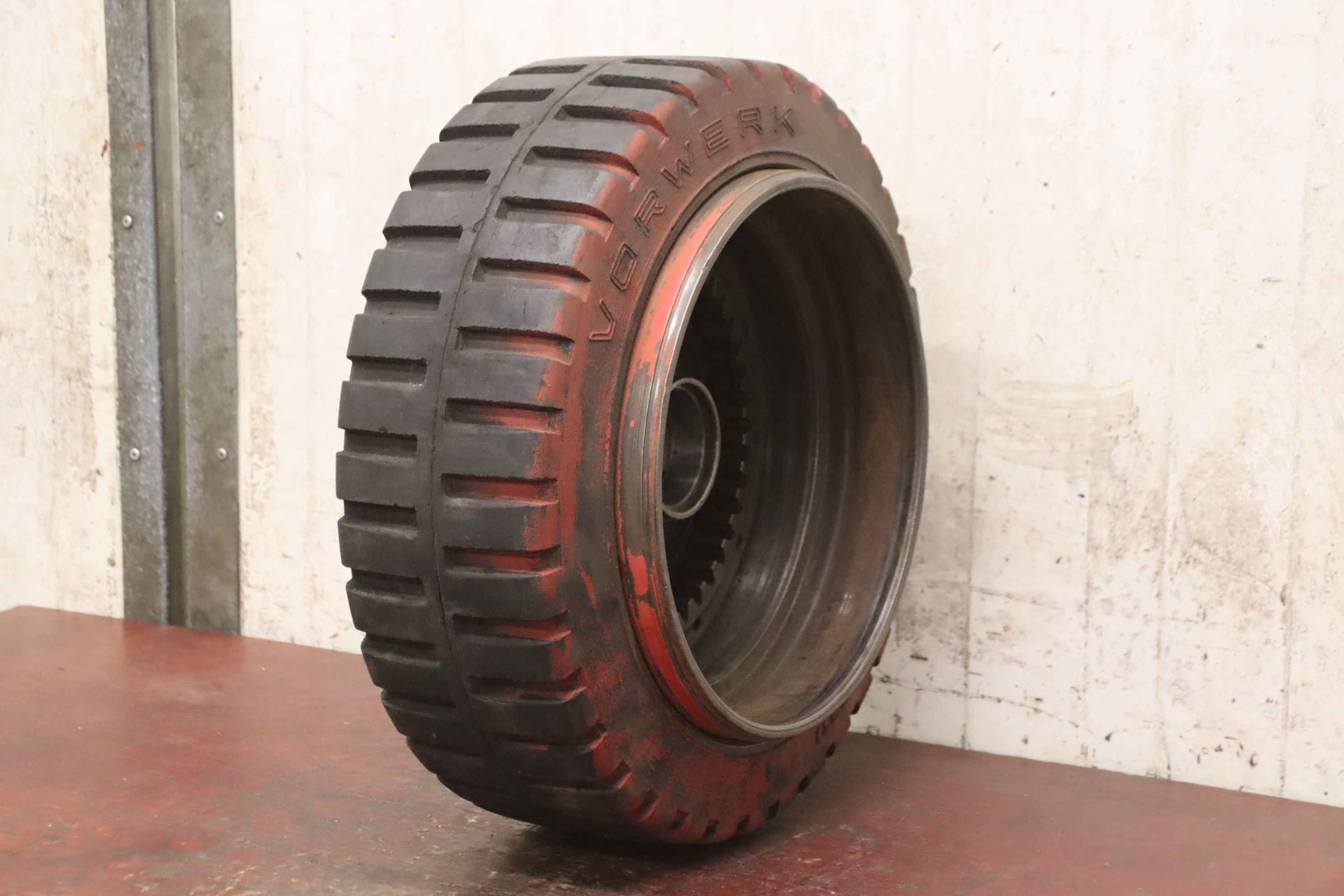 Tires, solid rubber tires, forklift tires, complete wheels -Manufacturer: Vorwerk, solid rubber tires with rim, 2 pieces -Tire size: 21x7x15 / (534x178x381) -Rim: Type 018 181 99 01 MH -Hub: Cone Ø 68-74 mm -Hole circle: Ø120 mm M8 / Ø300 x 11 mm -Gear ring: Dimensions see photos / technical drawing -Price/Fee: complete -Dimensions each: Ø 534 x 205 mm -Weight: 91 kg/piece