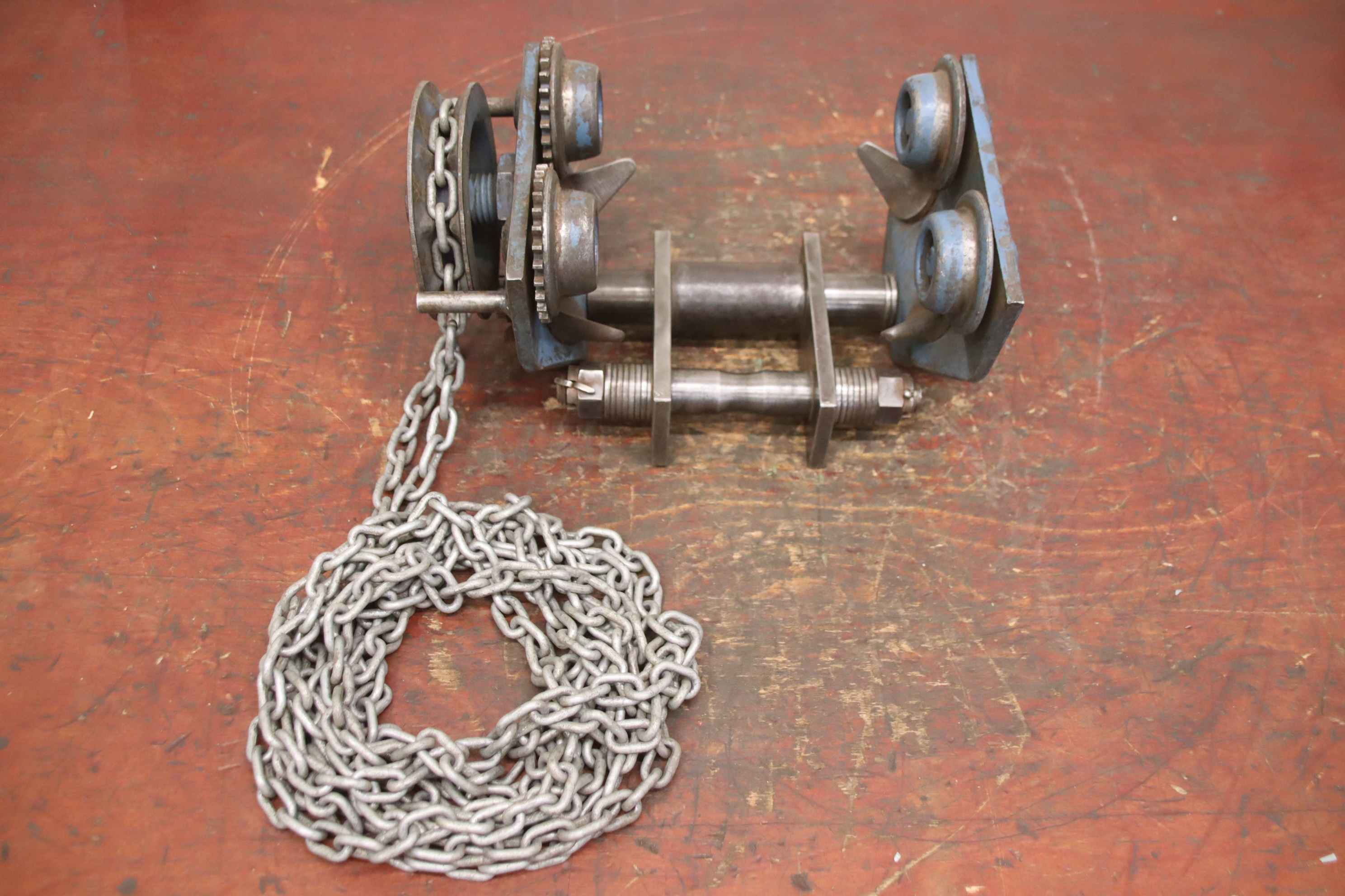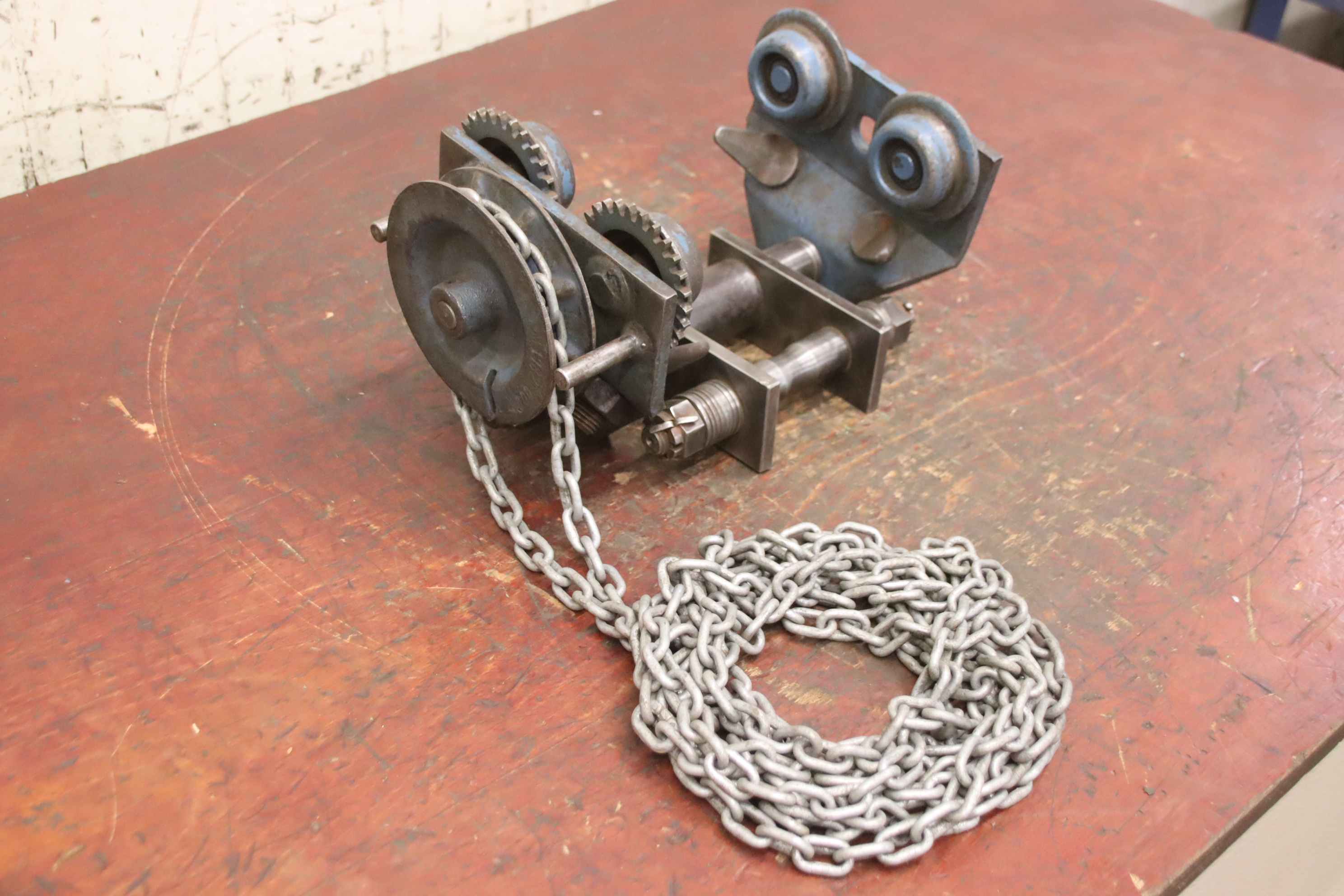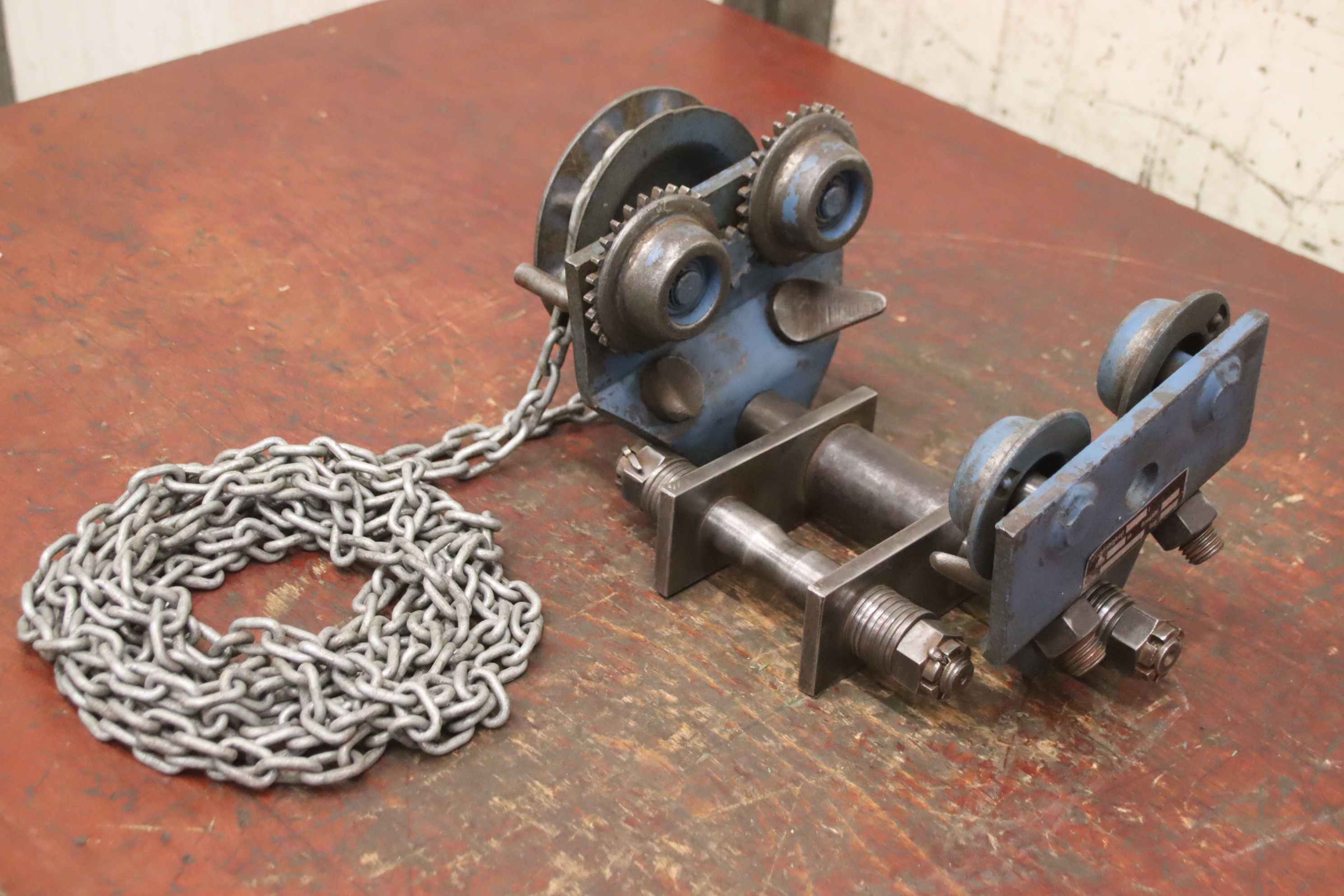 Manual trolley, push trolley, crane trolley, trolley drive, crane drive, crane undercarriage, trolley-Manufacturer: Gedi, crane chassis with chain drive-Carrier width: adjustable from 90 to max. 260/300 mm-Load capacity: 1500 kg-Chain length 2.5 m / 2.6 m-Number: 2x drives available-Price: per piece-Dimensions: 360/200/290 mm / 380/200/195 mm-Own weight: 16 kg / 15.7 kg