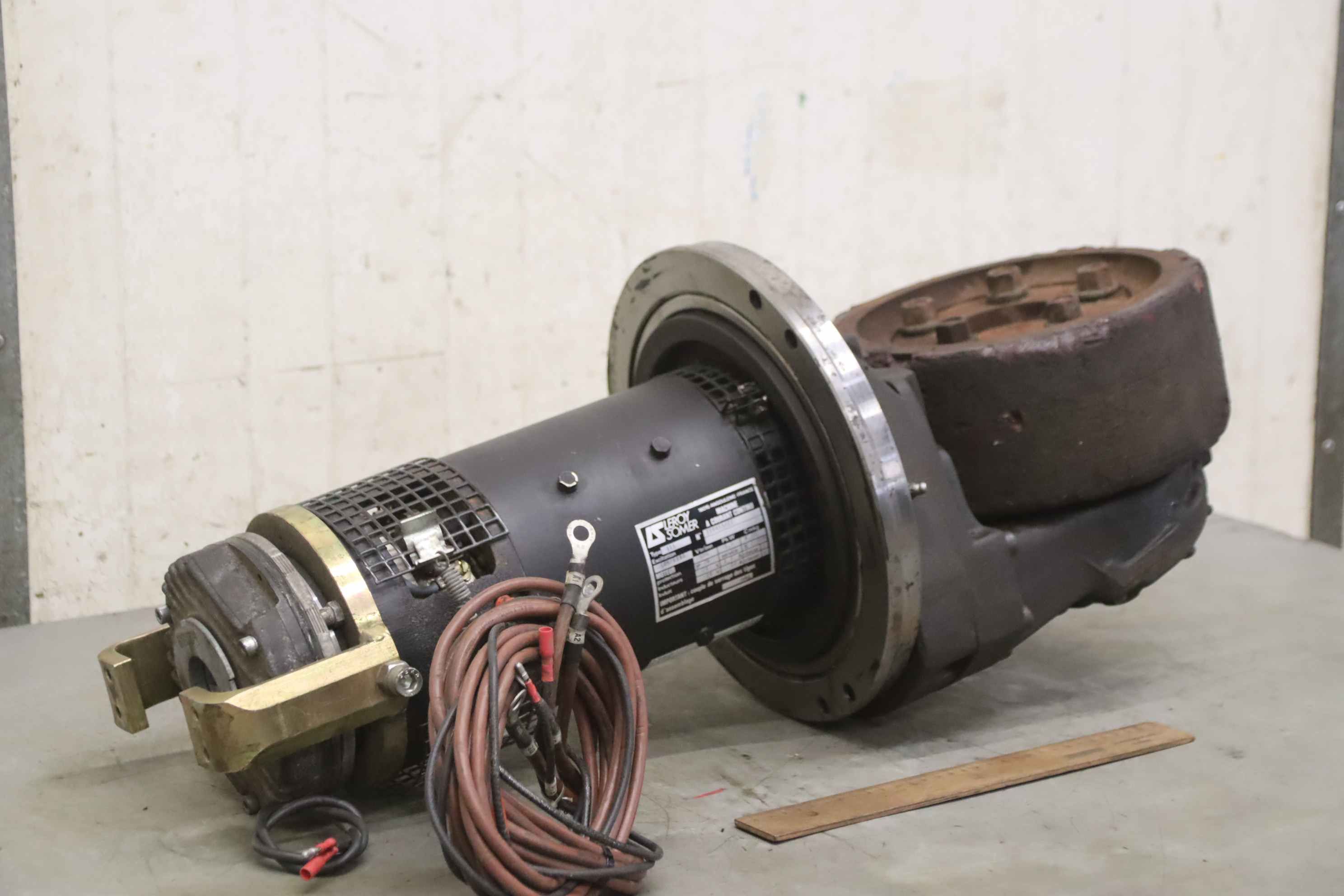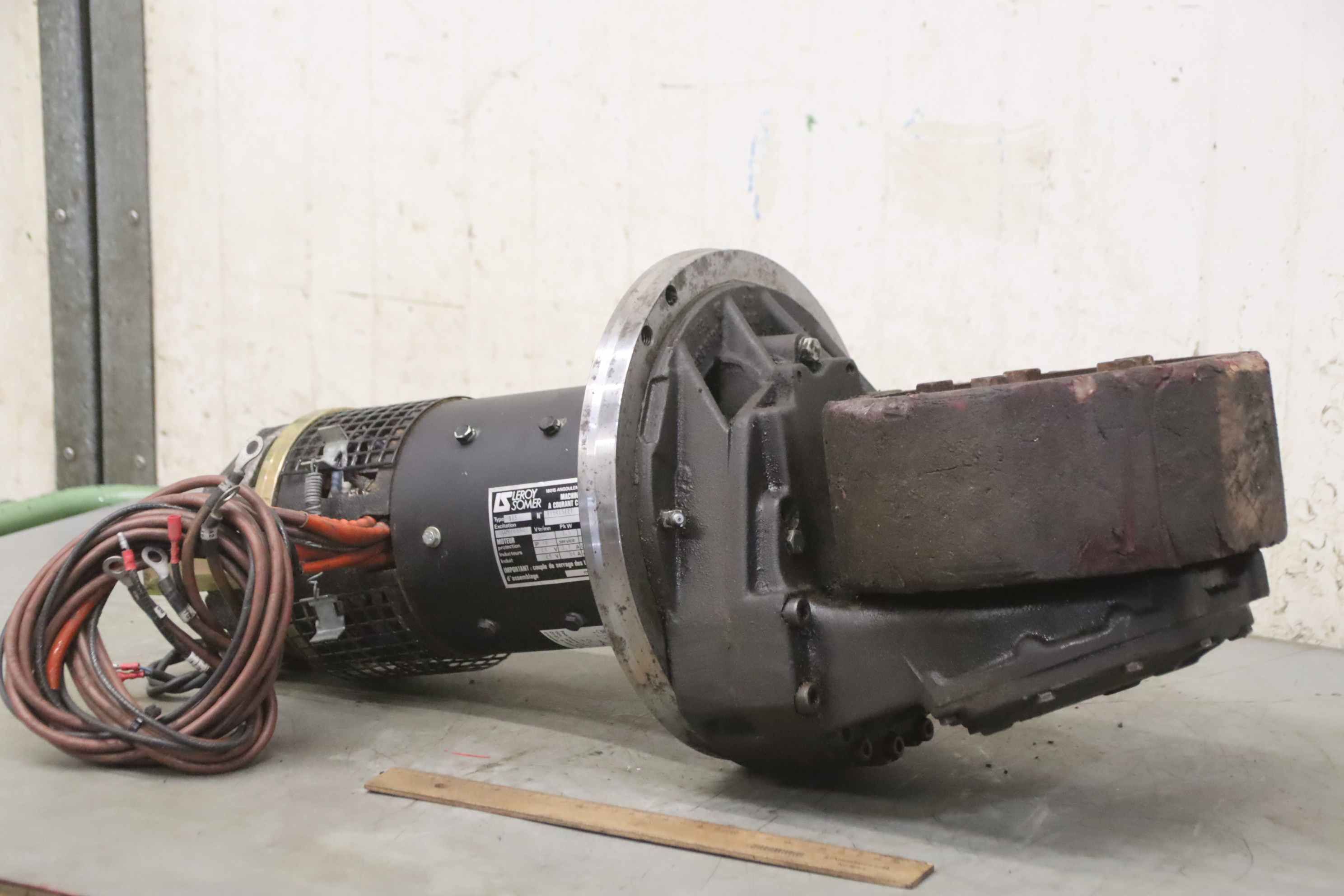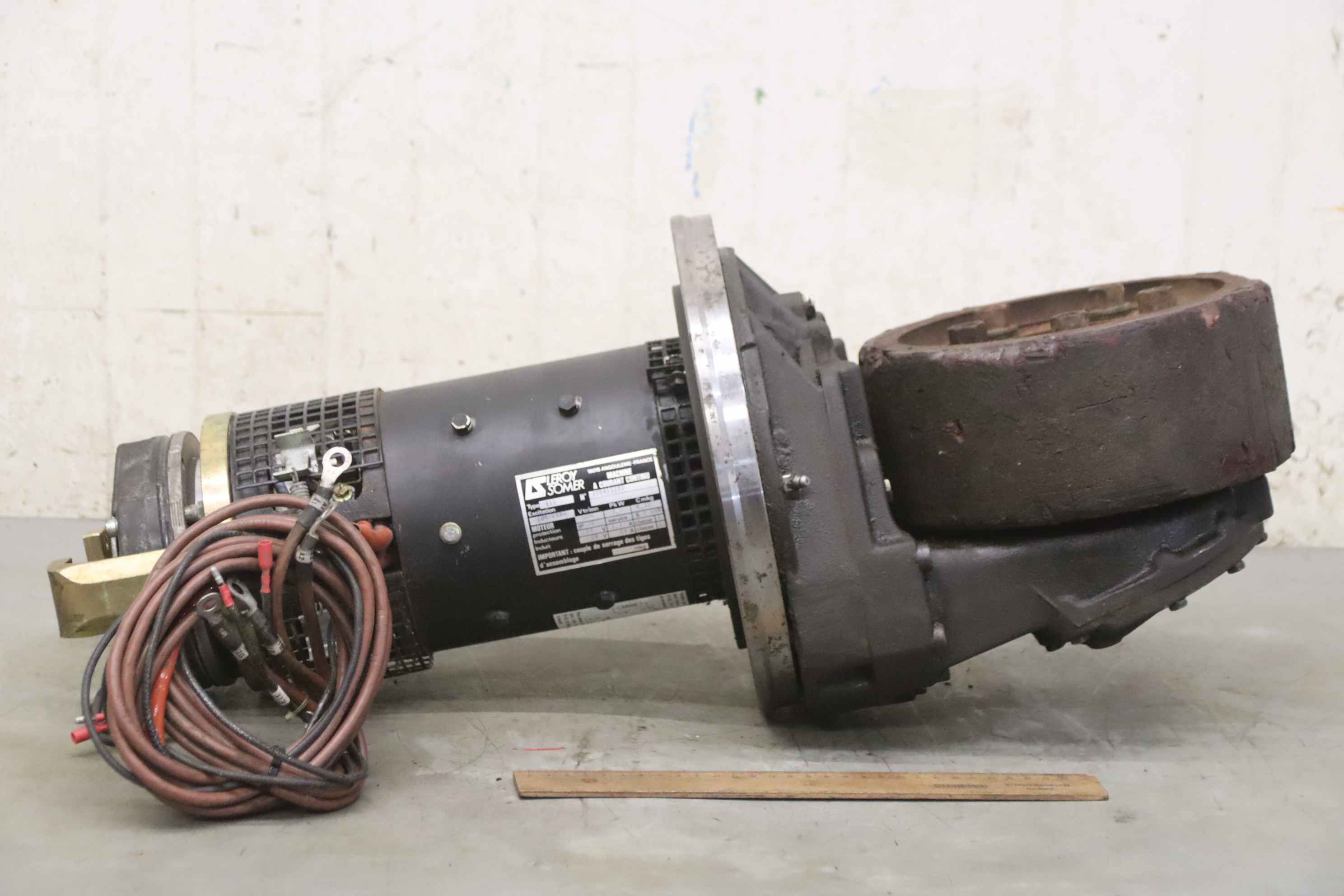 Chassis, electric motor, DC motor, traction motor, drive motor-Manufacturer: Rapid, chassis drive motor faus electric stacker RVT 2500-Drive motor::LS Leroy Somer type T15 24V 2.0 kW-Motor brake: Lenze-Individual components: see photos-Dimensions: 290/285/H700 mm-Weight: 76 kg