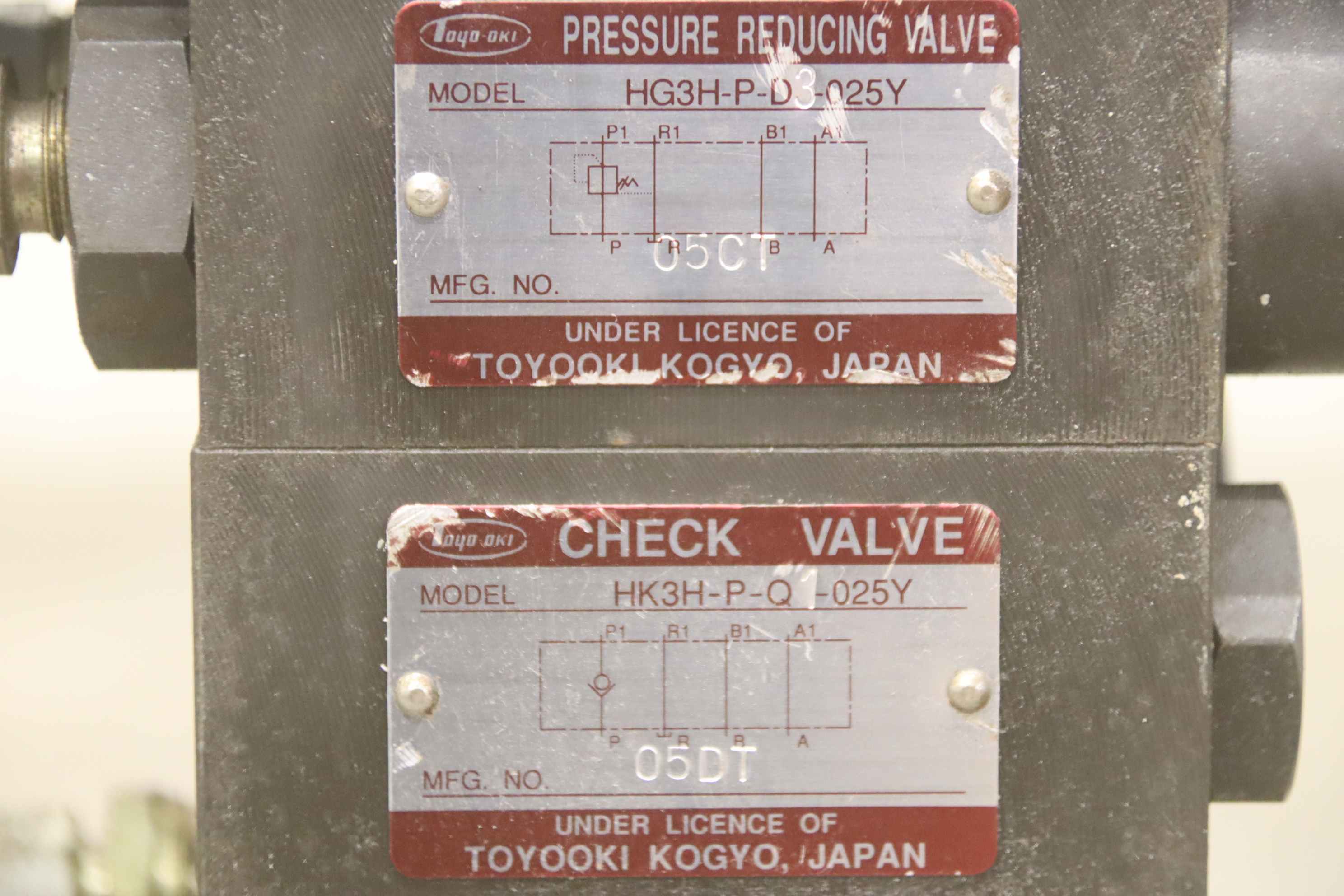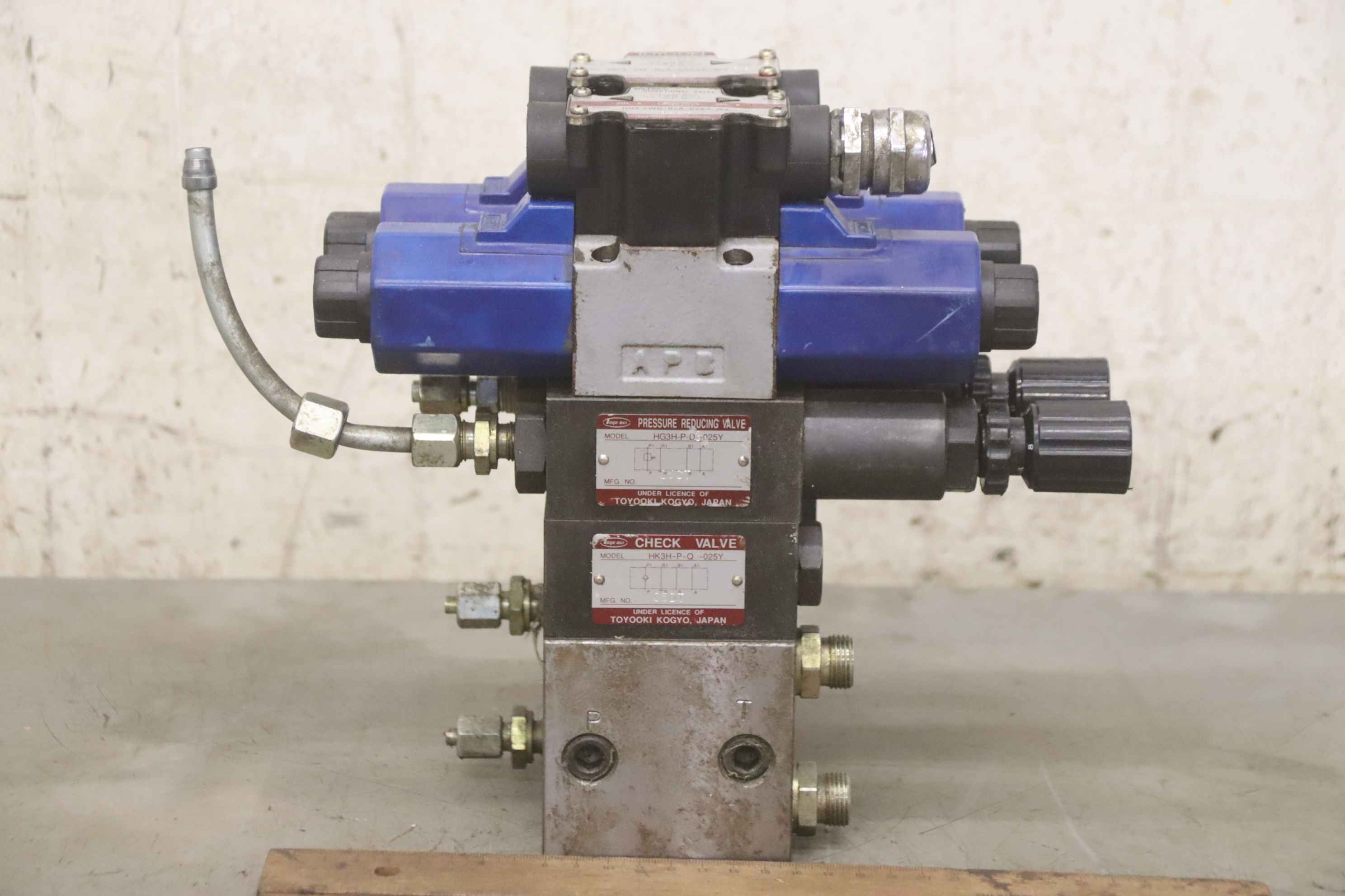 Hydraulic pump, hydraulic power unit, control block, hydraulic control block, control unit, control valve, servo valve -Manufacturer: Toyoki, hydraulic control block from CNC machining center Santenberg GTC S 2 -Control valves: HD3-2W-BcA-025AY-WYD2 / HD3-2WD-BcA-025A-WYD2 -Pressure reducing valve: HG3H-P-D3-025Y -Check Valve: HK3H-P-Q1-025Y -Individual components: see photos -Submission/Price: complete -Dimensions: 300/135/H250 mm -Weight: 14.8 kg