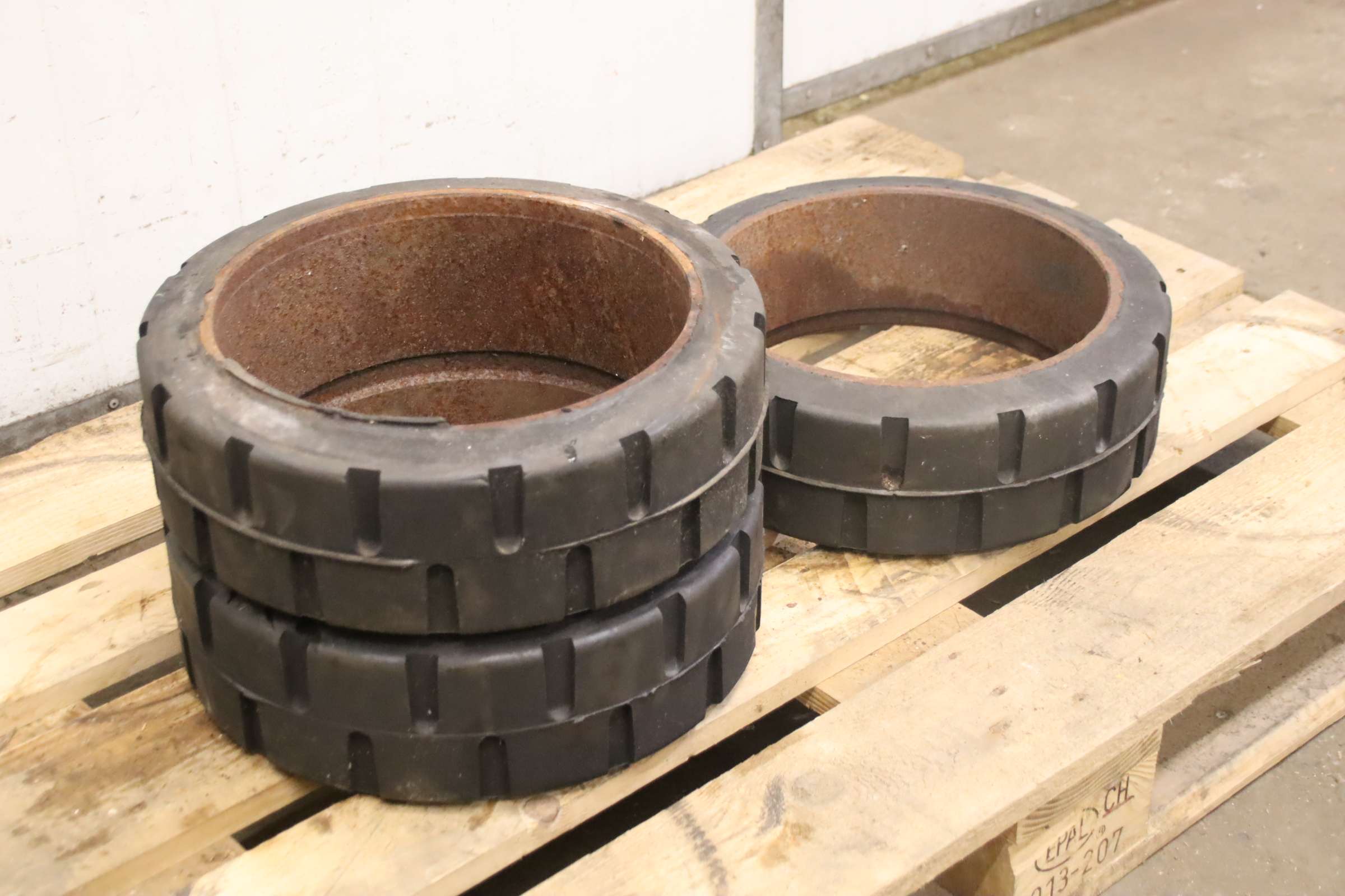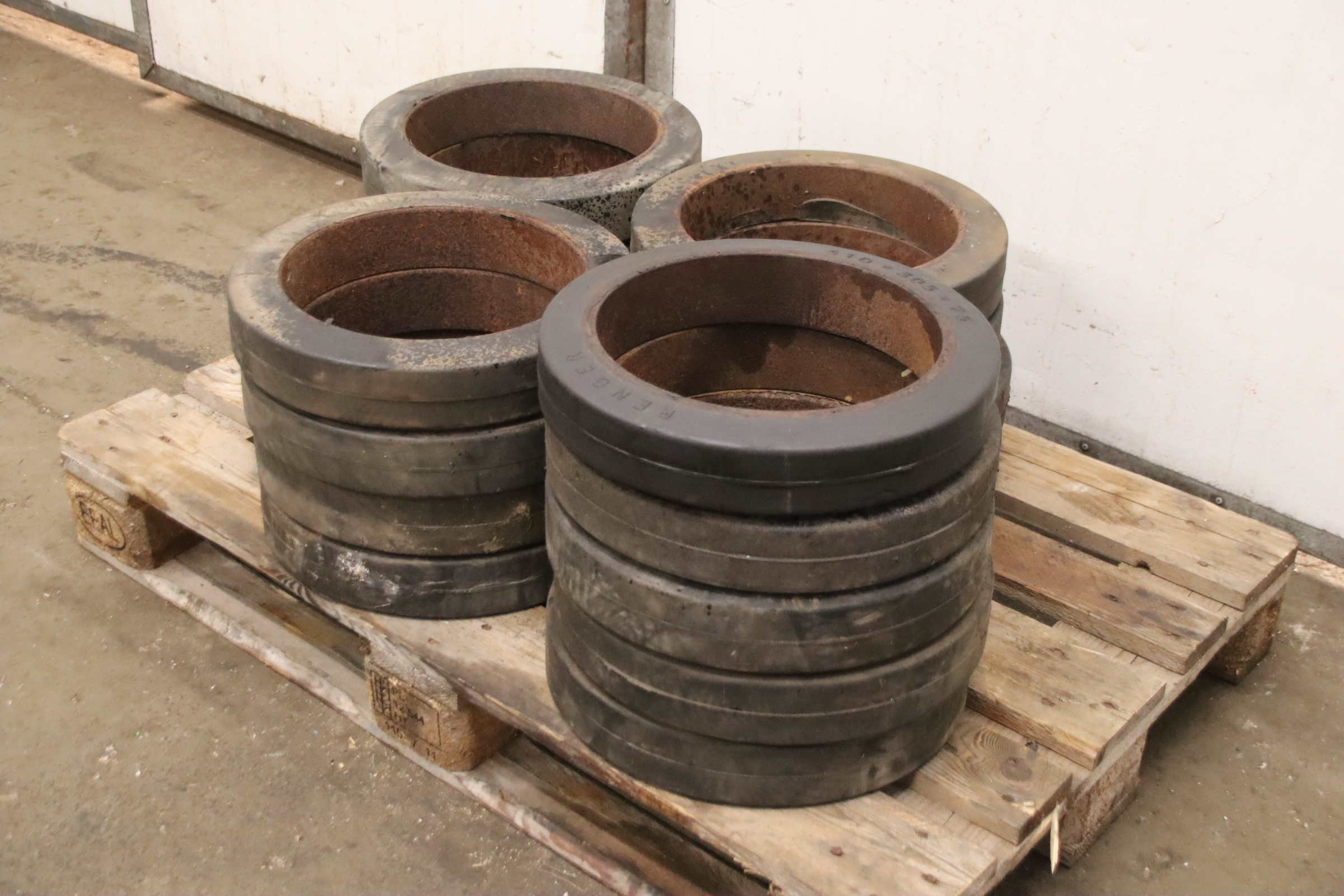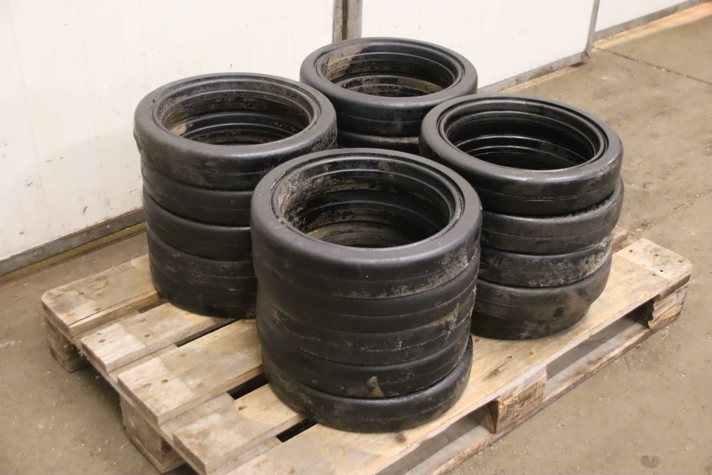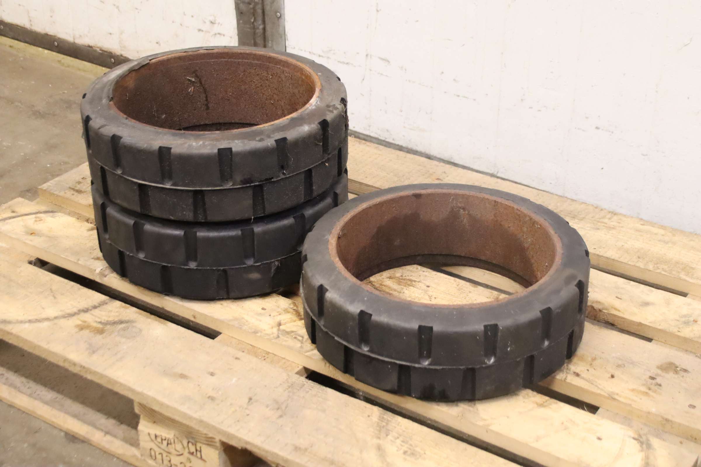 Tires, solid rubber tires, forklift tires, solid rubber bandages, solid rubber elastic bandages -Solid rubber tires: Solid rubber wheel, solid rubber bandage -Tire size: Ø 400 mm -Inner diameter: 276 mm -Quantity: 20 tires available -Price: per piece -Dimensions: Ø 400 x 78 mm -Weight: 5 kg/pc.