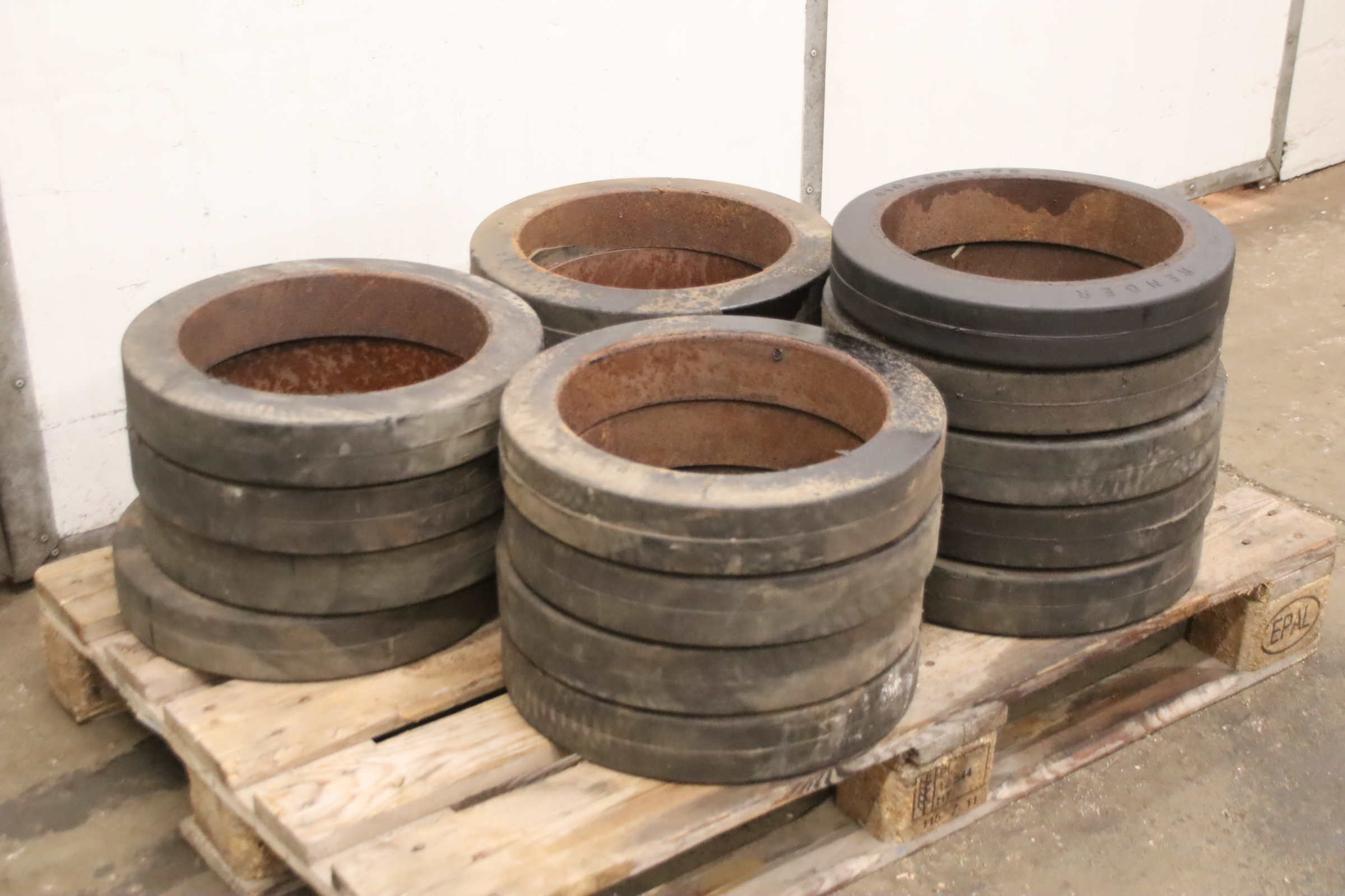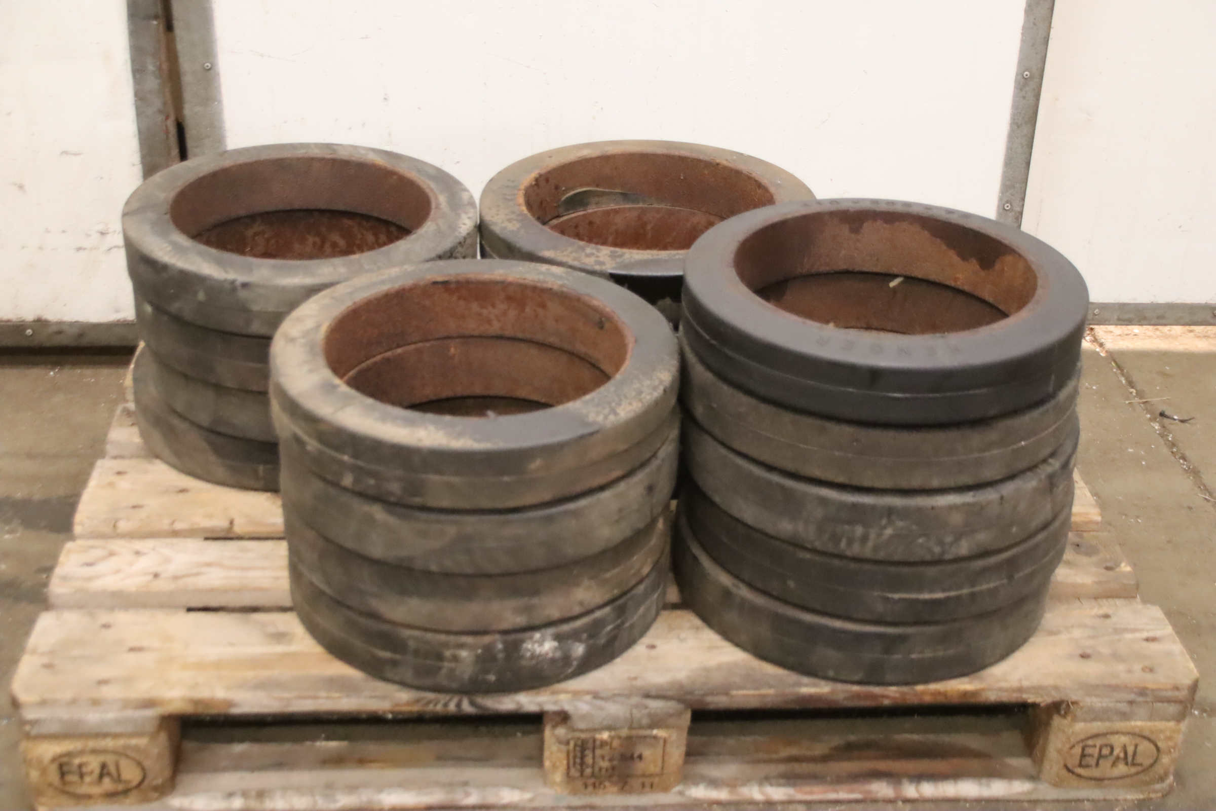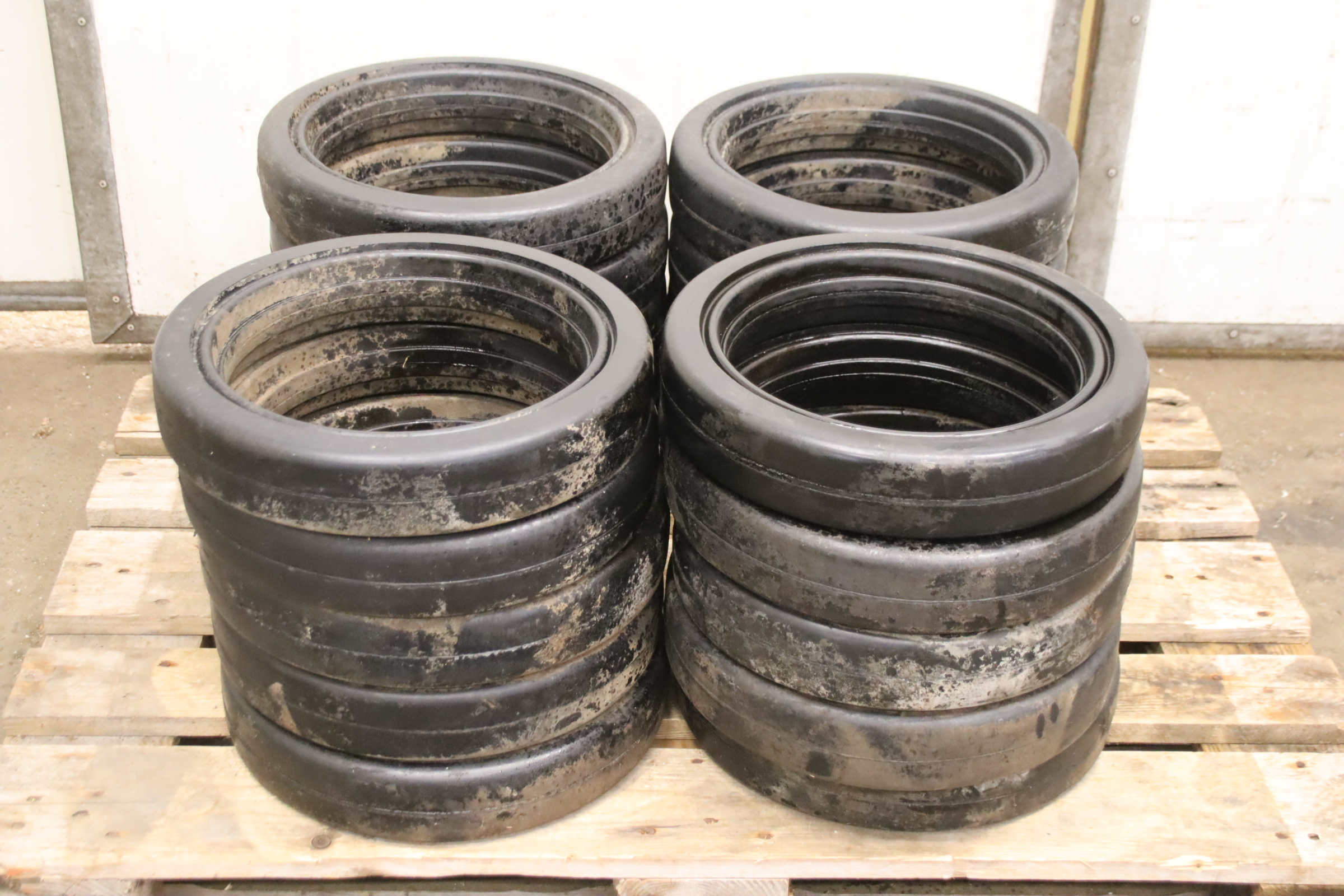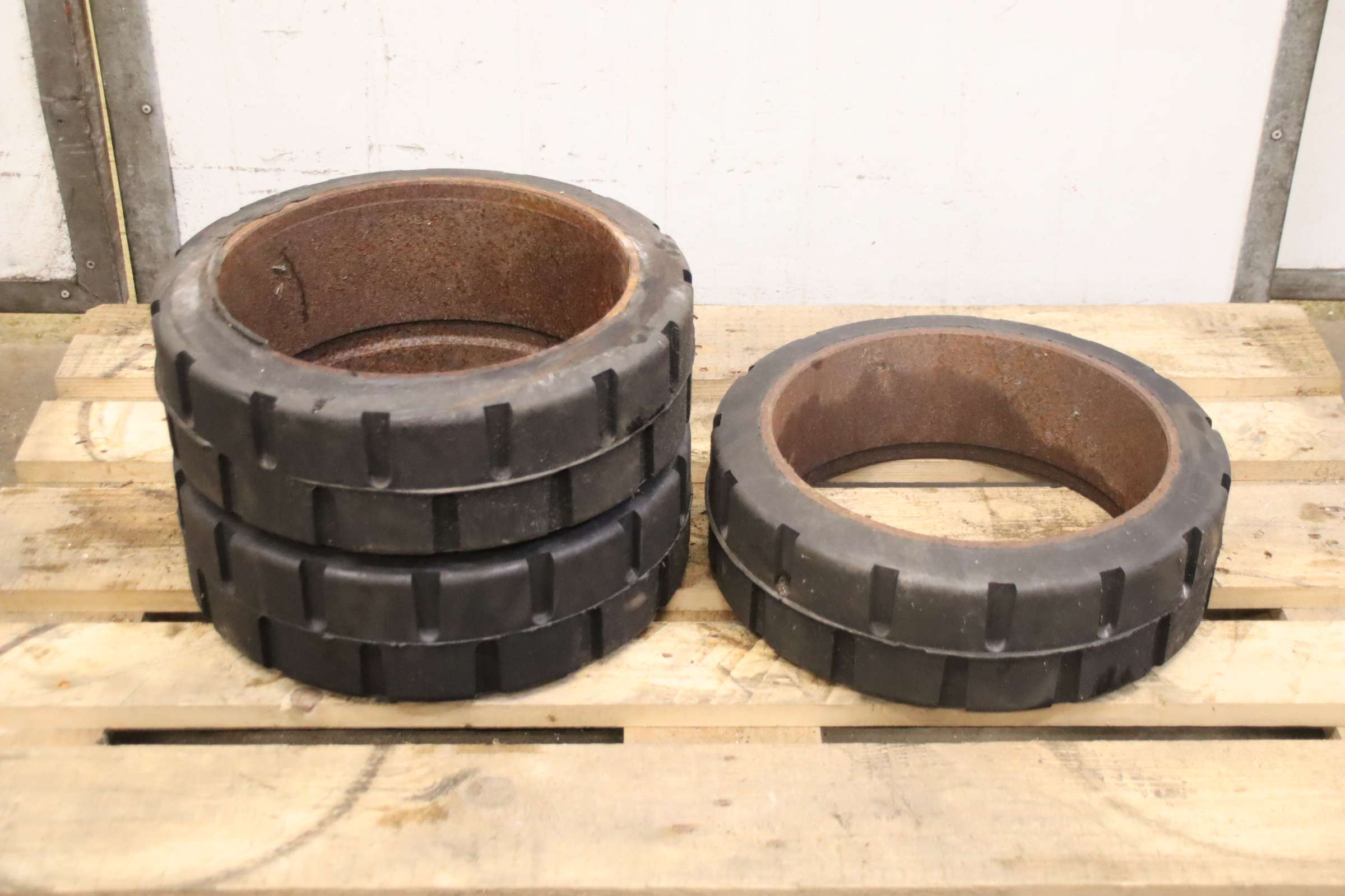 Tires, solid rubber tires, forklift tires, solid rubber bandages, solid rubber elastic bandages -Solid rubber tires: Solid rubber wheel, solid rubber bandage -Tire size: Ø 400 mm -Inner diameter: 276 mm -Quantity: 20 tires available -Price: per piece -Dimensions: Ø 400 x 78 mm -Weight: 5 kg/pc.