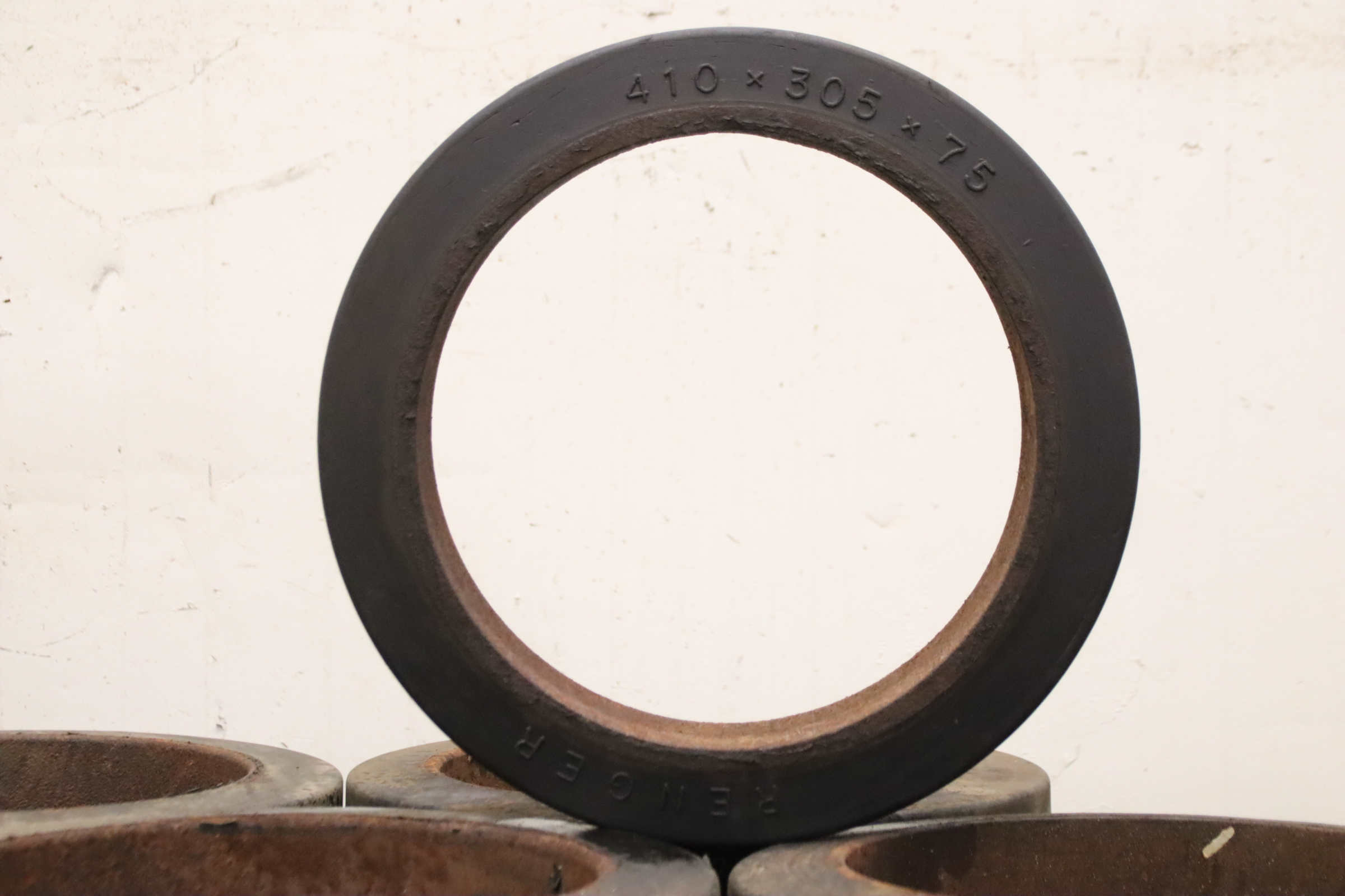 Tires, solid rubber tires, forklift tires, solid rubber bandages, solid rubber elastic bandages -Manufacturer: Renger, solid rubber tires, solid rubber elastic band with steel band -Tire size: 410x305x75 -Inner diameter: 305 mm -Number: 17 tires available -Price: per piece -Dimensions: Ø 410 x 75 mm -Weight: 11 kg/pc.