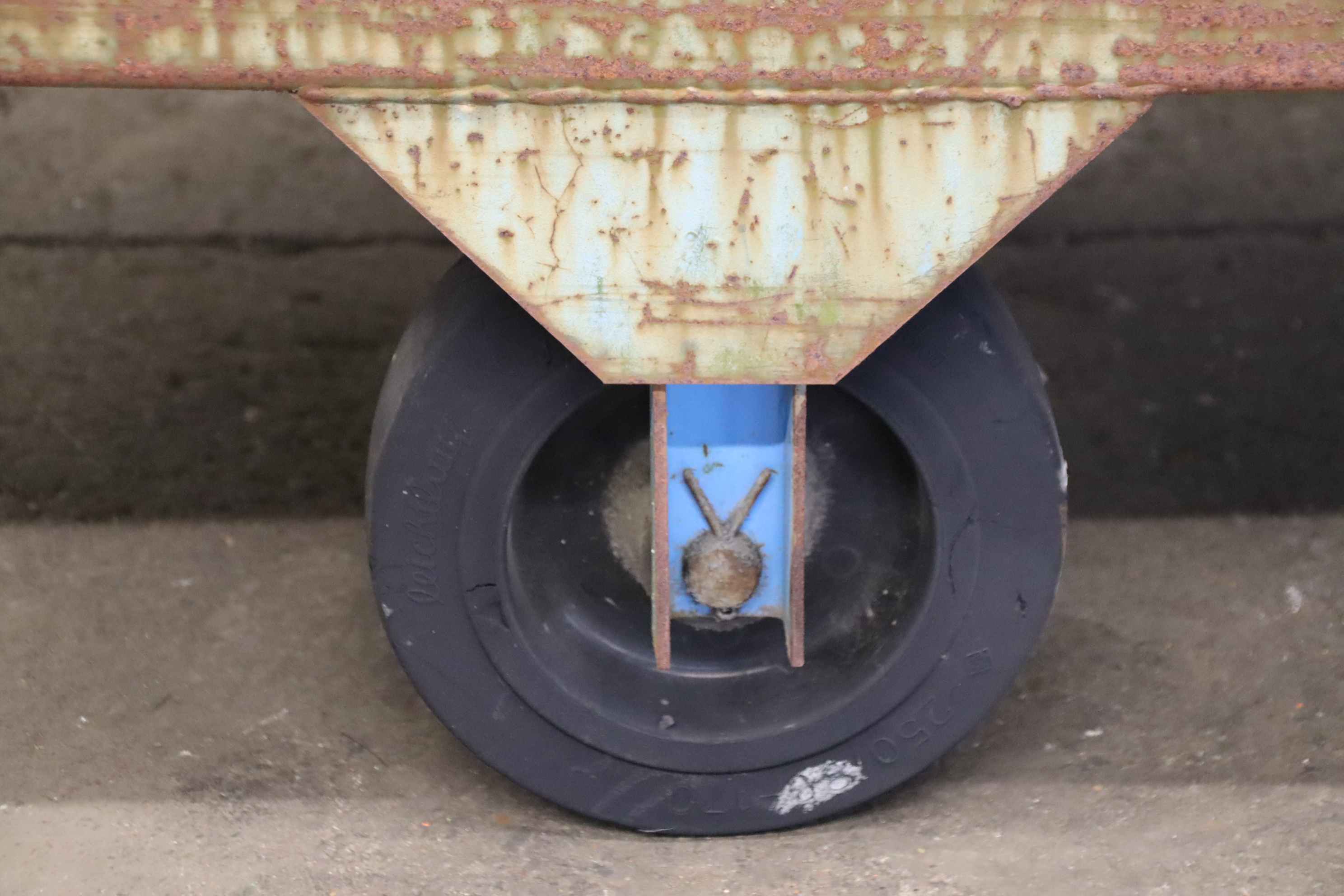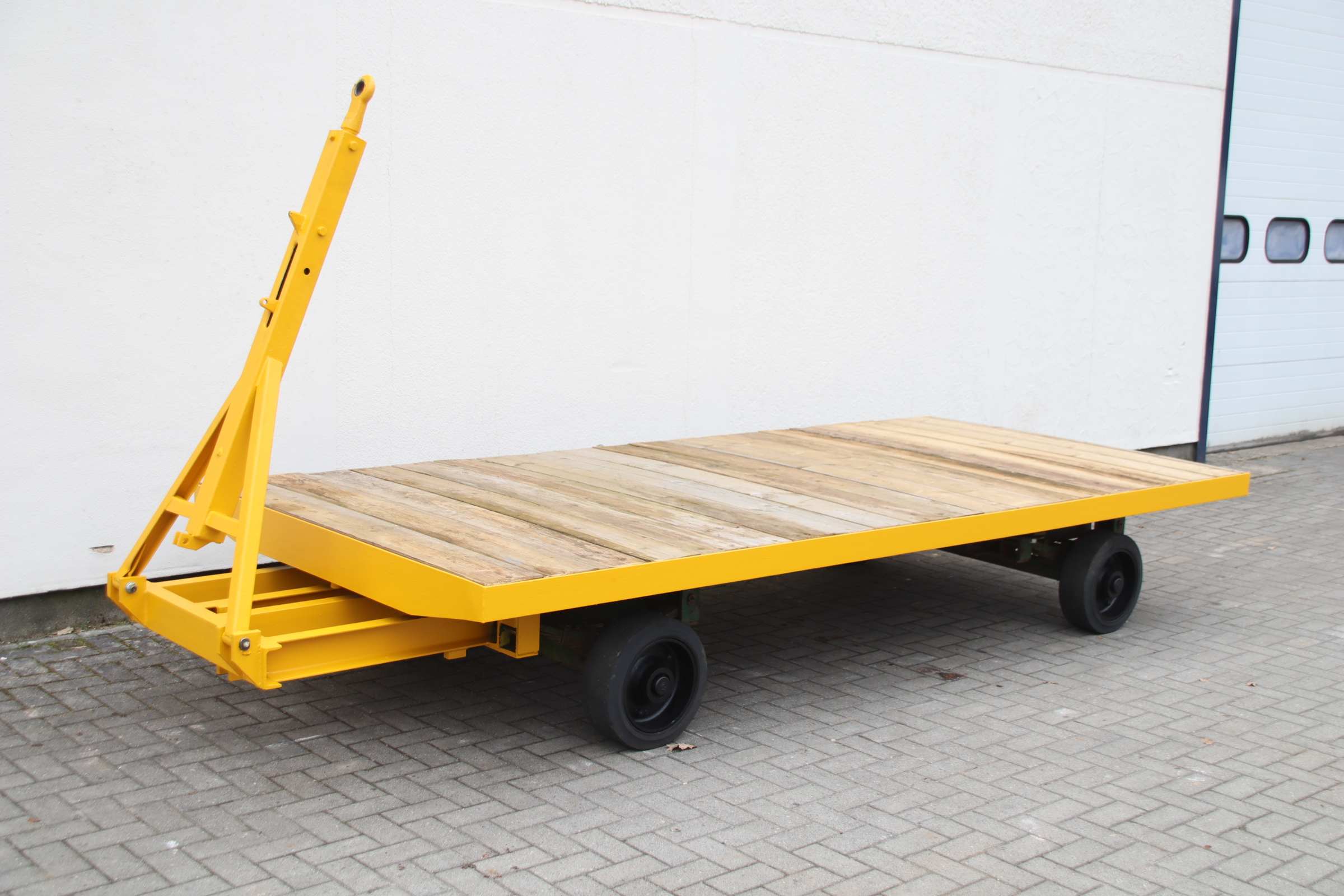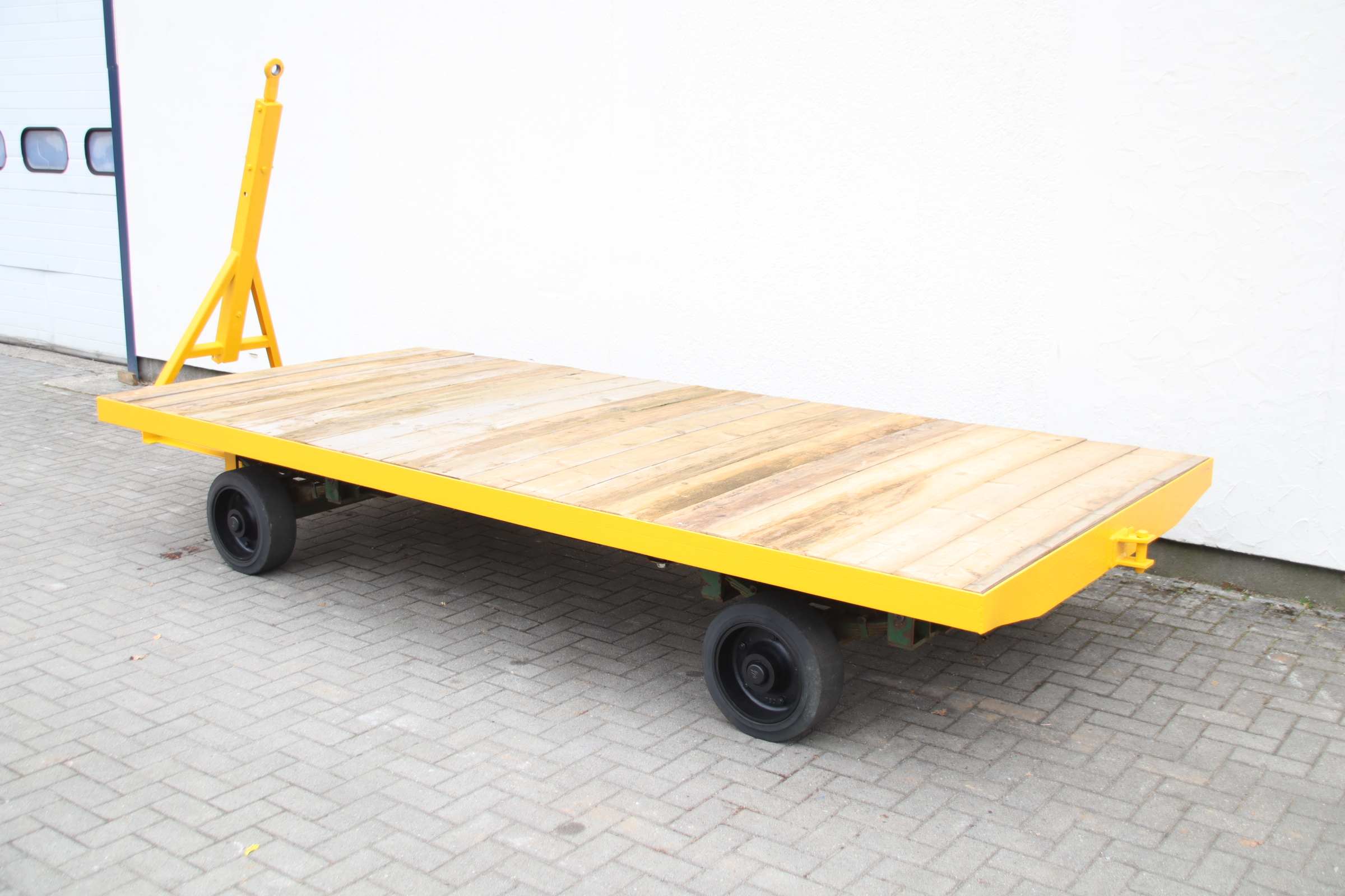 Platform trolleys, transport trolleys, heavy-duty trolleys, table trolleys, assembly trolleys, industrial trailers -Industrial trailer with: 1-axle turntable steering -rotating platform: 3460 x 2700 mm -4 roller conveyors, rollers: Ø 65 x 365 mm -Load capacity: max. 7000 kg -Tires: solid rubber -Trailer hitch -External dimensions: 5530/2700/H590 mm -Own weight: 1410 kg