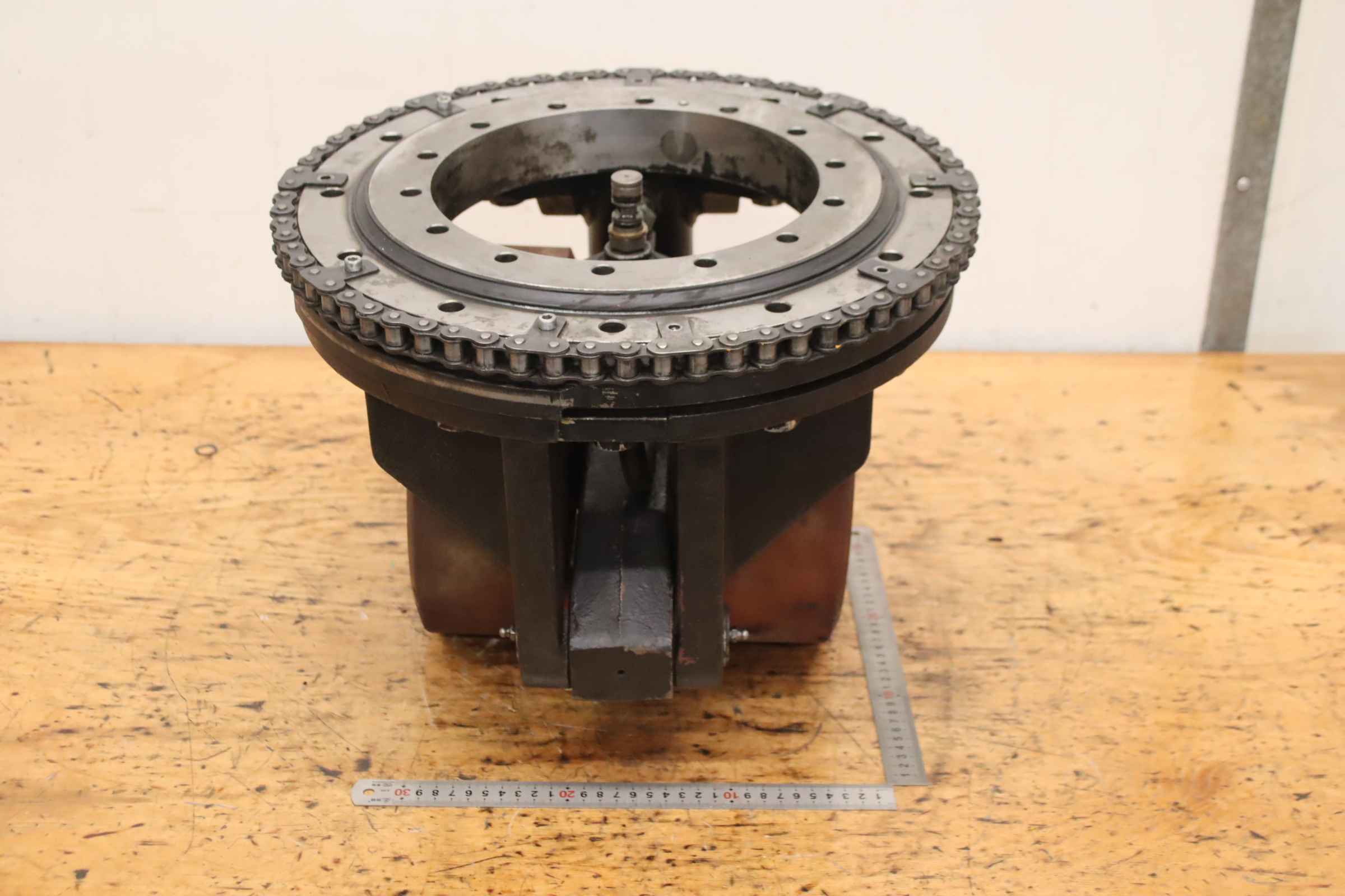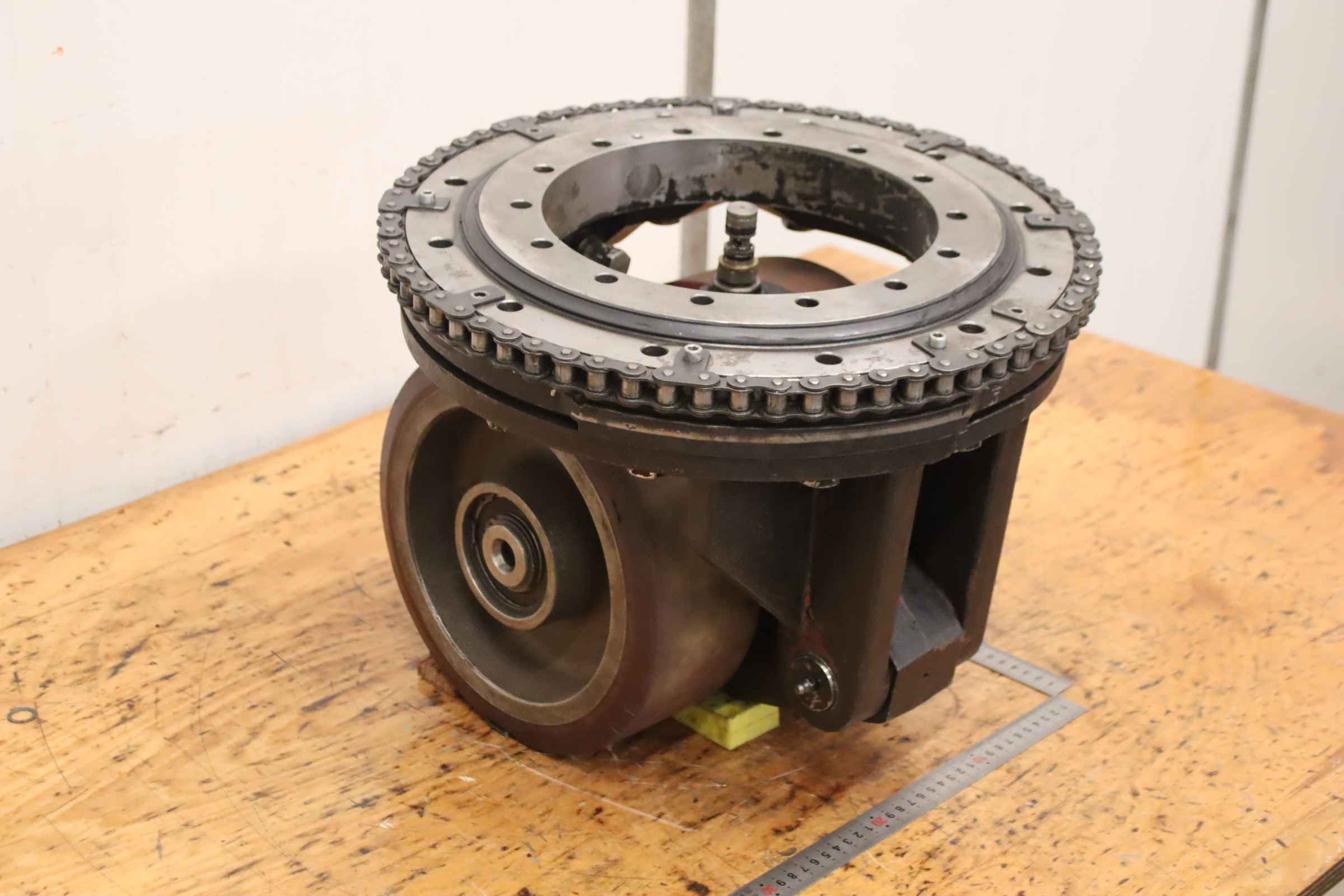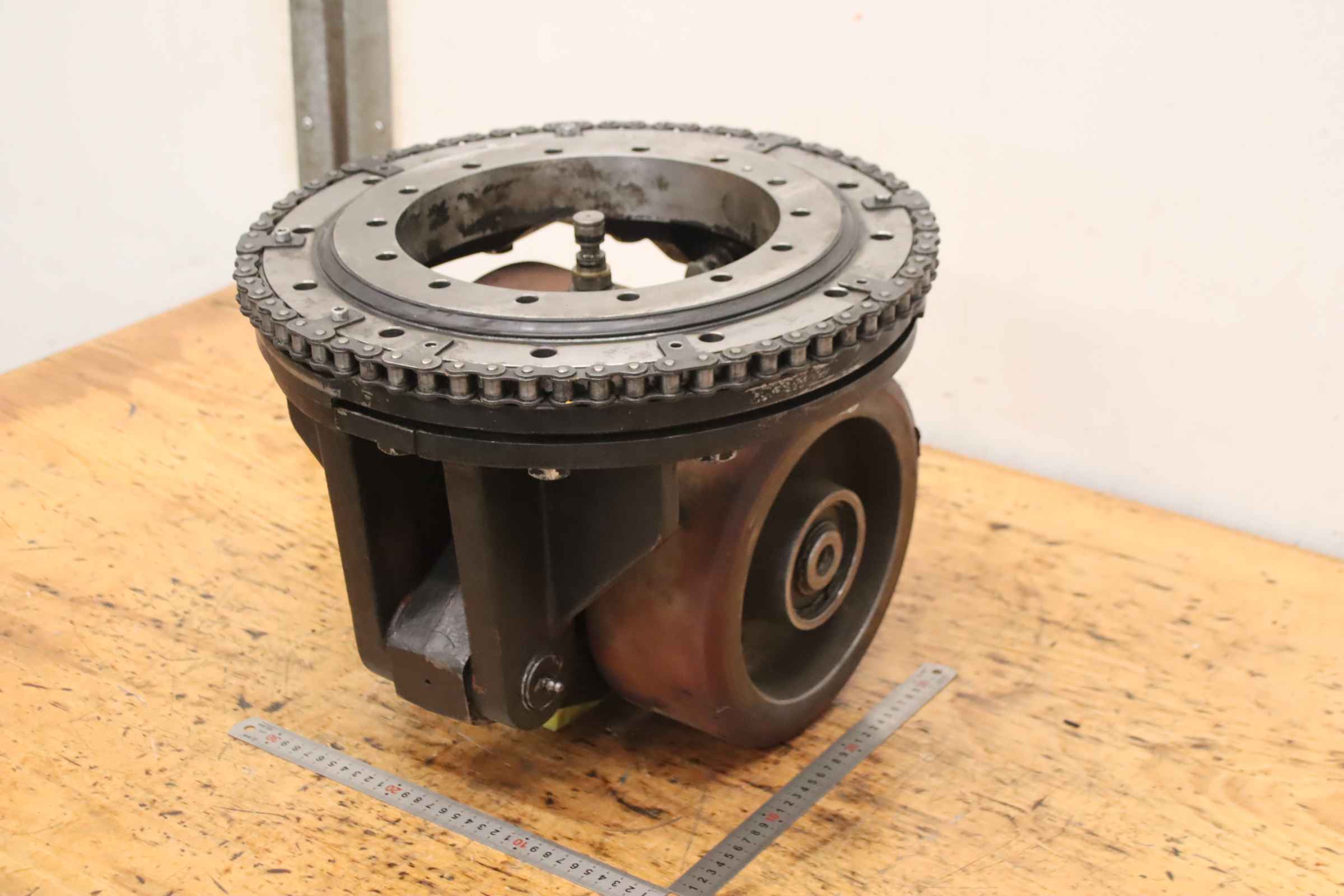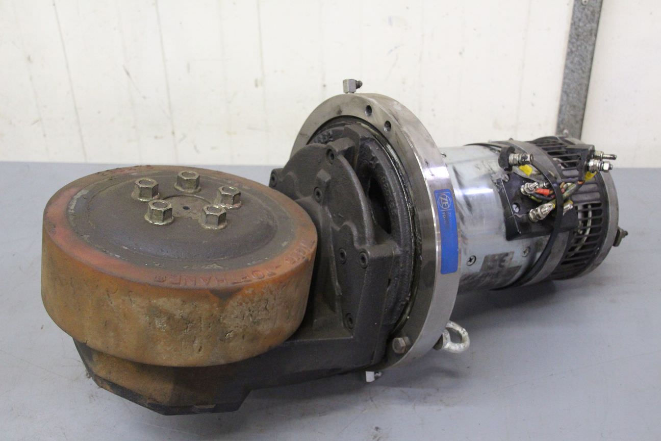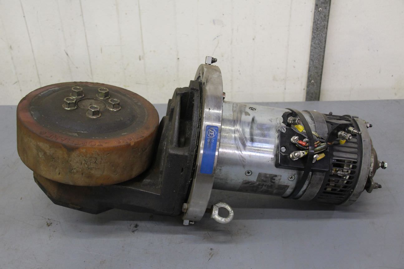 Chassis, electric motor, DC motor, traction motor, drive motor -Manufacturer: Baumann, chassis forklift T 25 -Gearbox: Hurth HFP 50 -Wheels: Ø 380 x 180 mm -Individual components: see photos -Price/Delivery: complete -Transport dimensions: 440/400/H500 mm -Total weight: 179 kg