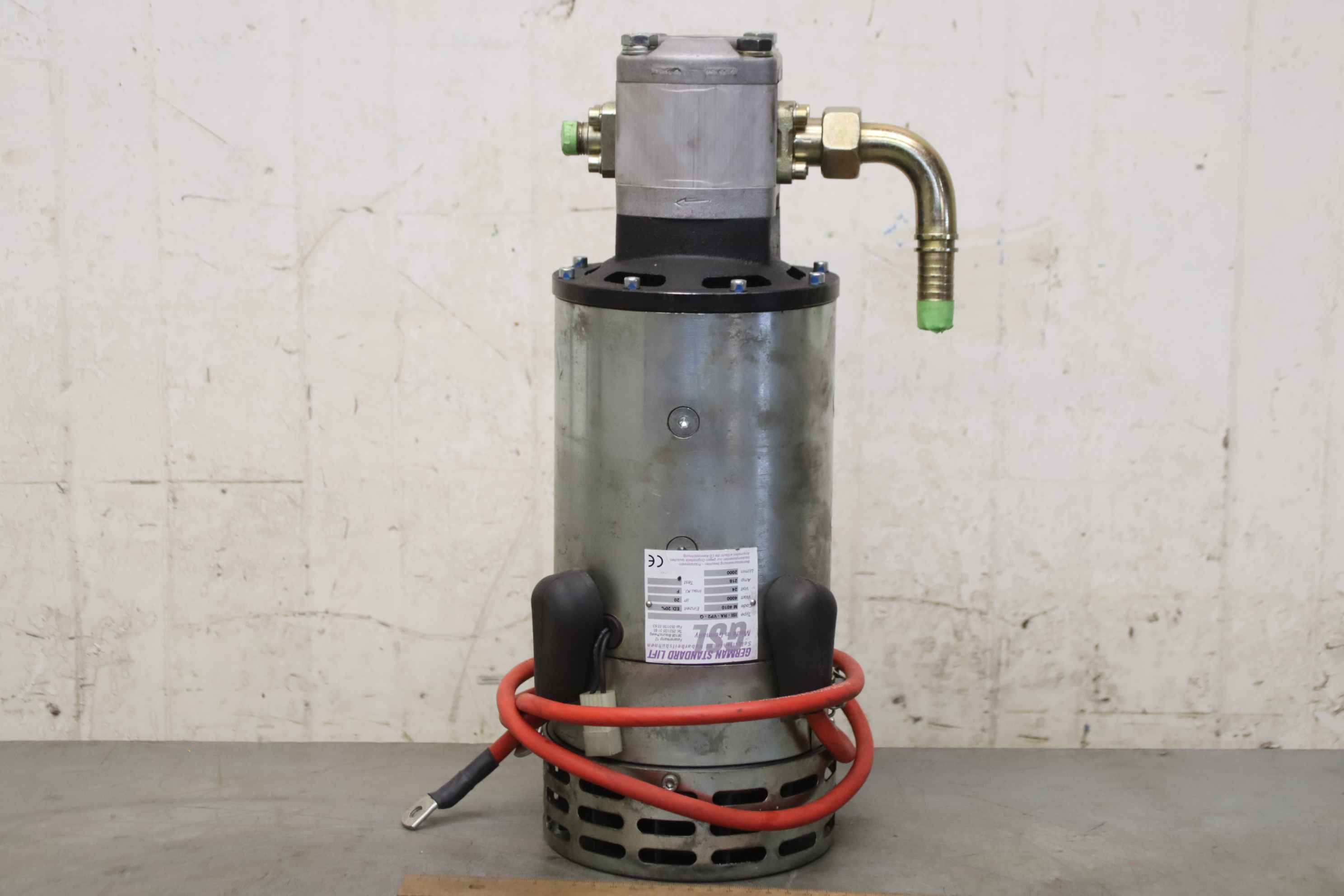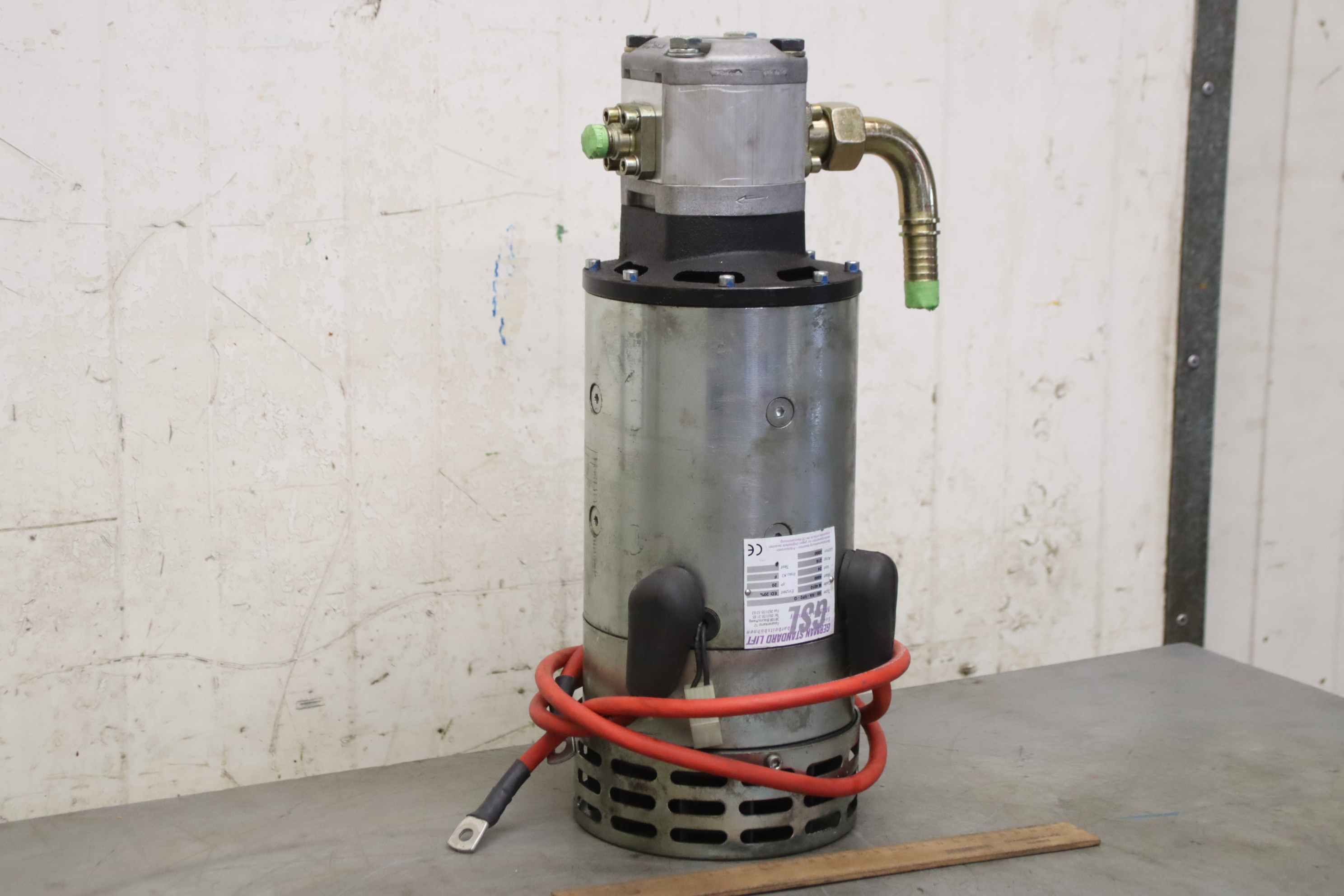 Hydraulic pump, hydraulic unit, hydraulic pump, hydraulic pump, electric motor, DC motor, traction motor, drive motor, hydraulic gear pump-Manufacturer:GSL, hydraulic pump from aerial work platform-Electric motor: GSL type IS1-RA-VP2-Q 24 volts / 4000 watts-Hydraulic pump: Marzocchi 2BK7 S 6-Dimensions: 220/160/H440 mm-Weight: 26 kg