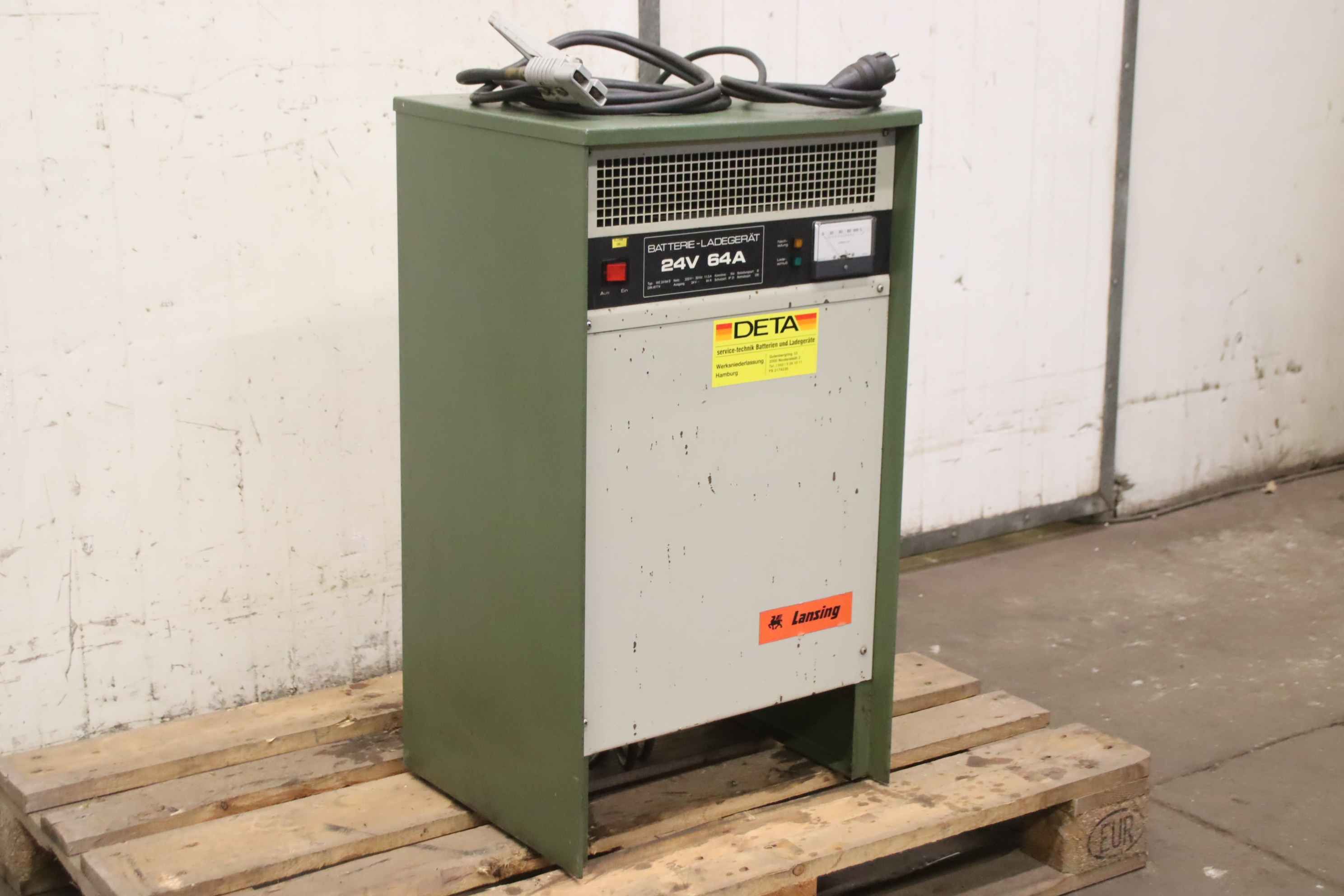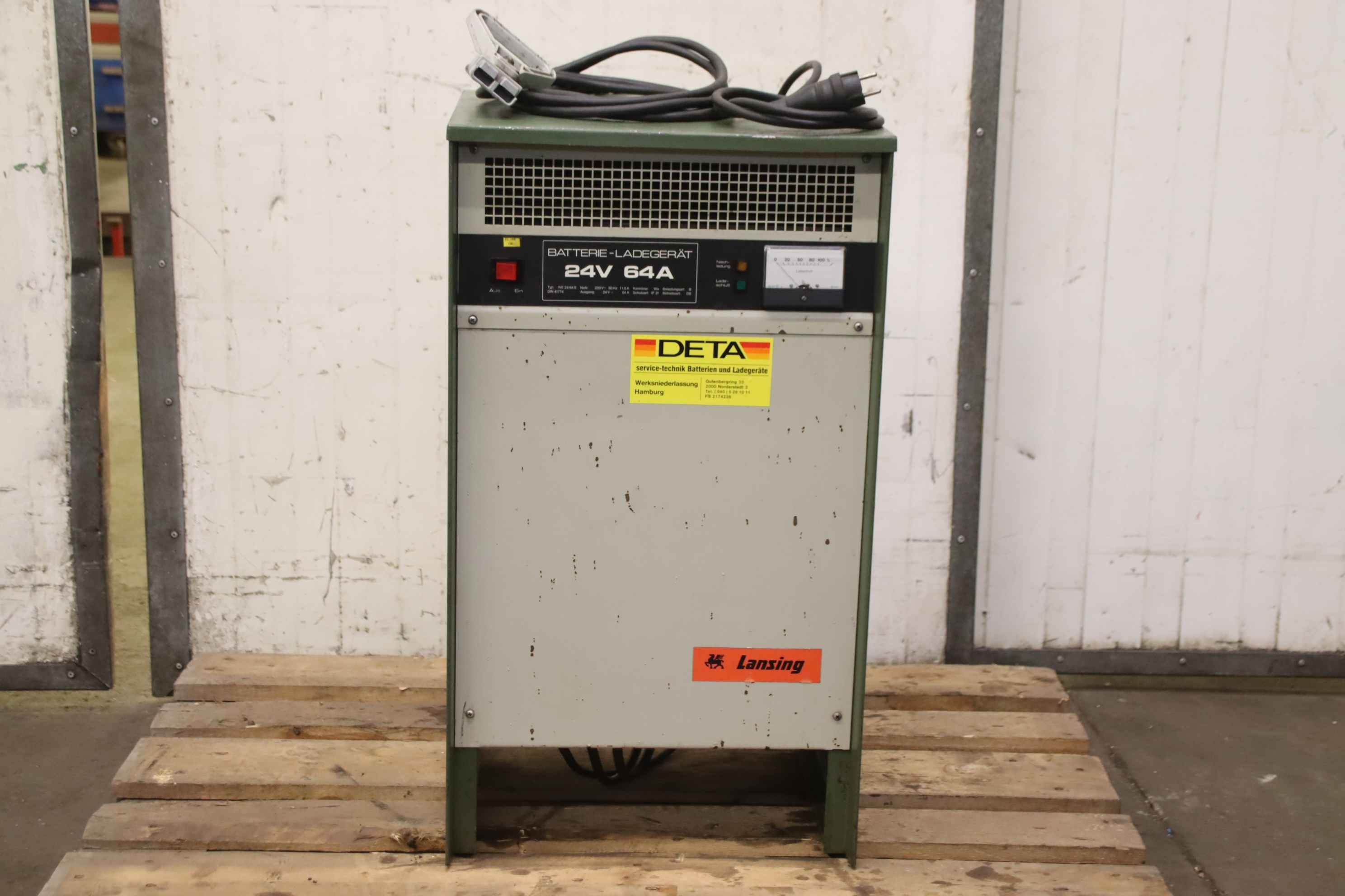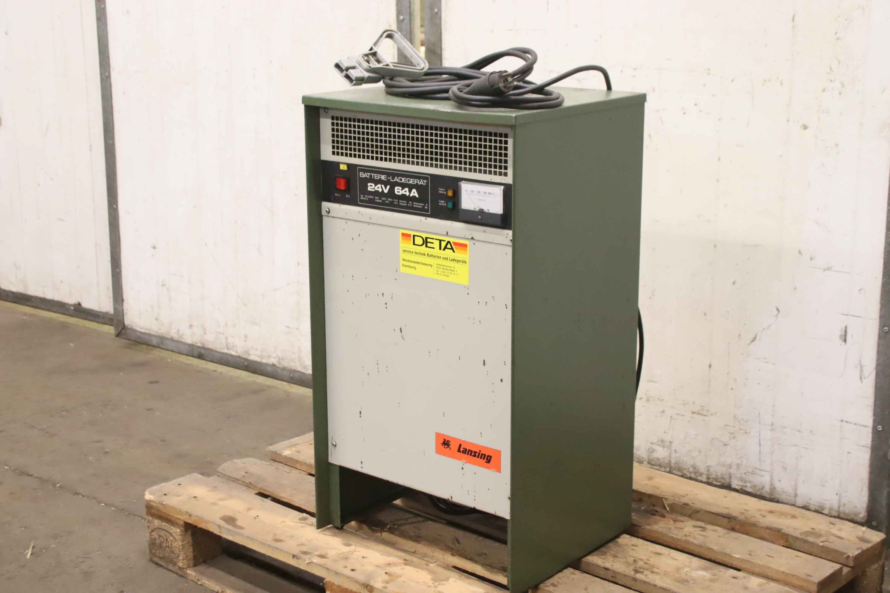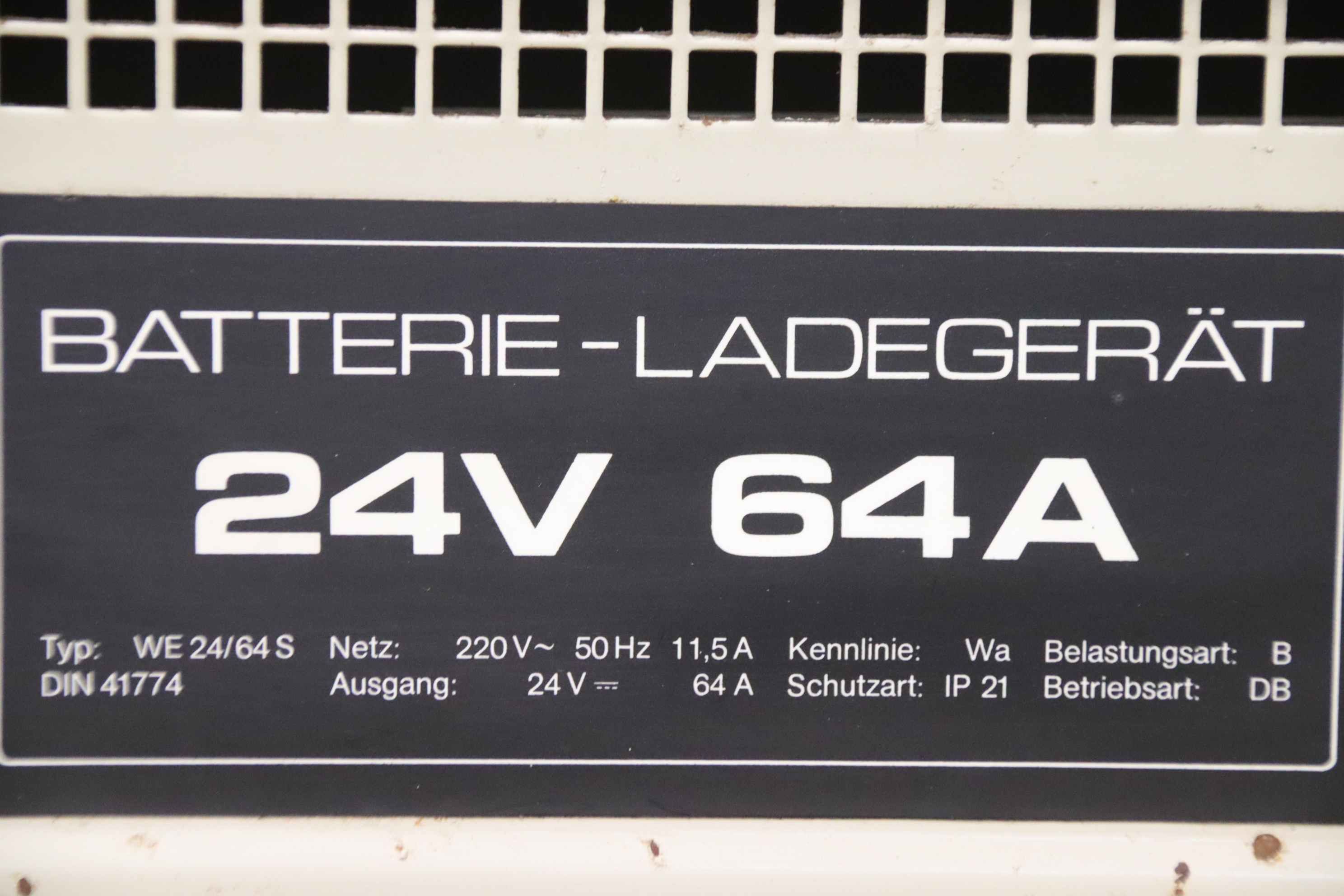 Forklift battery charger, industrial charger, Forklift battery charger, industrial charger, Si rectifier-Manufacturer: DETA, charger type WE 24/64 S-Input voltage: 220 V 50 Hz-Power: 24 V/64 A-Dimensions: 455/380/H810 mm-Weight: 51 kg