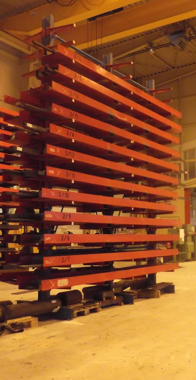 Cantilever racking, heavy-duty racking -without insert trays: none available -Double-sided -consisting of: -Shelf: with 3 uprights each, height 5.4 m -Support arms, double-sided: 500 mm long -Brack load capacity: 795 kg -Load capacity per side: max. 7000 kg -screwed -Number: 4 shelves available -Price: per piece -Empty weight: 1250 kg/piece