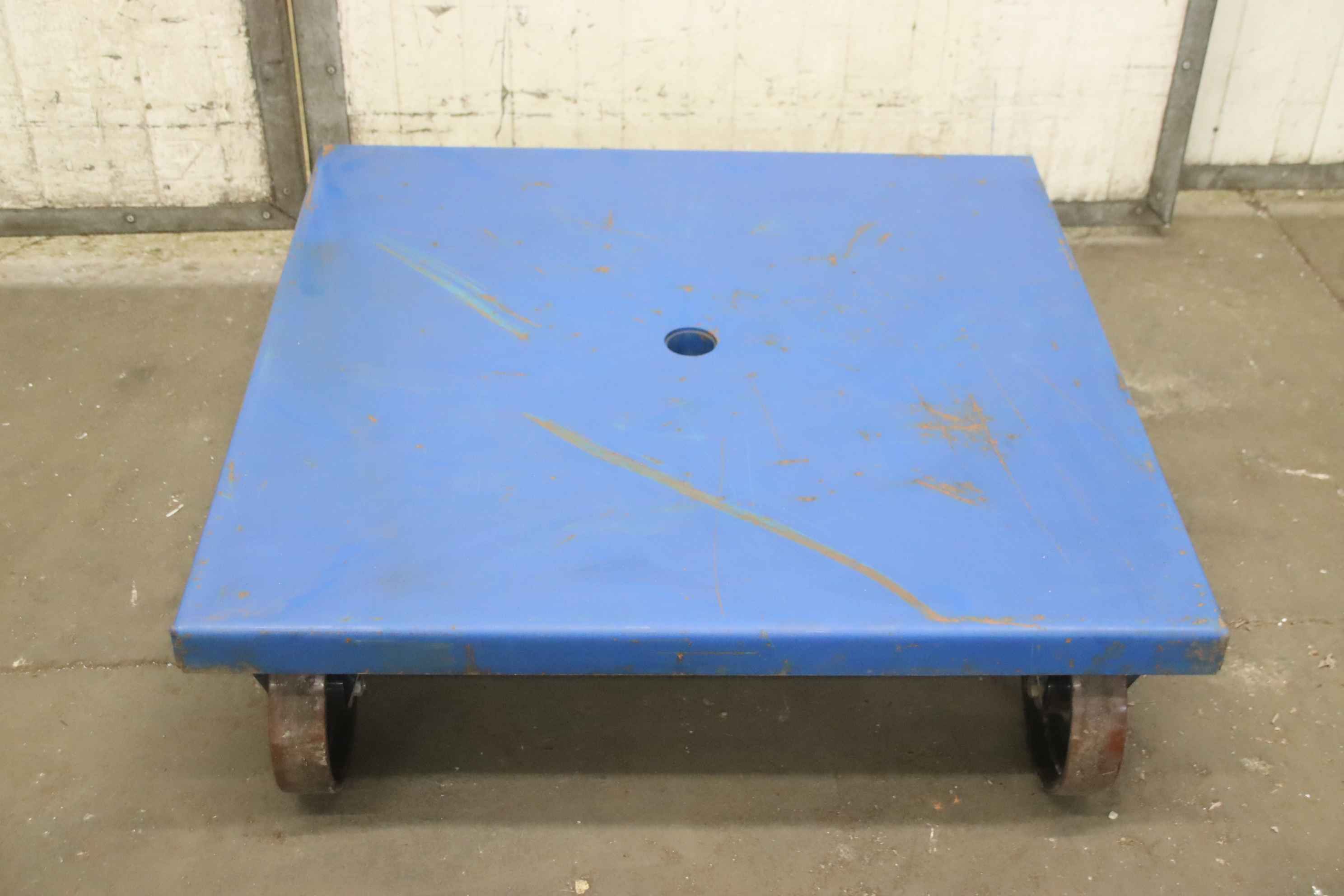 Platform trolleys, transport trolleys, heavy-duty trolleys, table trolleys, assembly trolleys-Transport trolley: with steel plate-Platform: 900 x 900 mm with hole Ø 50 mm-Design: 2x swivel castors with brake, 2 fixed castors-Load capacity: kg-External dimensions: 900/900/H255 mm-Own weight: 62 kg